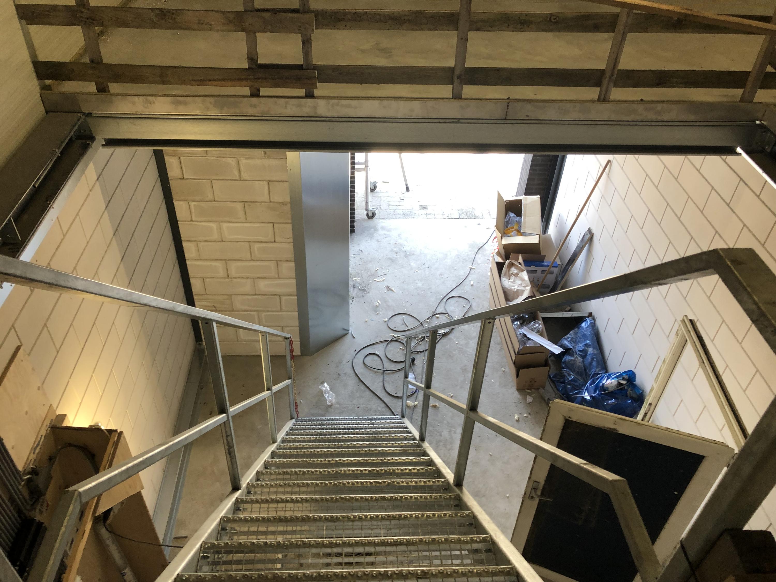Hierachter is een trap naar de 1e etage en een goederen lift voor de spullen.