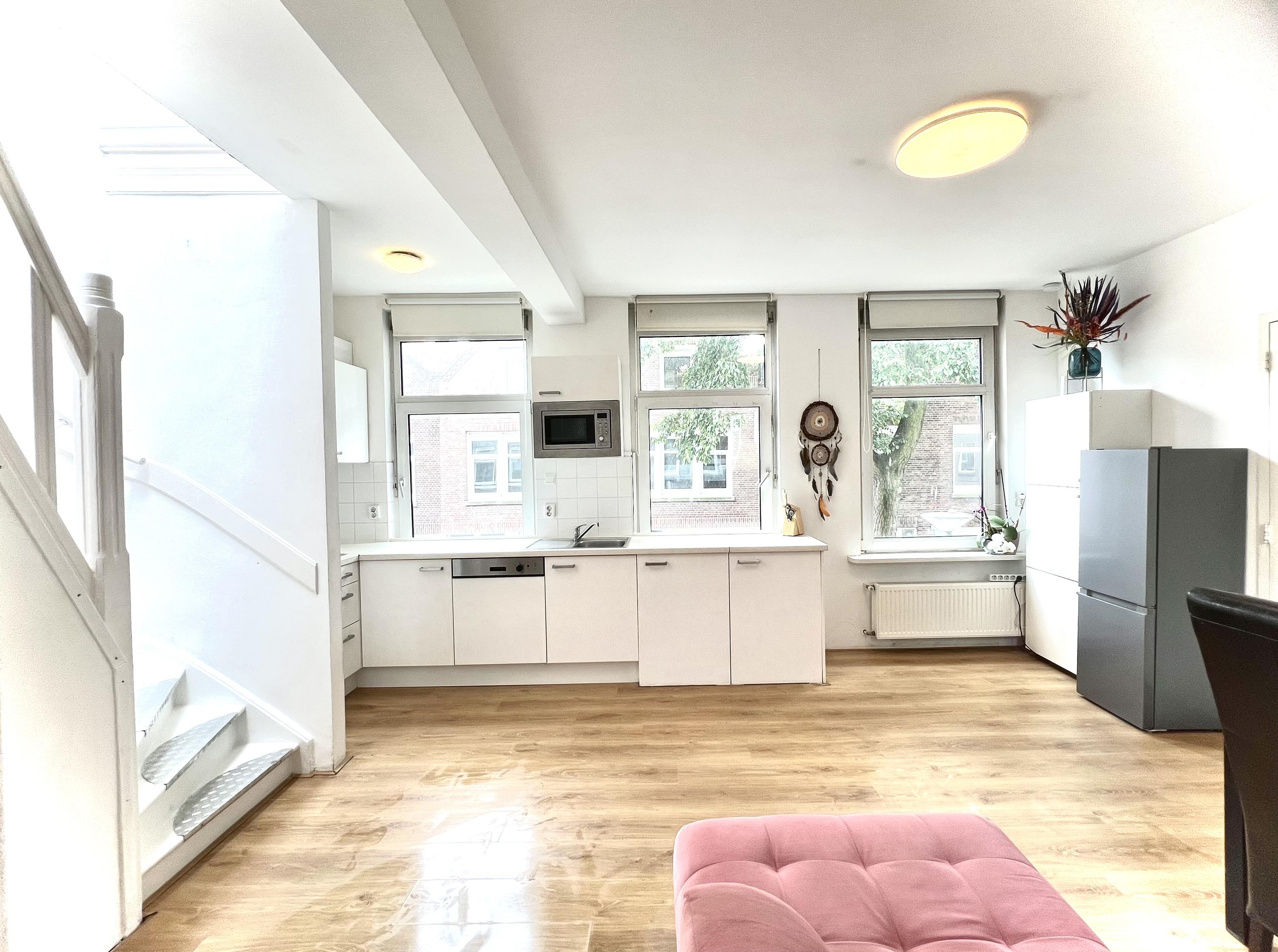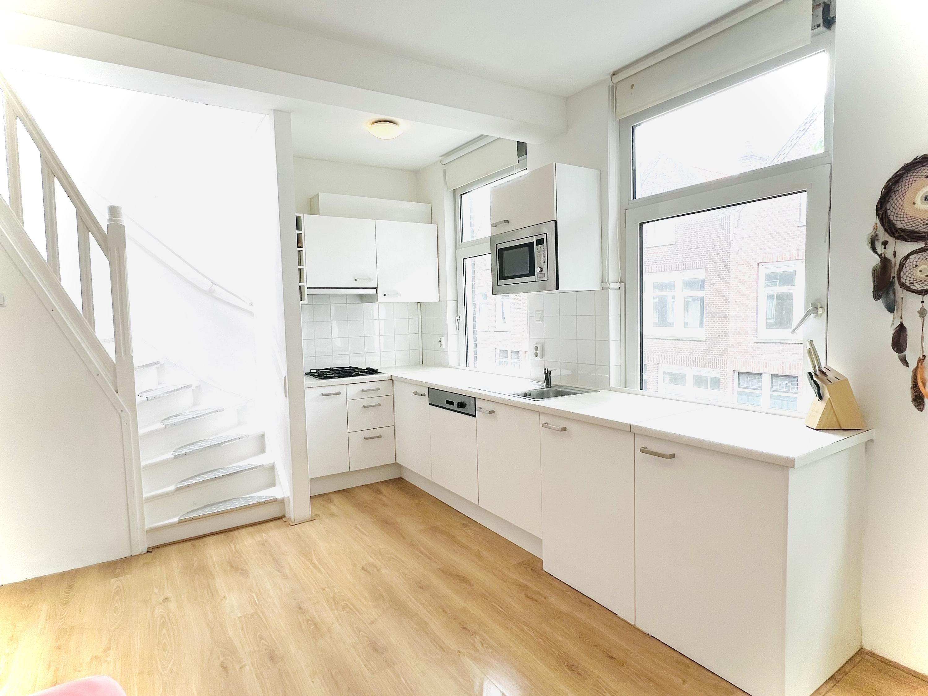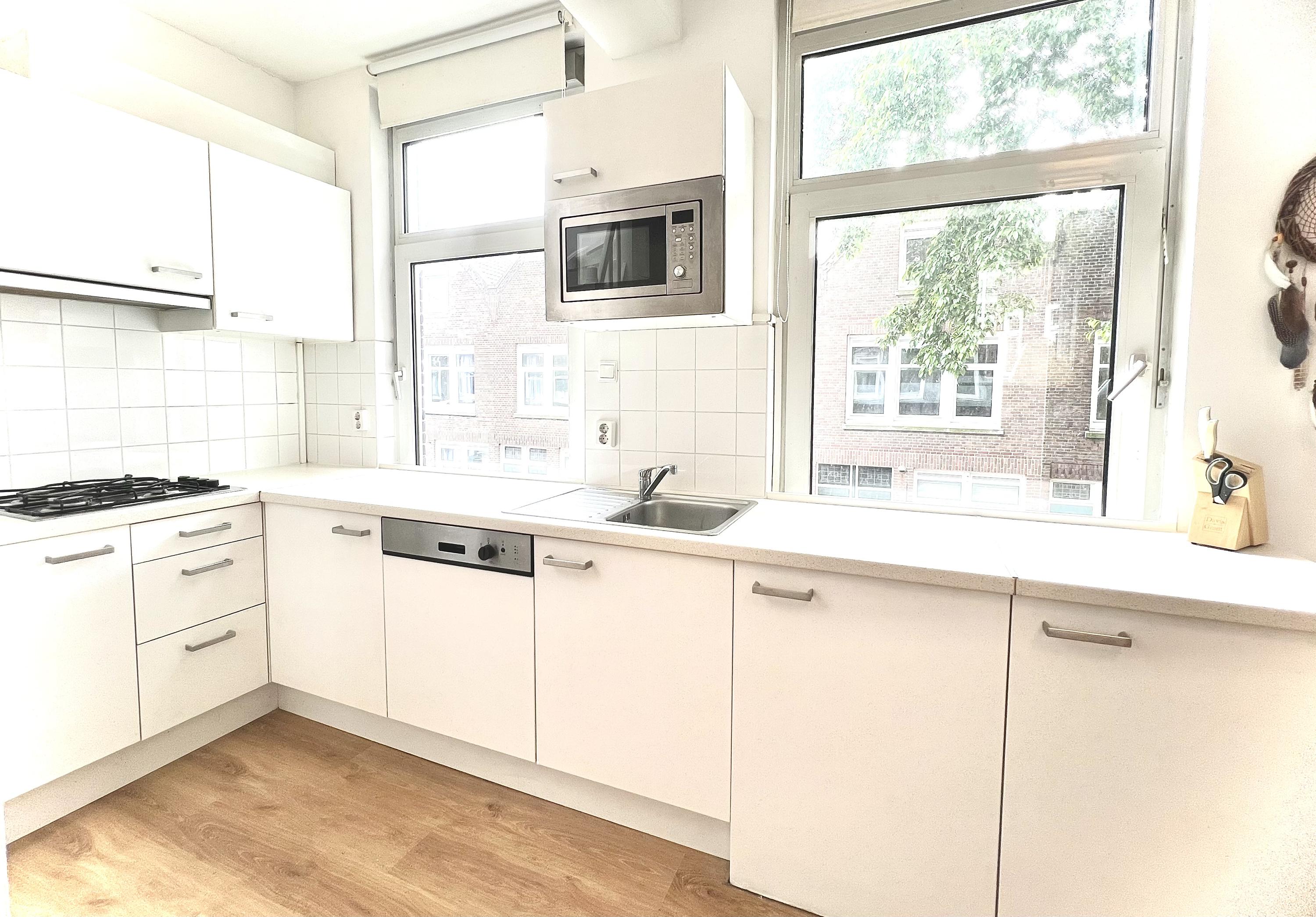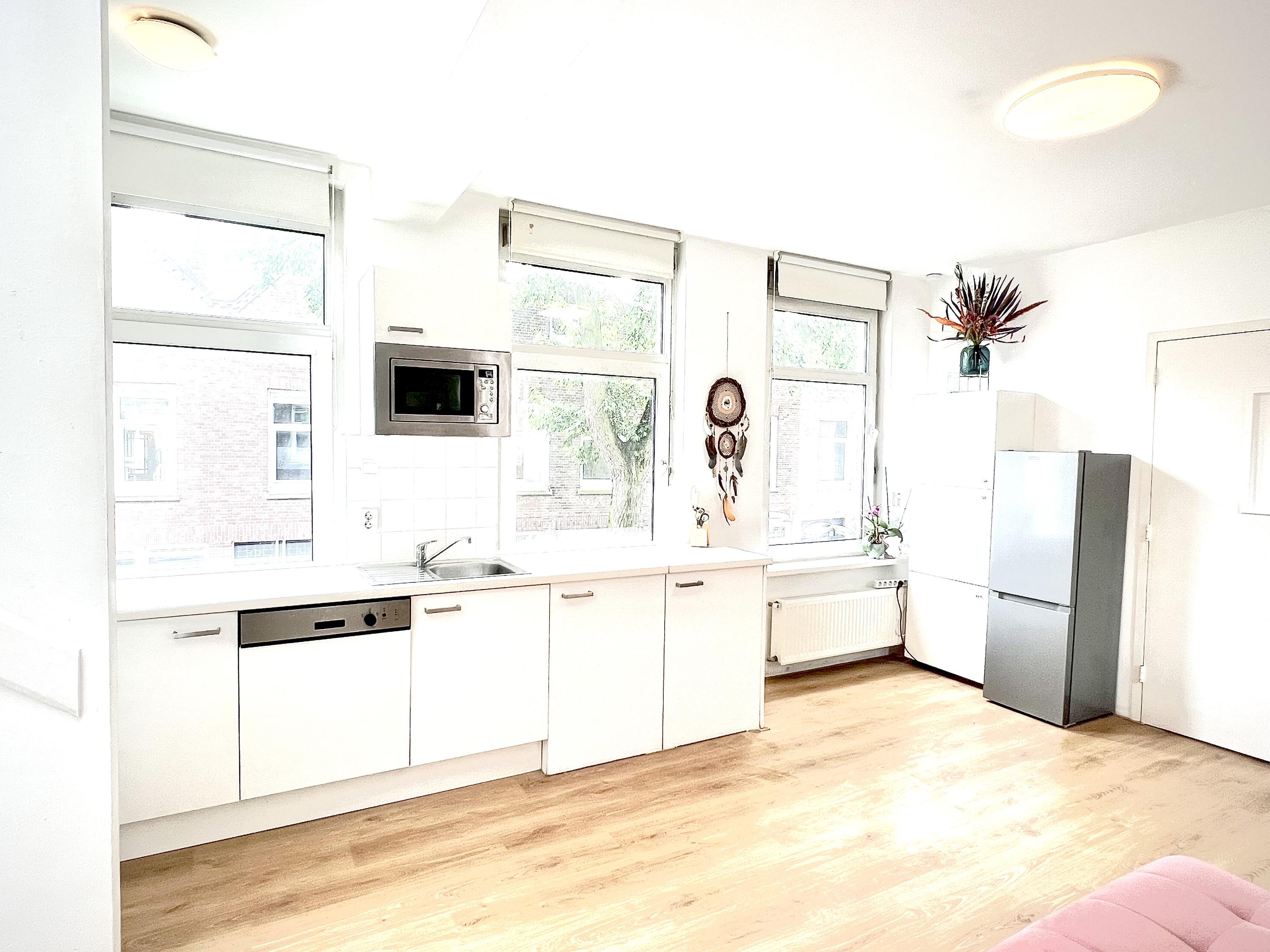 Hier bevindt zich de lichte, open woonkeuken die compleet is ingericht met onder andere een koelkast, vriezer, magnetron, vaatwasser en gasfornuis. Een fijne plek om te koken, te eten en samen te zijn.