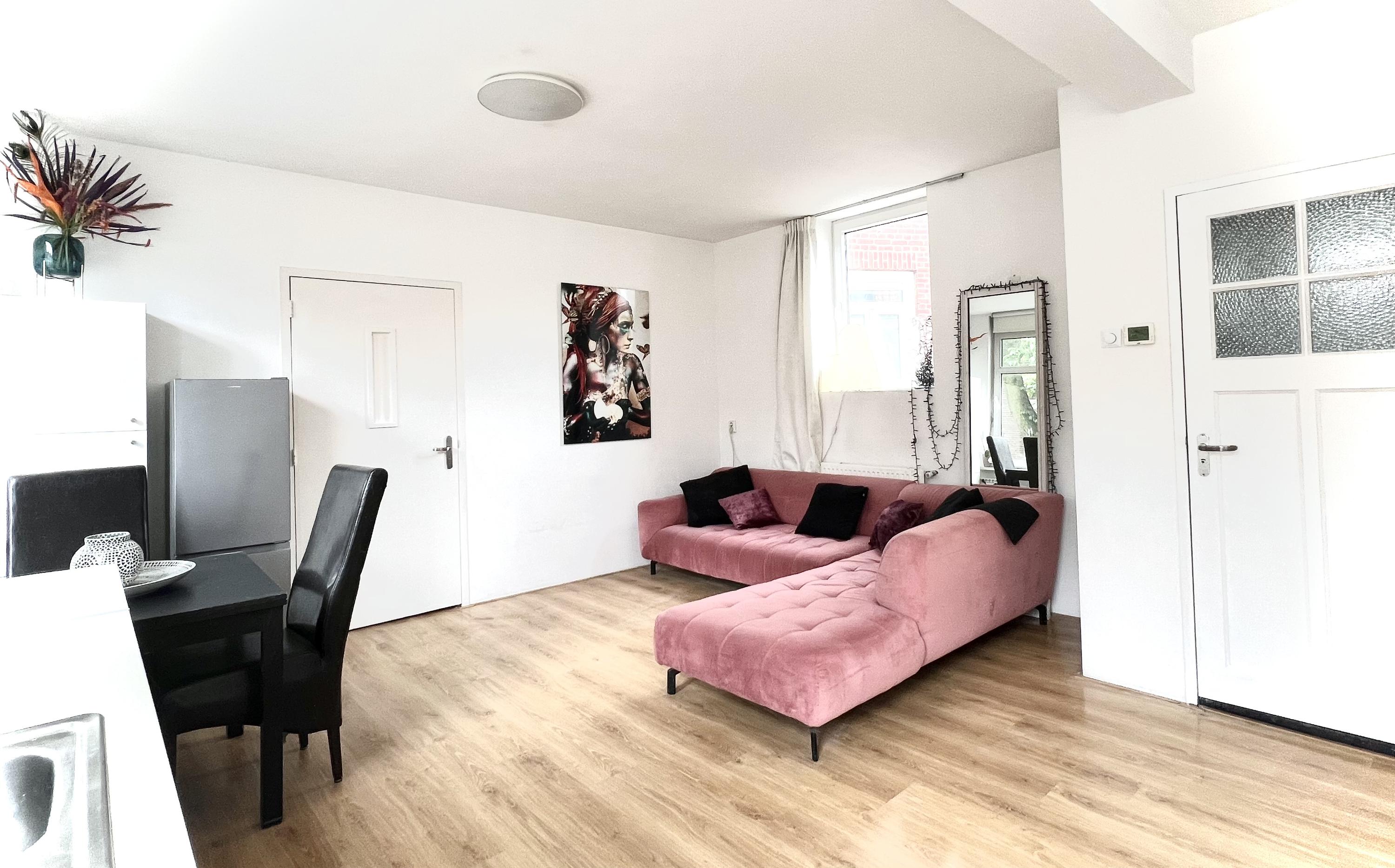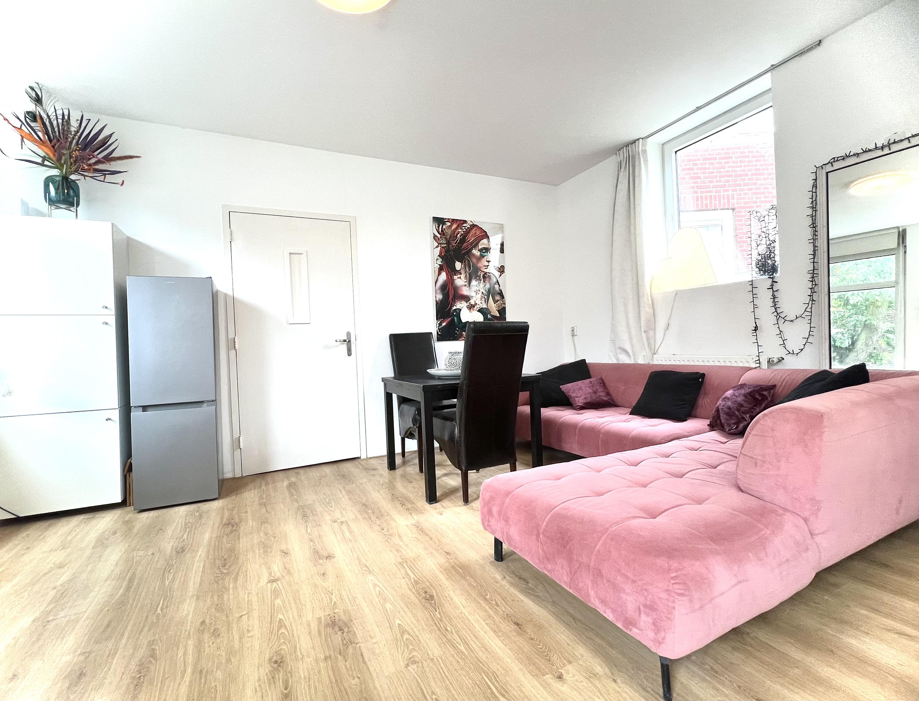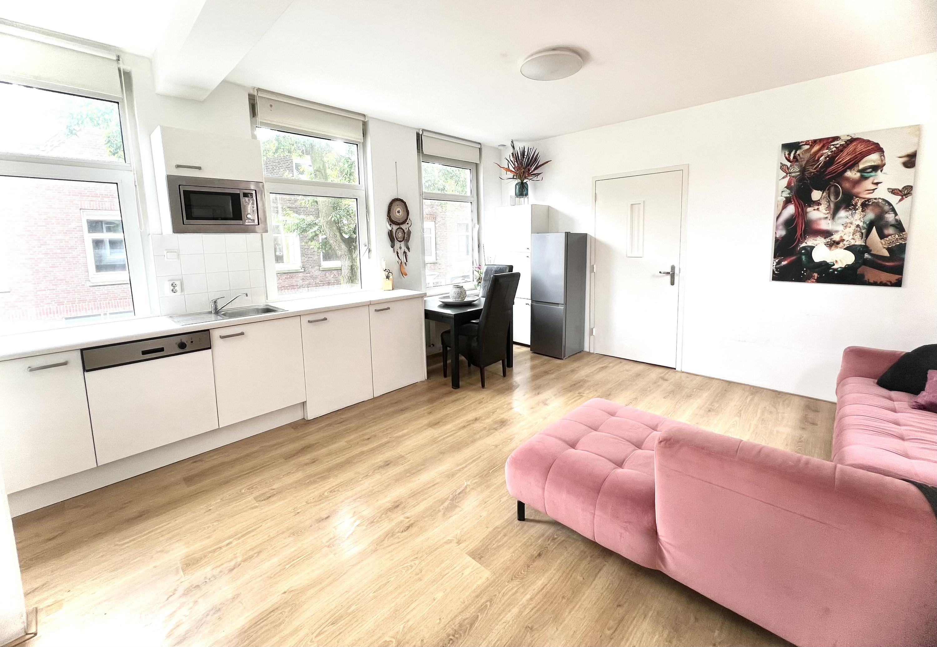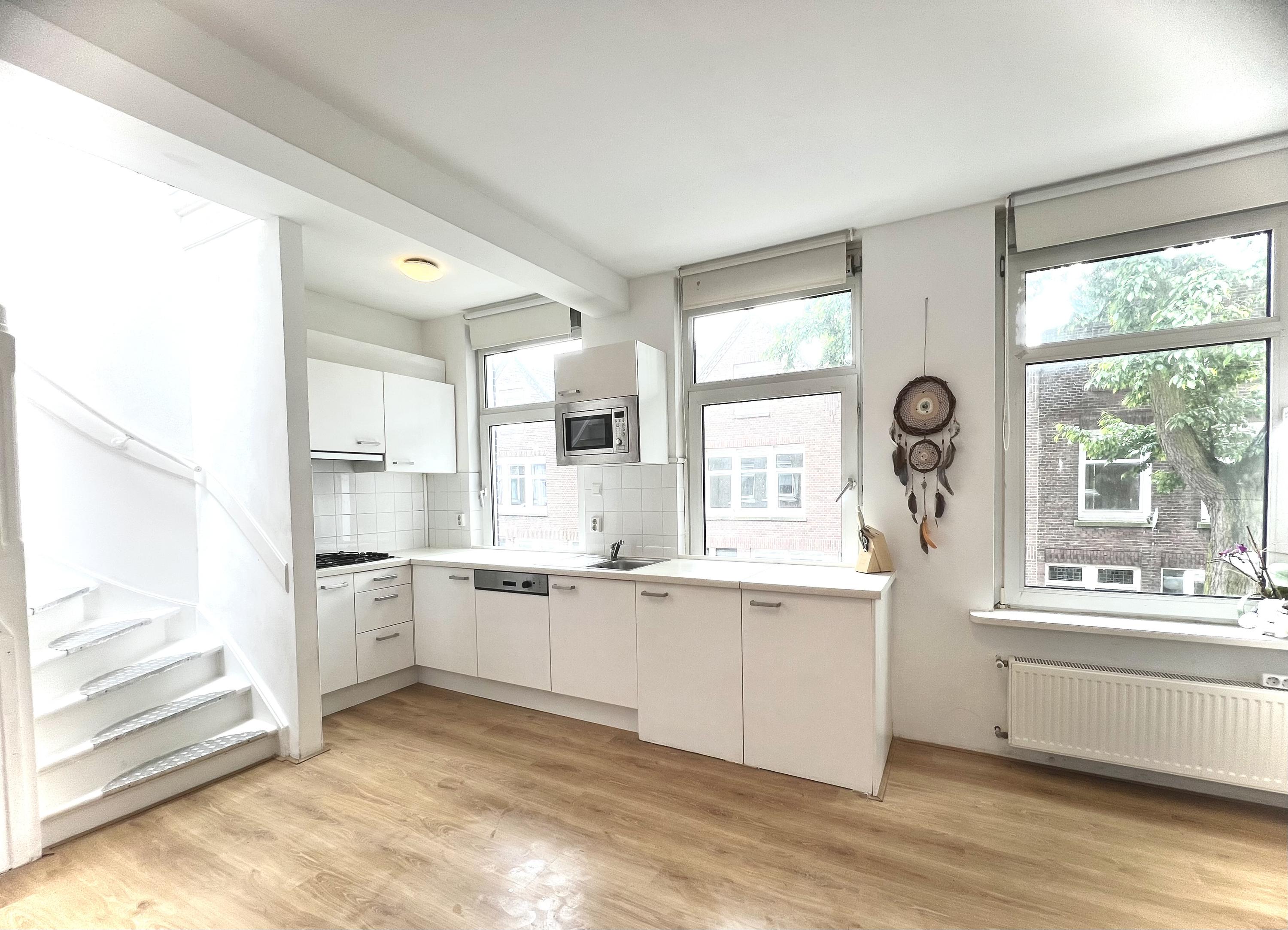 Hier bevindt zich de lichte, open woonkeuken die compleet is ingericht met onder andere een koelkast, vriezer, magnetron, vaatwasser en gasfornuis. Een fijne plek om te koken, te eten en samen te zijn.