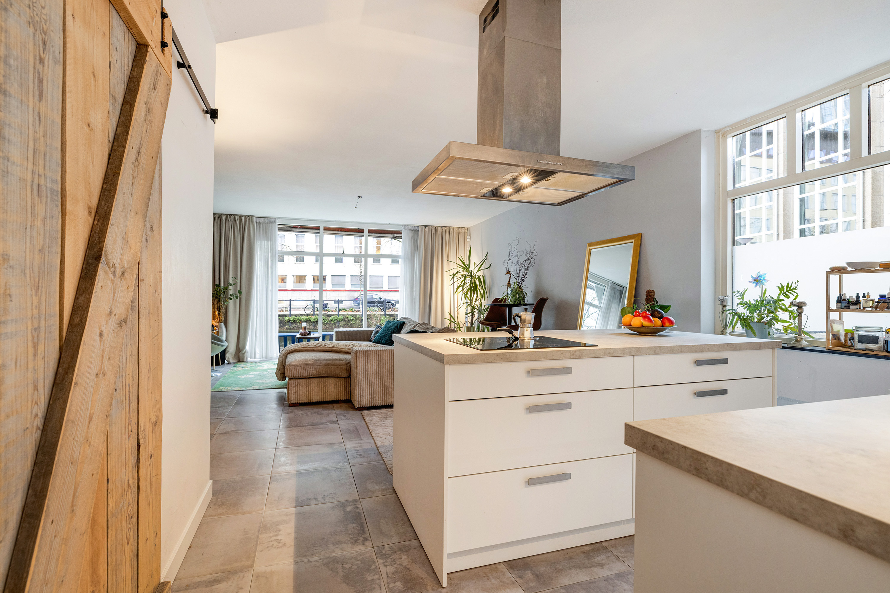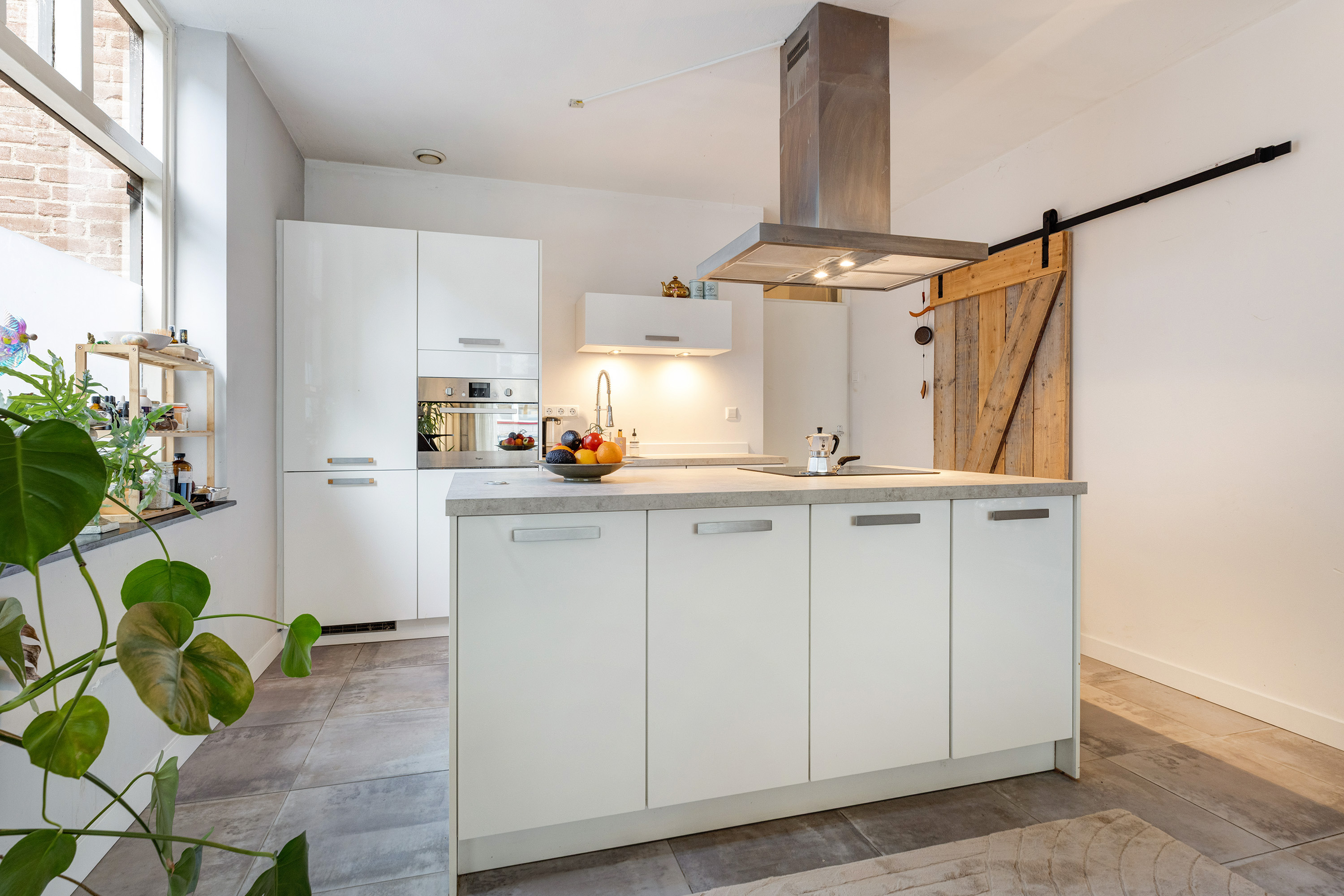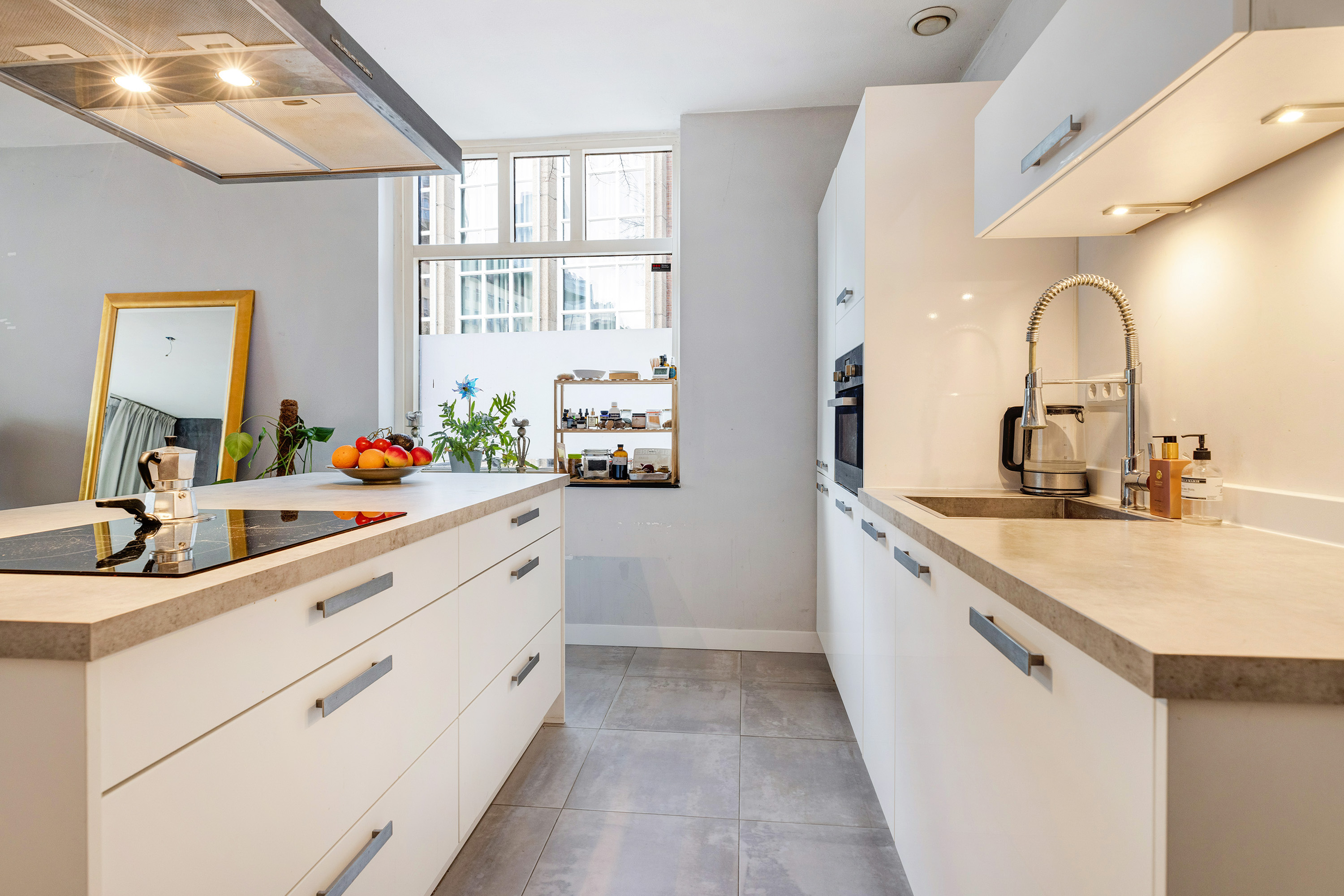 De woonkamer staat in open verbinding met de moderne open keuken, centraal in de woning. De keuken is voorzien van een kookeiland, een spoelgedeelte aan de wand, en praktische inloopkast. Een fijne plek om te koken en te borrelen met vrienden.