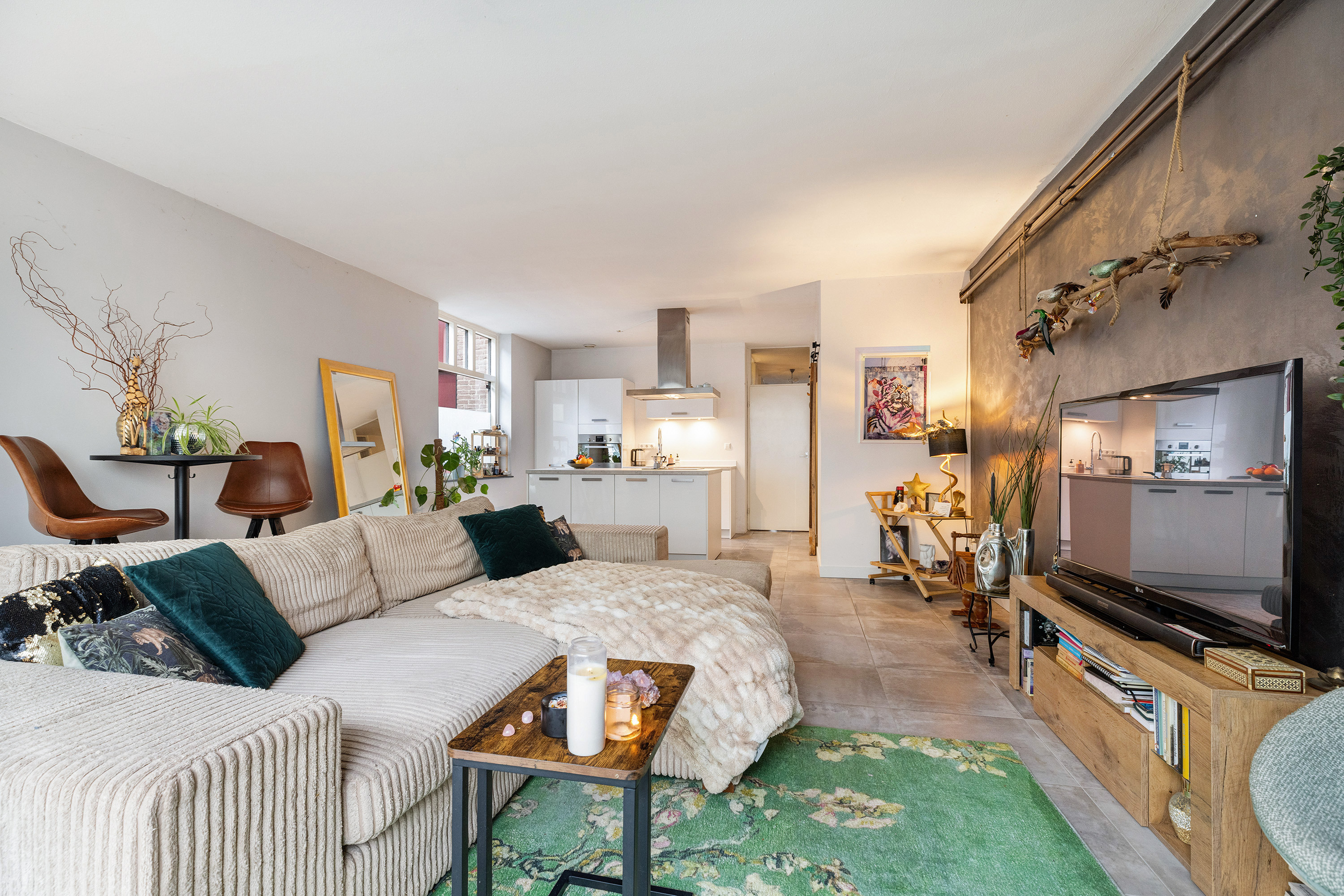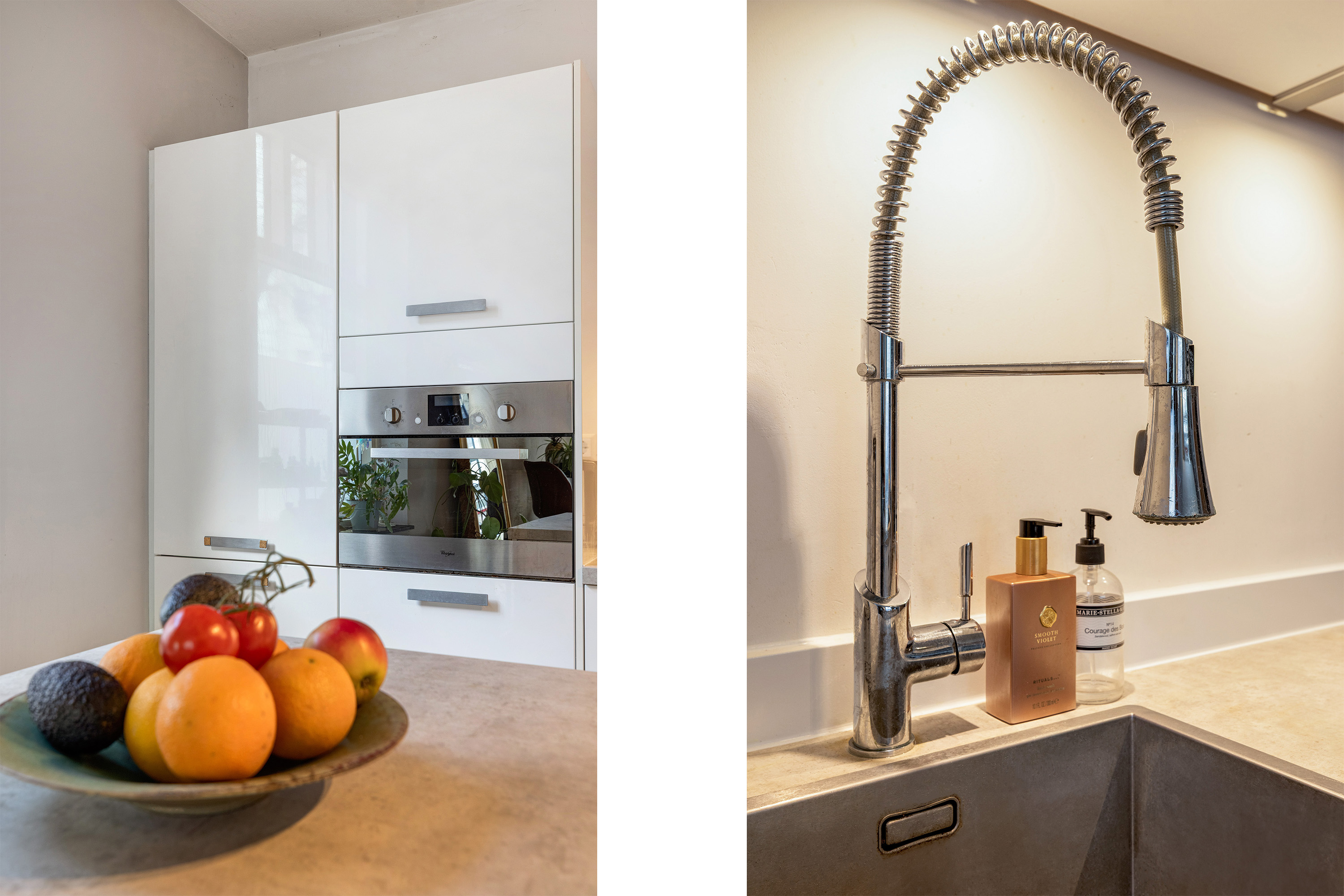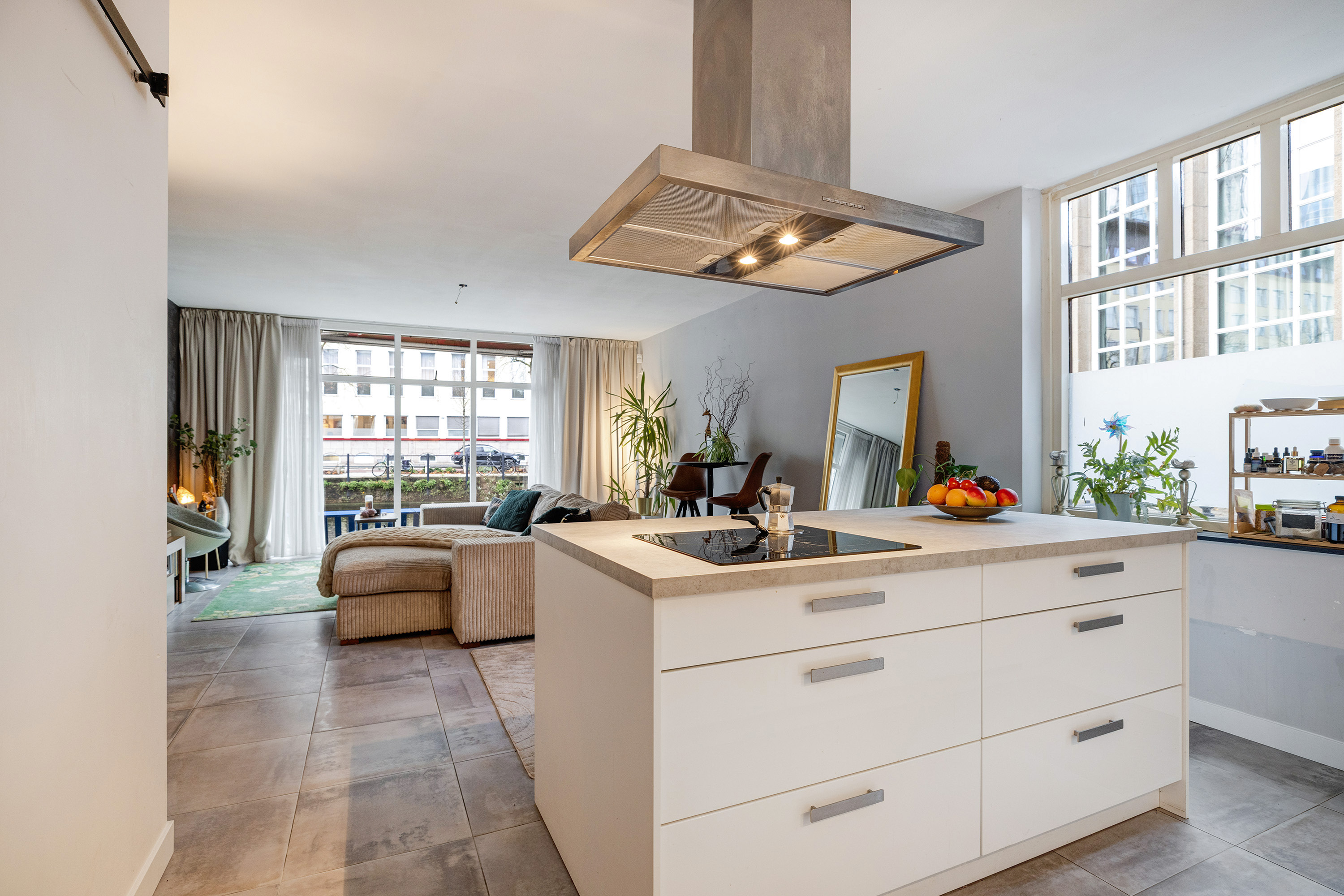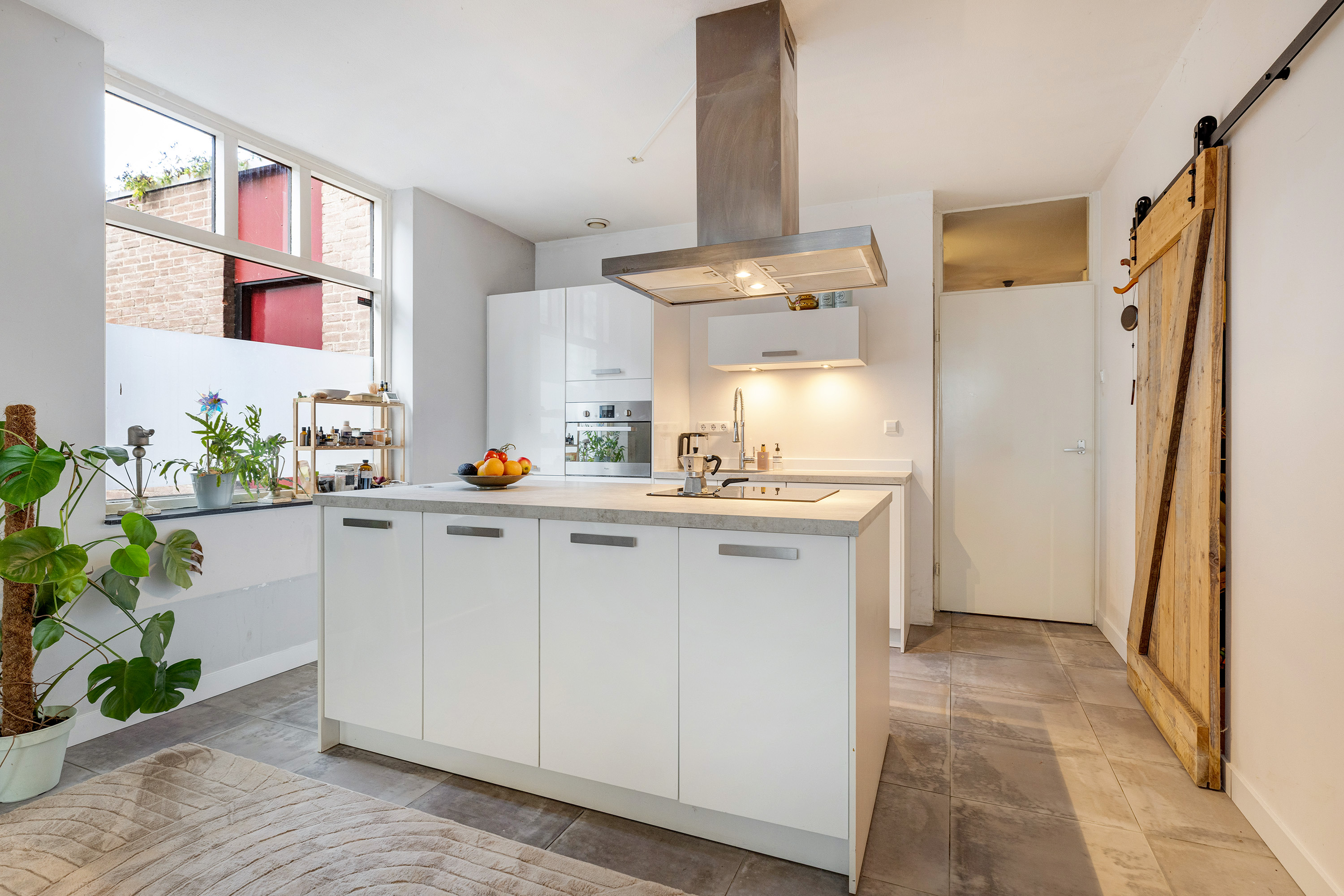 De woonkamer staat in open verbinding met de moderne open keuken, centraal in de woning. De keuken is voorzien van een kookeiland, een spoelgedeelte aan de wand, en praktische inloopkast. Een fijne plek om te koken en te borrelen met vrienden.