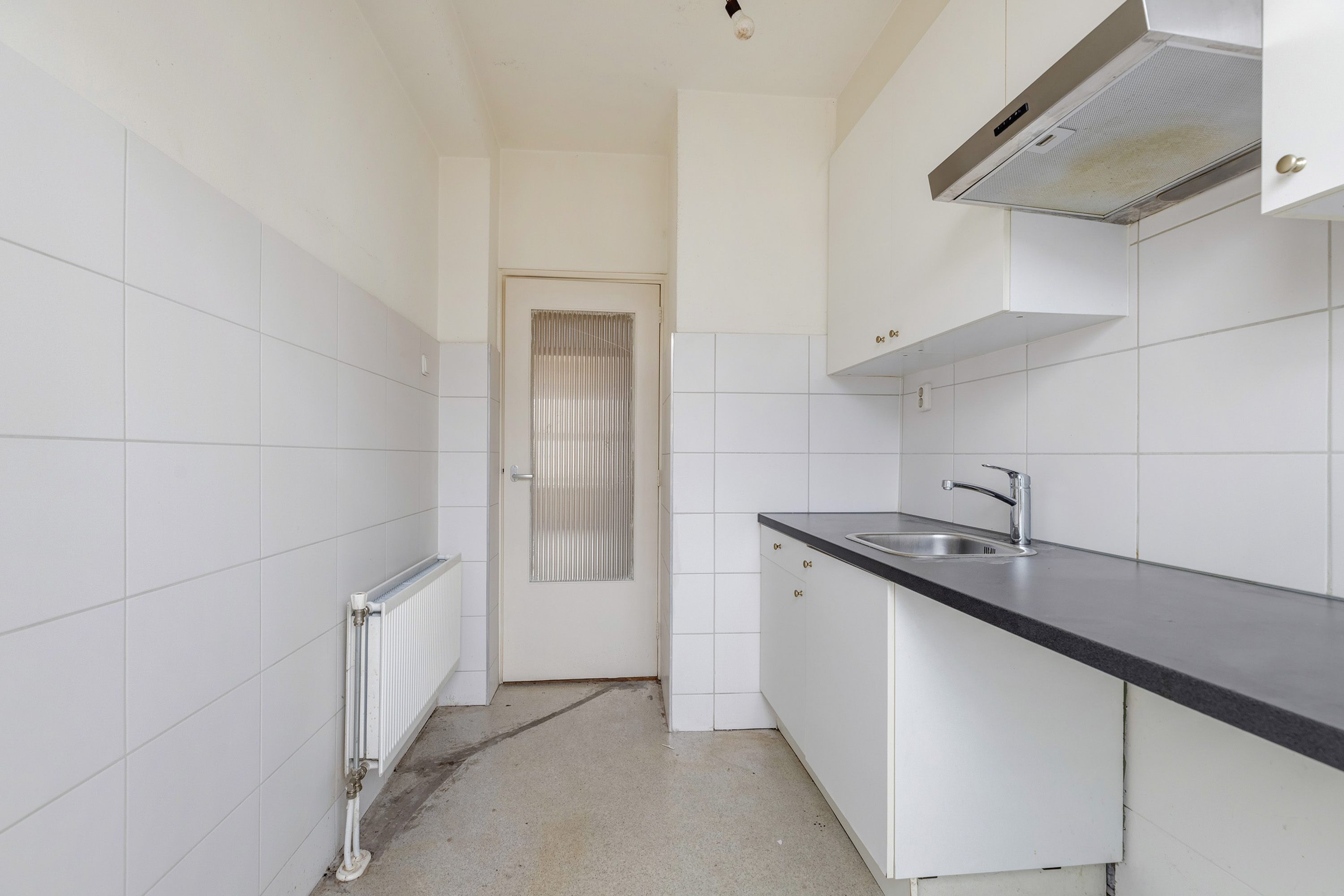 De keuken bevindt zich aan de voorzijde van de woning en is functioneel ingericht met een recht keukenblok en voldoende werk- en opbergruimte.
