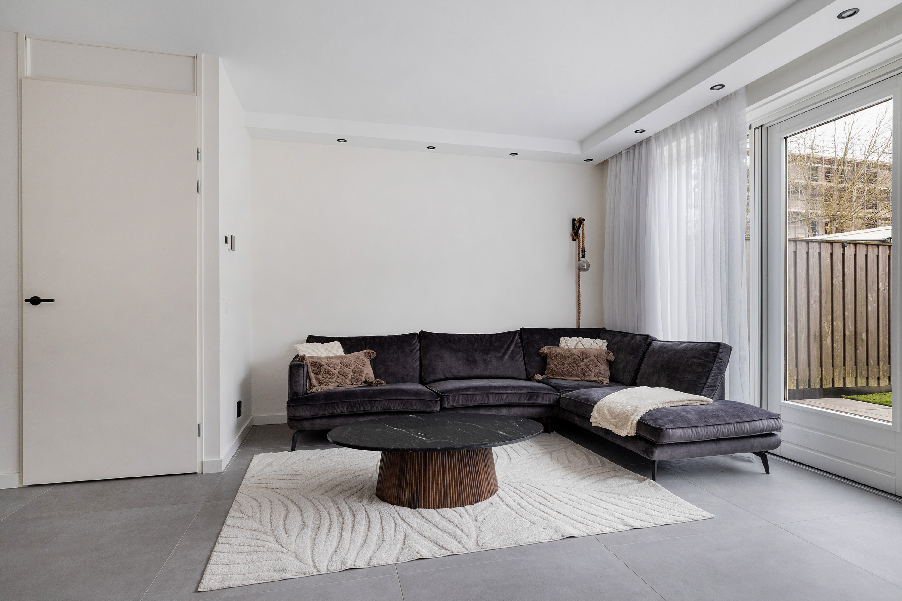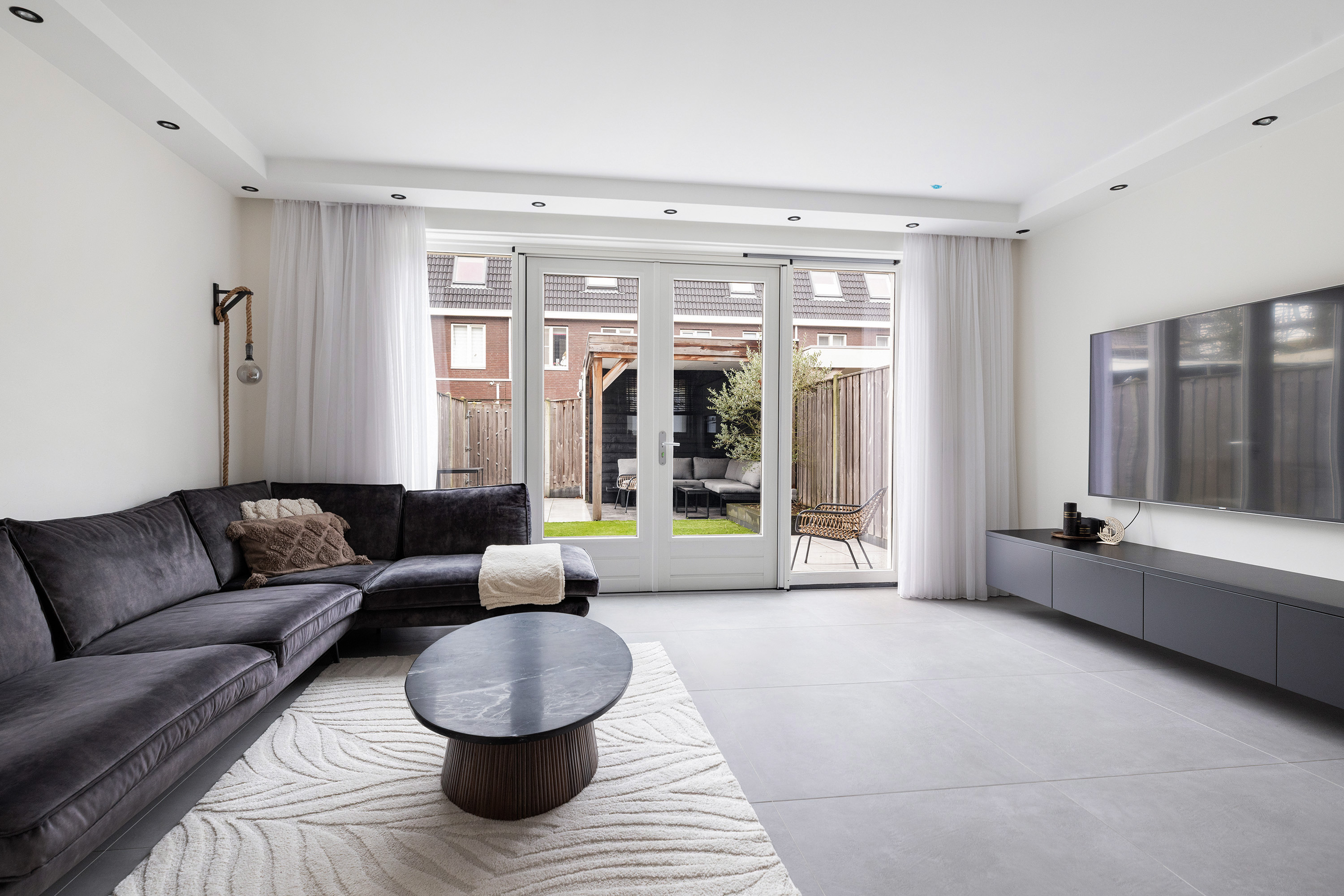 De tuingerichte woonkamer is heerlijk licht dankzij de brede pui met dubbele openslaande deuren naar de achtertuin. Met een plafondhoogte van circa 2,61 meter voelt de ruimte extra ruim aan. Er is volop plek voor een comfortabele zithoek én een royale eettafel.