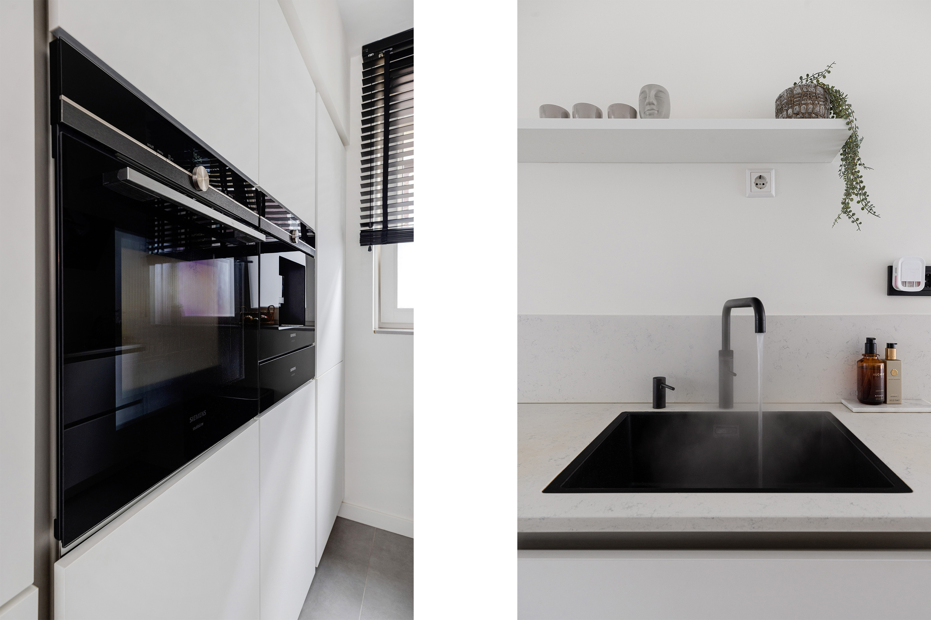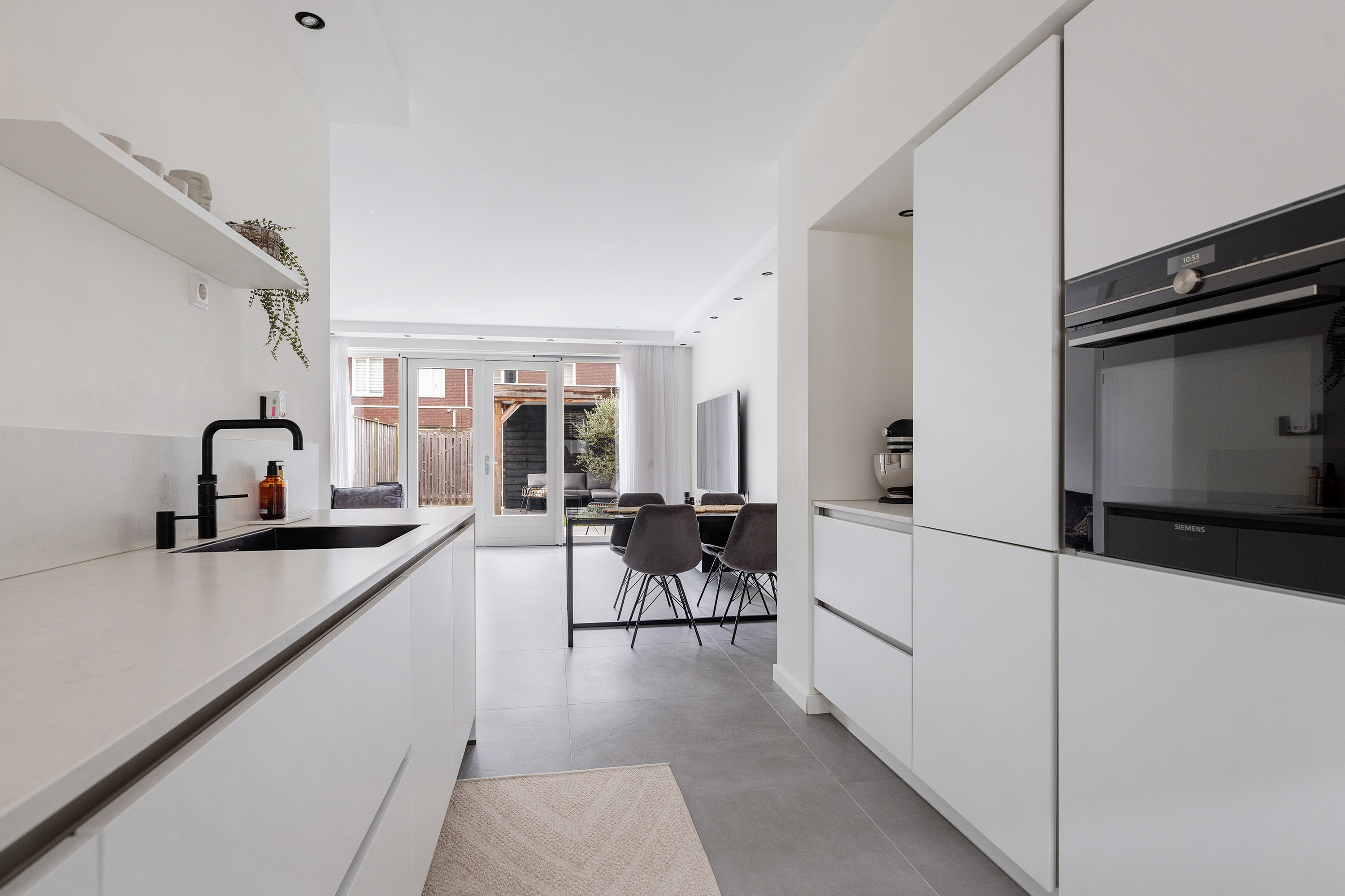 Aan de voorzijde bevindt zich de moderne open keuken, opgesteld in een praktische parallelopstelling met een extra werk-/kookeiland. De keuken is voorzien van diverse inbouwapparatuur en biedt veel werk- en bergruimte. Door de grote raampartij aan de voorzijde geniet je hier van prettig daglicht en zicht op het rustige hofje.