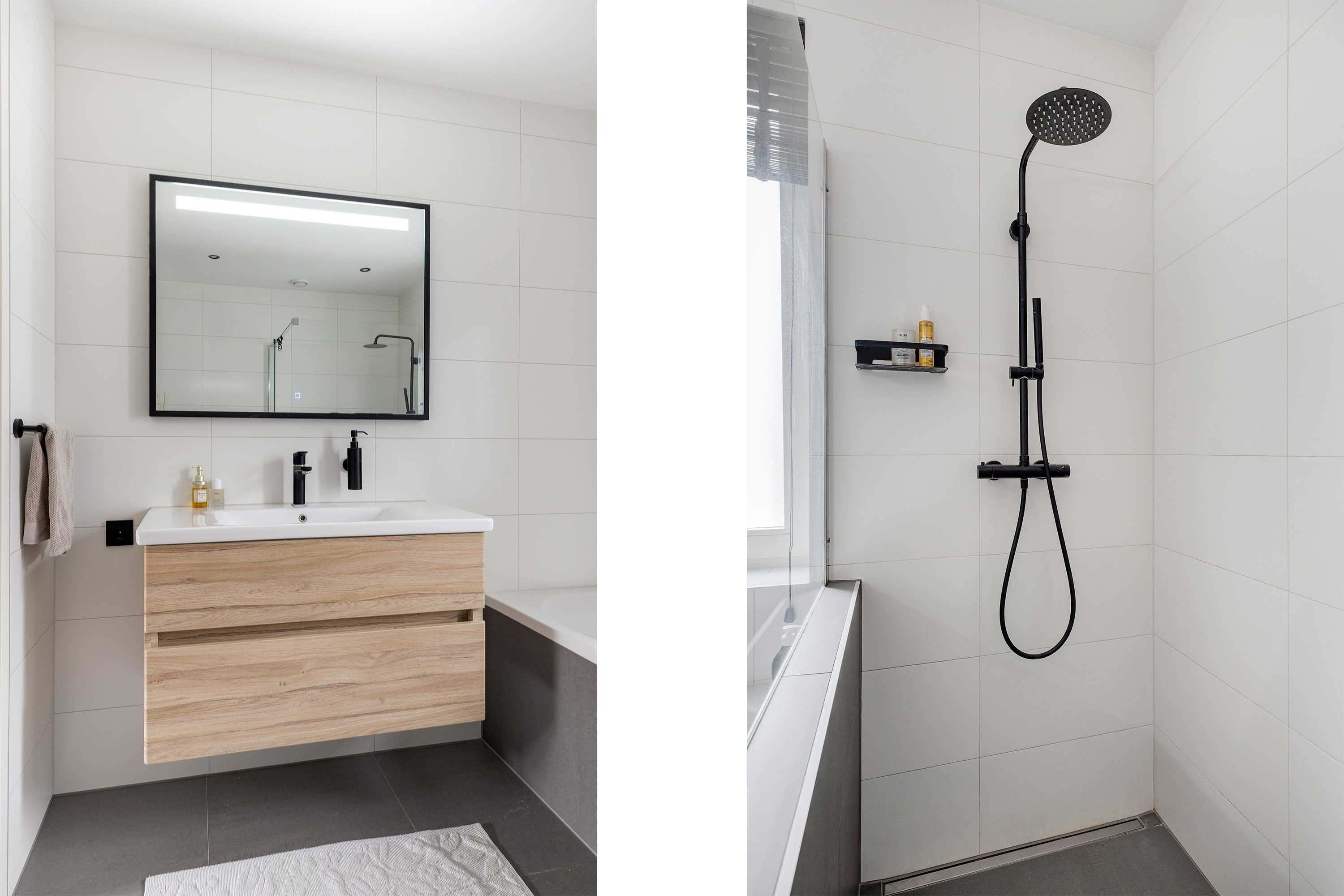 De badkamer is compleet uitgevoerd met ligbad, separate douche, wastafel en tweede toilet. Dankzij het raam is er natuurlijke ventilatie en daglicht aanwezig.