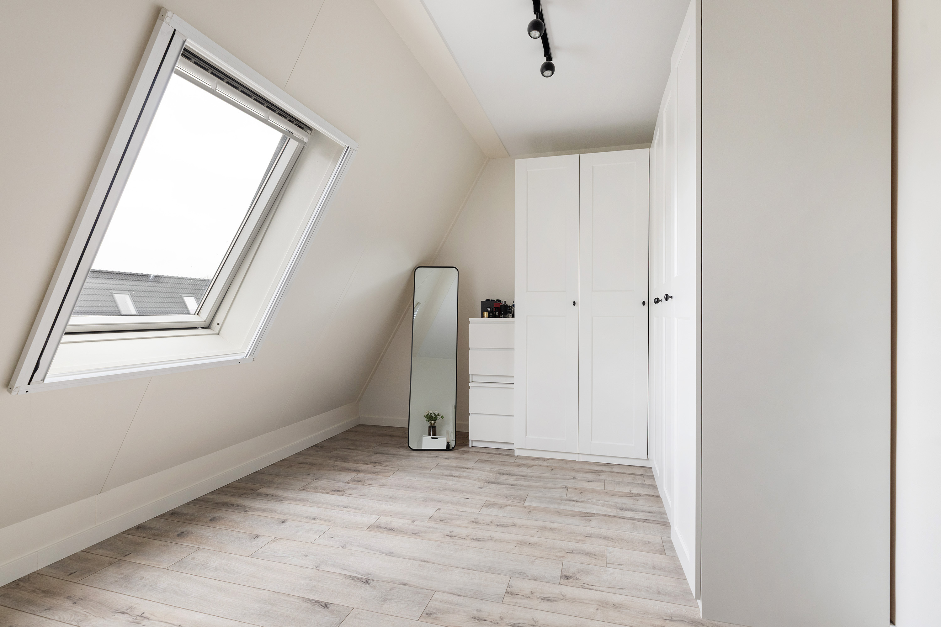 De vaste trap leidt naar de tweede verdieping. Hier bevindt zich een ruime vierde slaapkamer met dakraam en veel bergruimte achter de knieschotten.