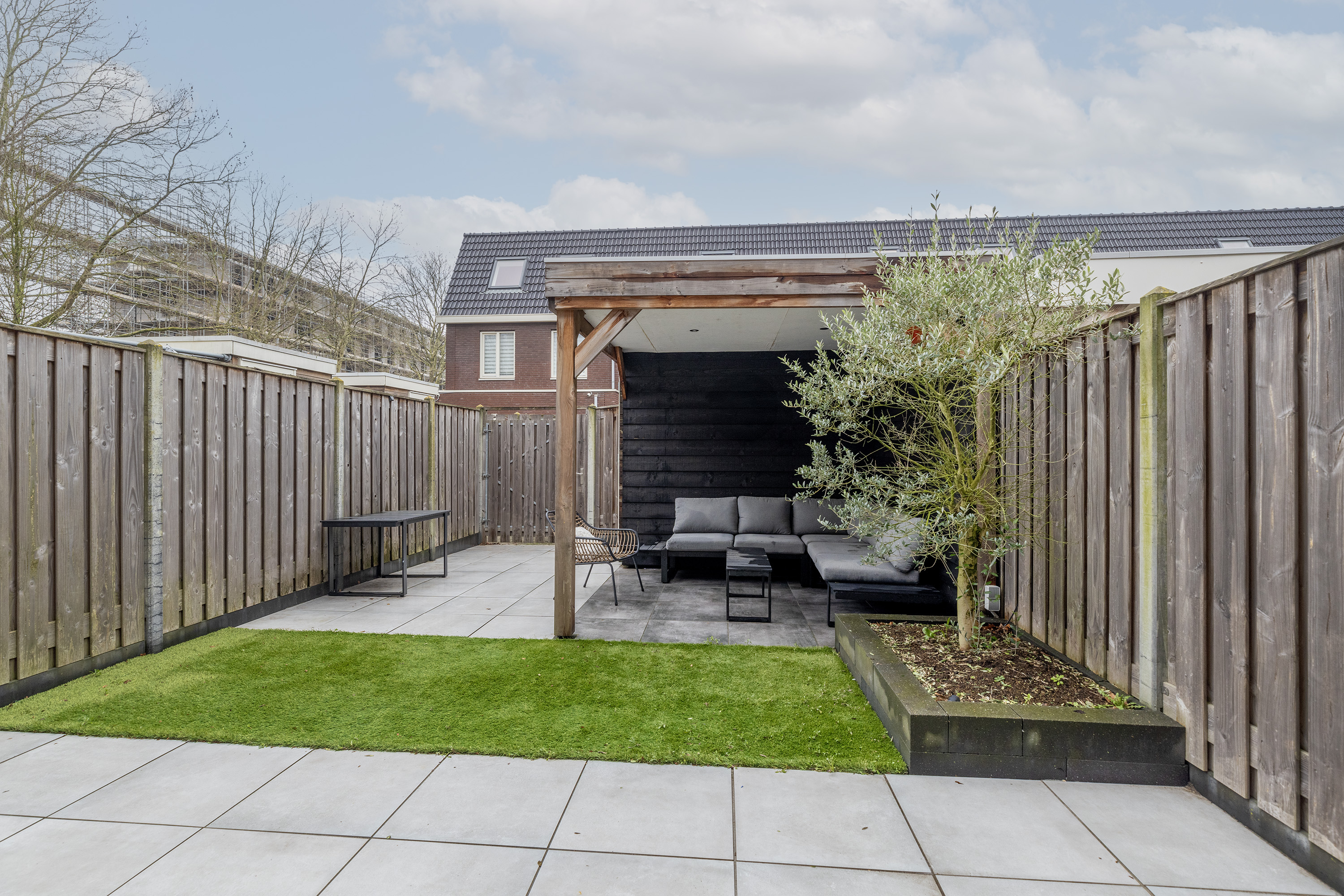 De achtertuin is verzorgd aangelegd en biedt ruimte om meerdere zitplekken te creëren. Achterin de tuin vind je een berging met aansluitend een overkapping: ideaal voor fietsen, opslag of een beschutte loungeplek.