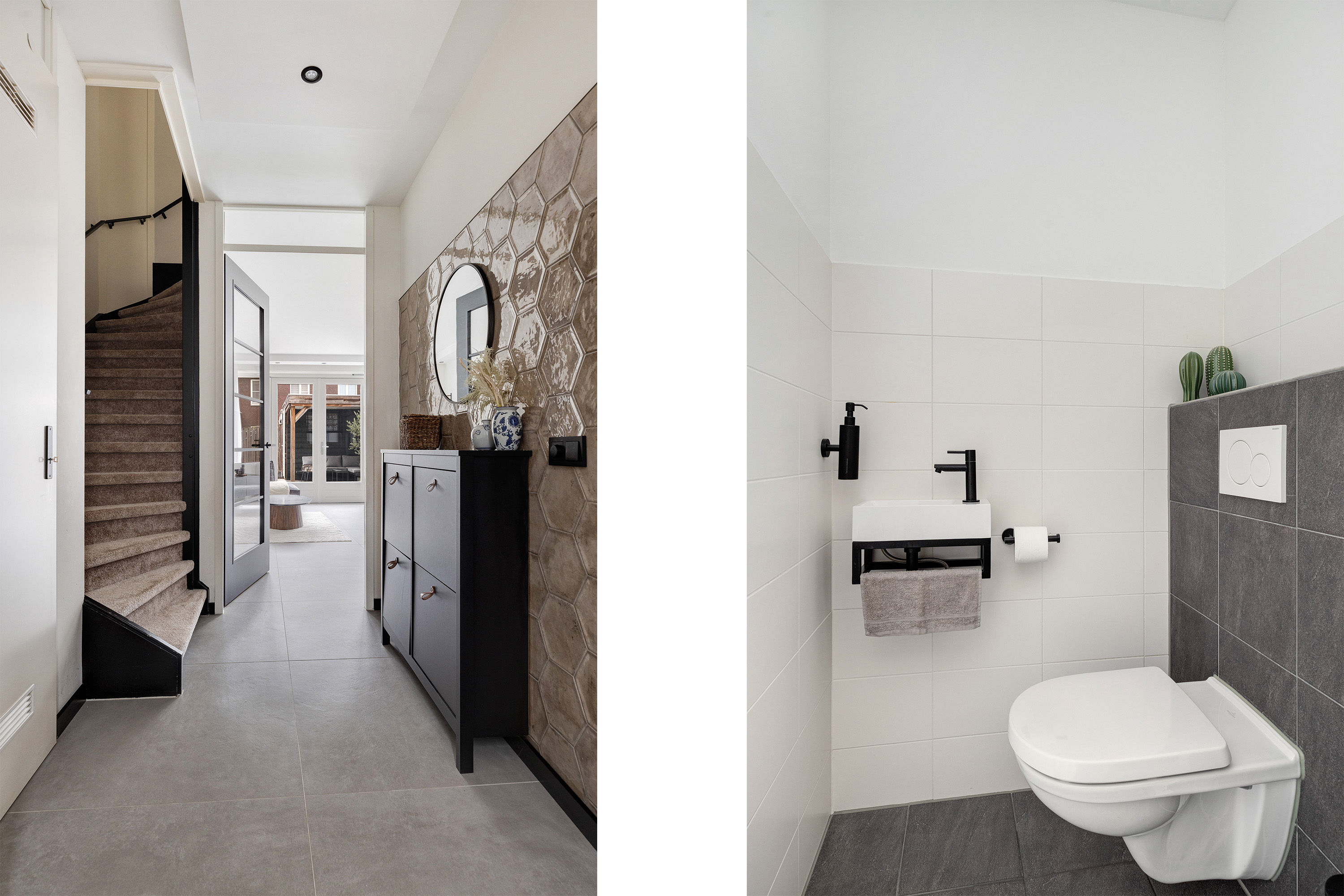 Via de entree kom je binnen in de hal met meterkast, modern toilet en toegang tot de trapopgang. Vanuit hier stap je de royale woonkamer binnen.