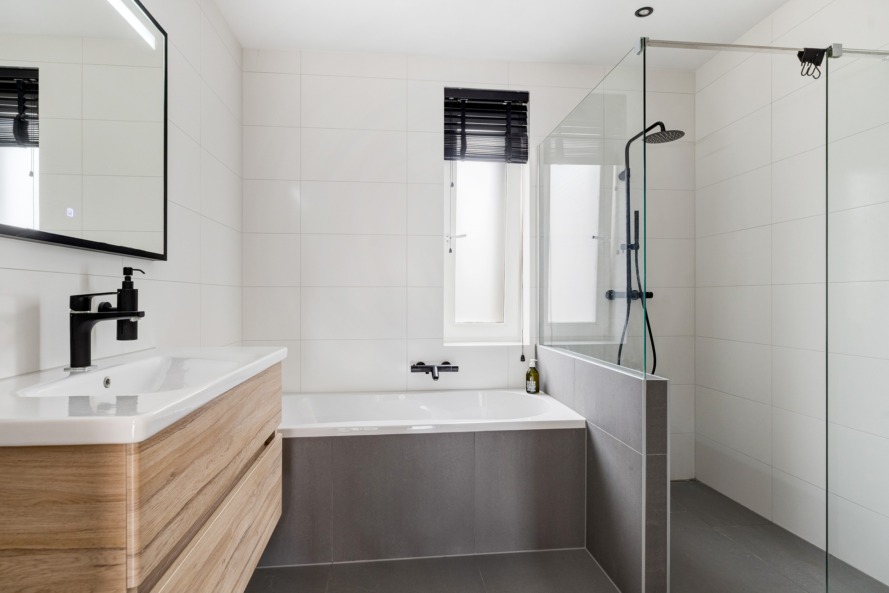 De badkamer is compleet uitgevoerd met ligbad, separate douche, wastafel en tweede toilet. Dankzij het raam is er natuurlijke ventilatie en daglicht aanwezig.