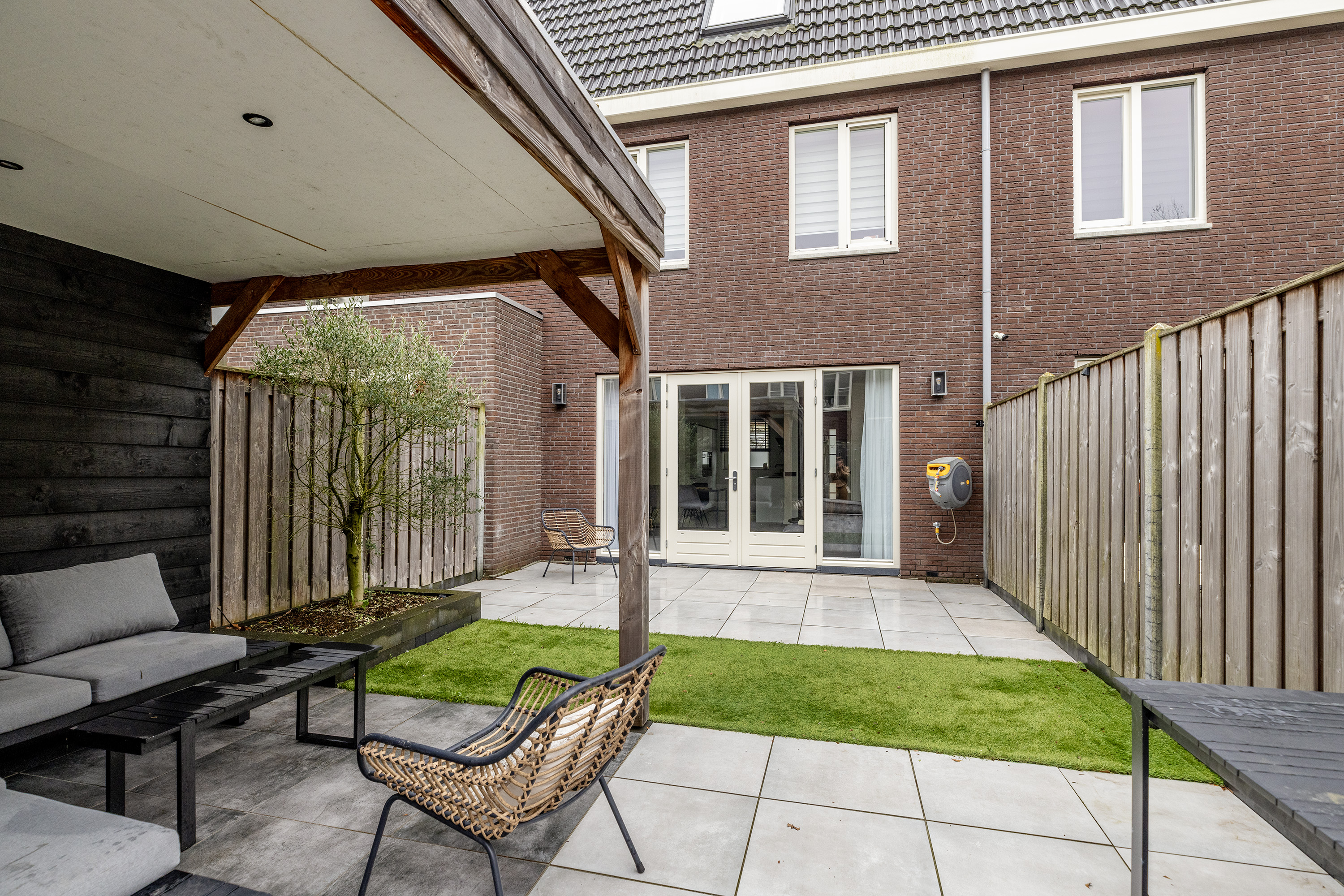 De achtertuin is verzorgd aangelegd en biedt ruimte om meerdere zitplekken te creëren. Achterin de tuin vind je een berging met aansluitend een overkapping: ideaal voor fietsen, opslag of een beschutte loungeplek.