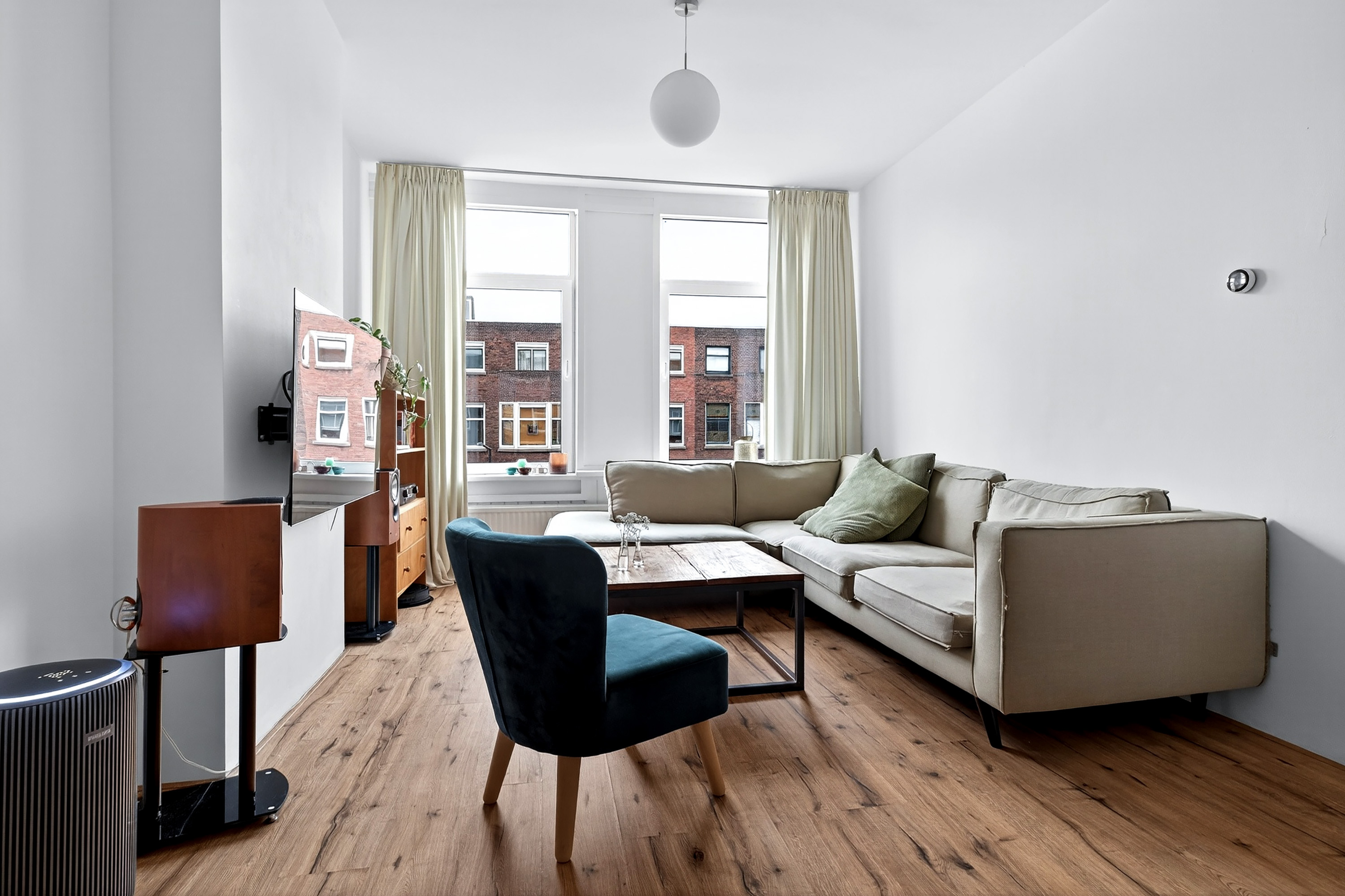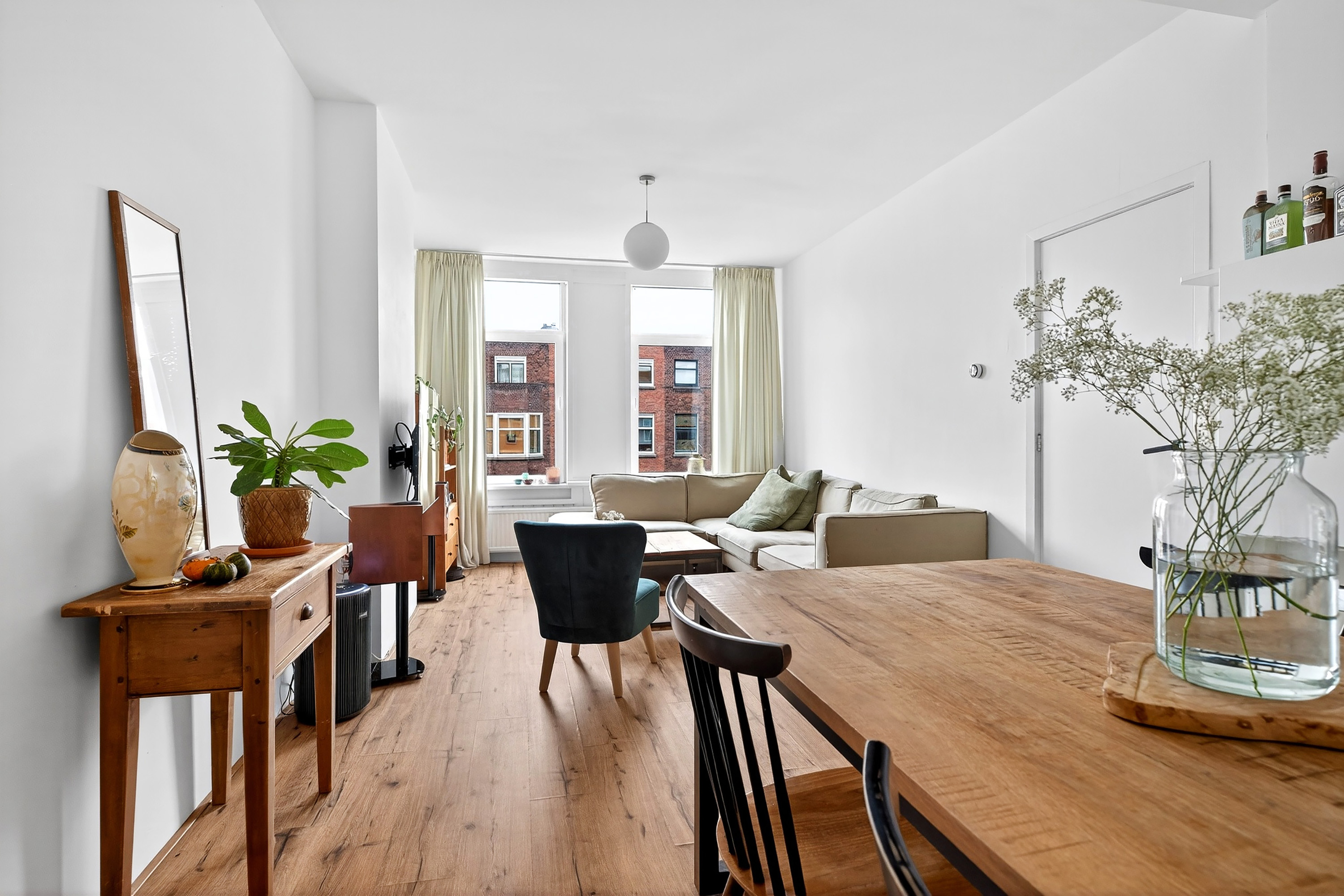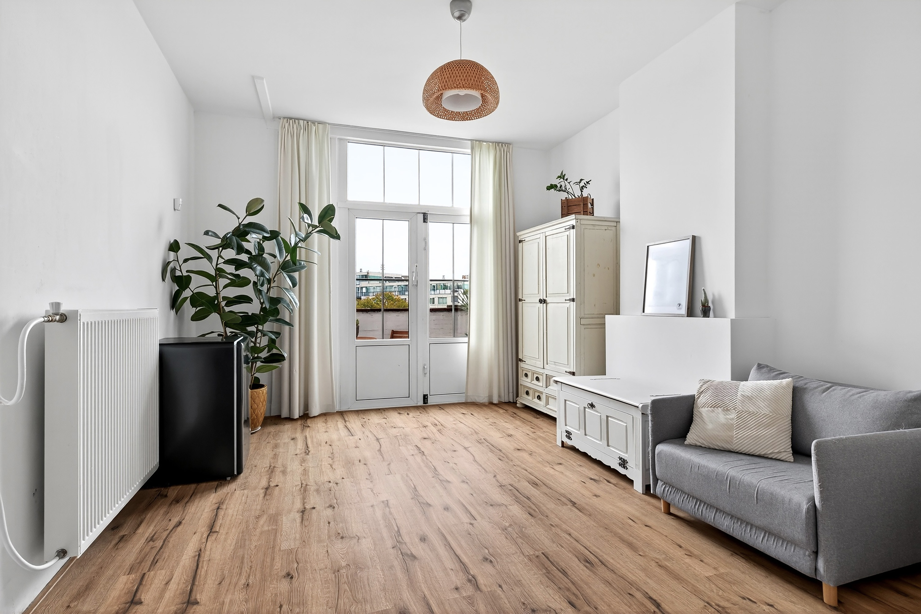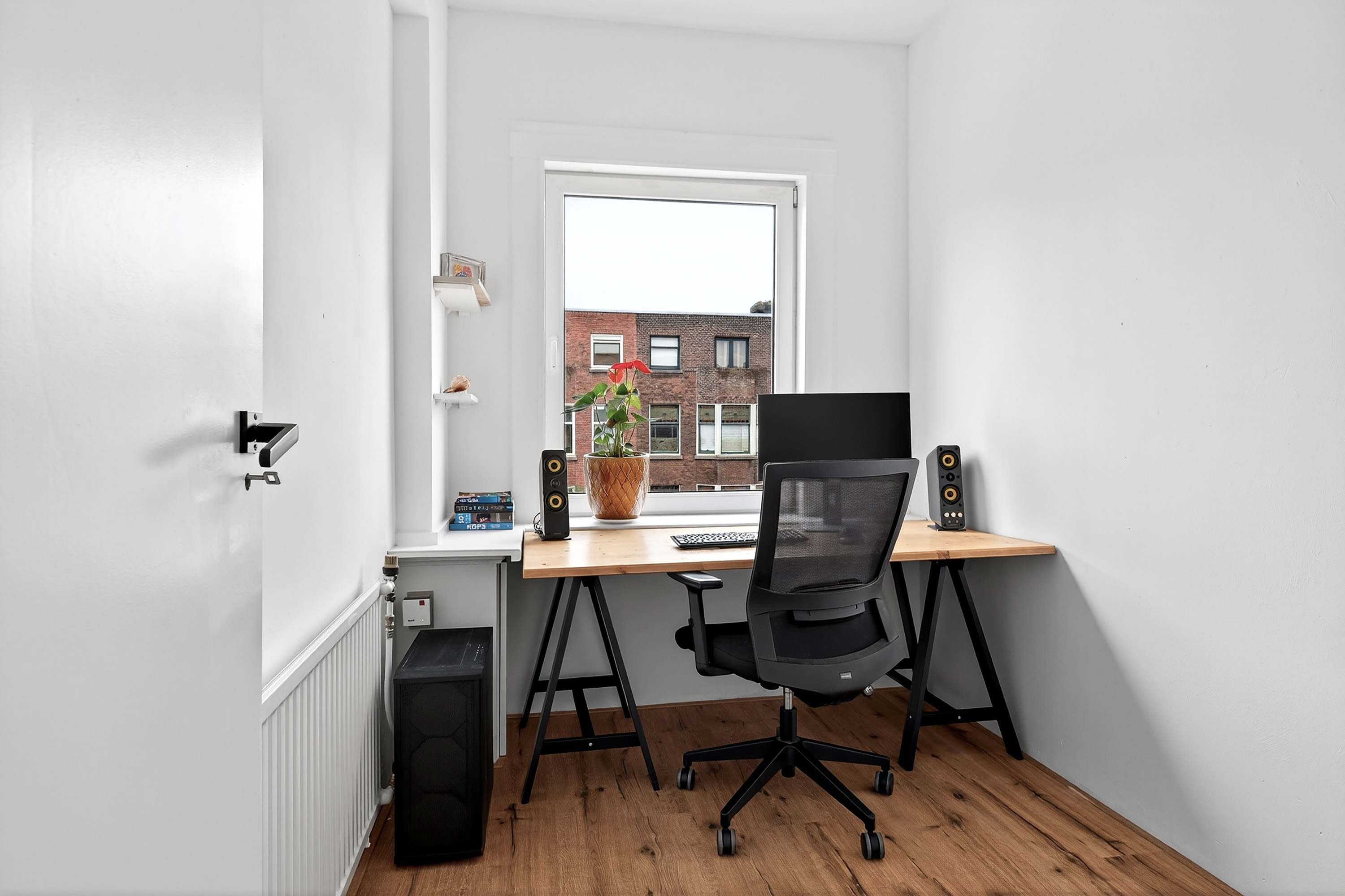 Op de tweede verdieping bevindt zich de eetkamer met toegang tot het balkon, gelegen op het noordoosten – een heerlijke plek voor een kop koffie in de ochtendzon. Aan de achterzijde bevinden zich tevens de keuken en een toilet. Aan de voorzijde van deze verdieping ligt de ruime woonkamer, die dankzij de grote raampartijen én de royale plafondhoogte van ca. 2,80 m een bijzonder lichte en open sfeer heeft. Direct naast de woonkamer ligt een extra slaap- of werkkamer, ideaal voor thuiswerken of als logeerplek.