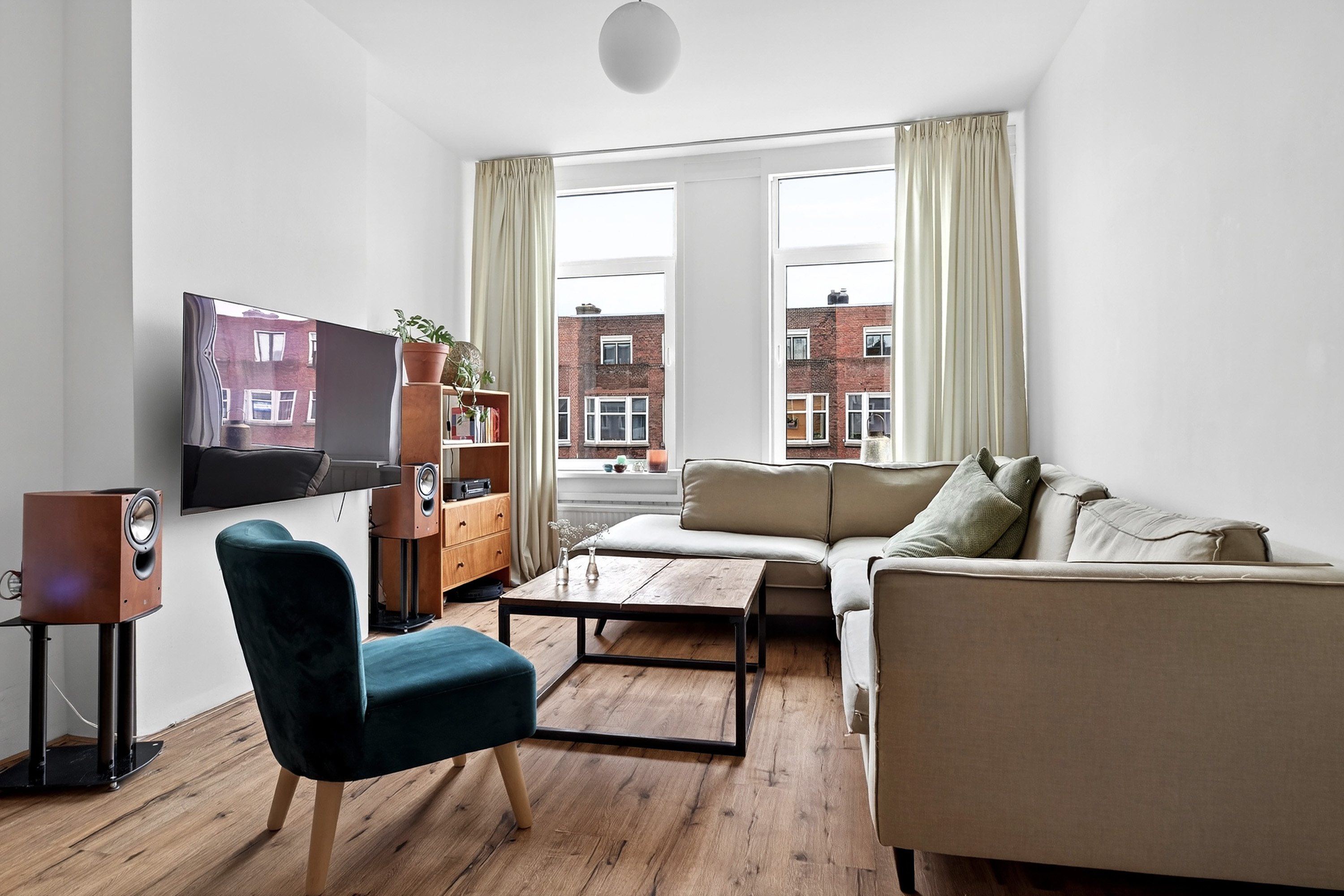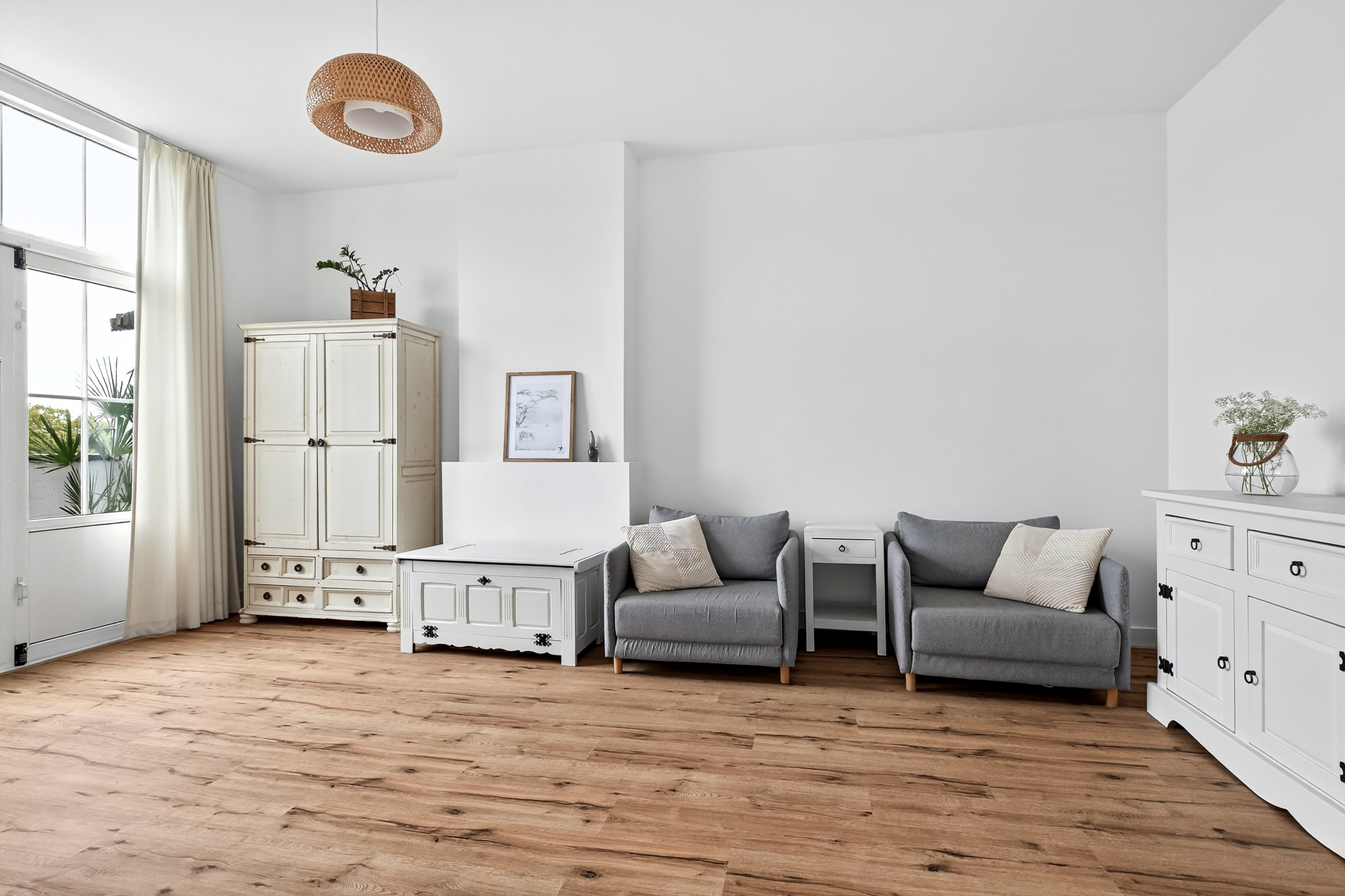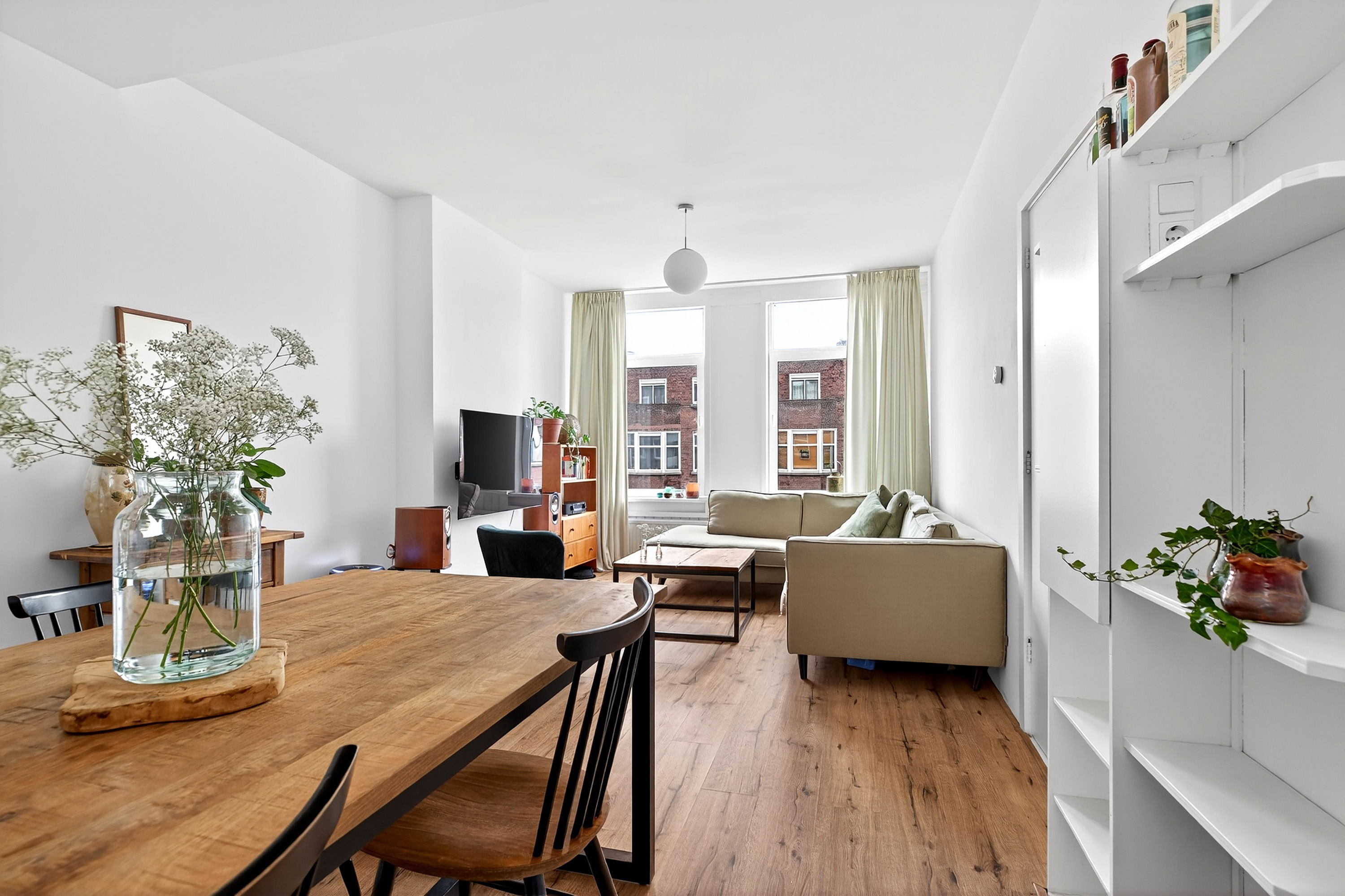 Op de tweede verdieping bevindt zich de eetkamer met toegang tot het balkon, gelegen op het noordoosten – een heerlijke plek voor een kop koffie in de ochtendzon. Aan de achterzijde bevinden zich tevens de keuken en een toilet. Aan de voorzijde van deze verdieping ligt de ruime woonkamer, die dankzij de grote raampartijen én de royale plafondhoogte van ca. 2,80 m een bijzonder lichte en open sfeer heeft. Direct naast de woonkamer ligt een extra slaap- of werkkamer, ideaal voor thuiswerken of als logeerplek.