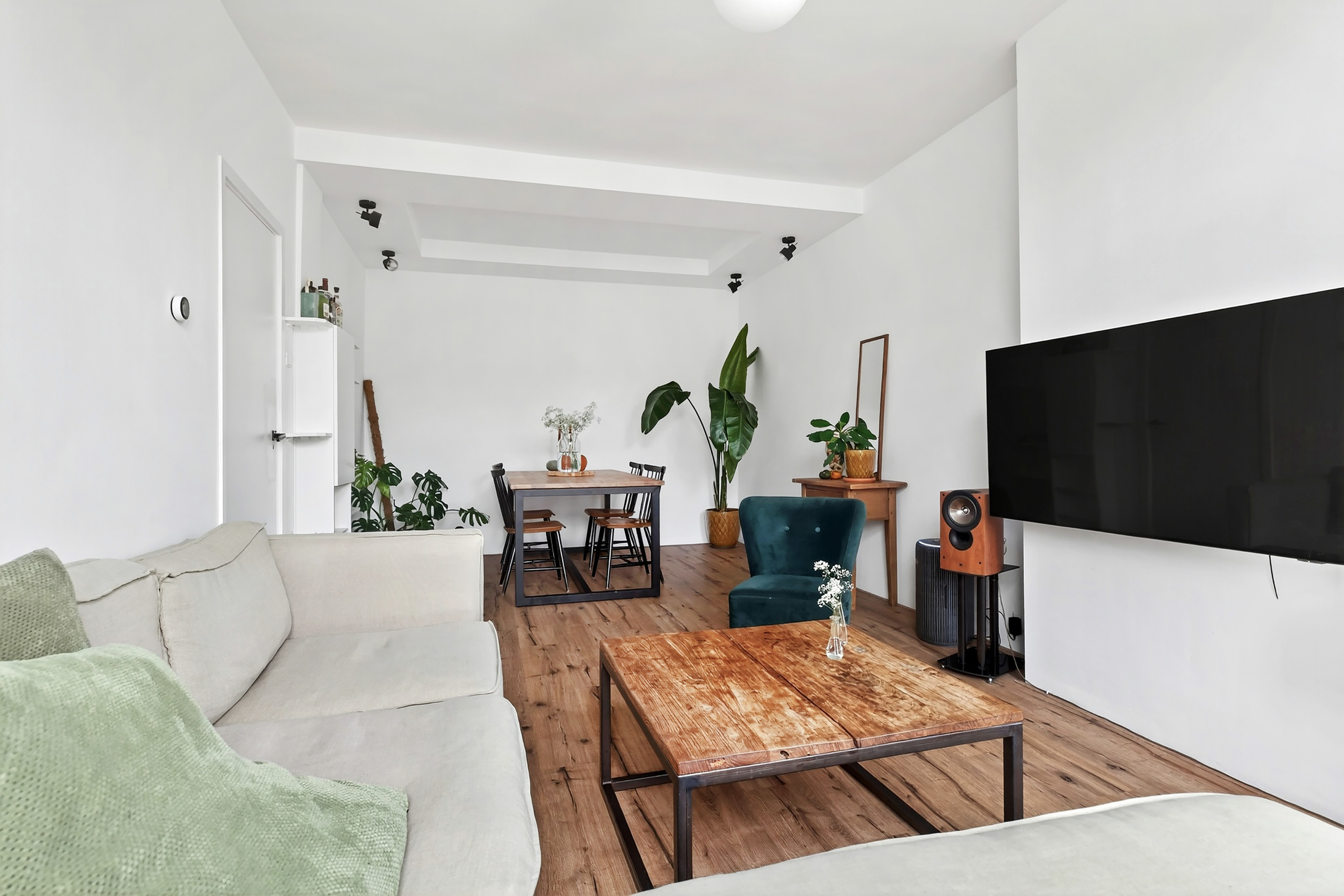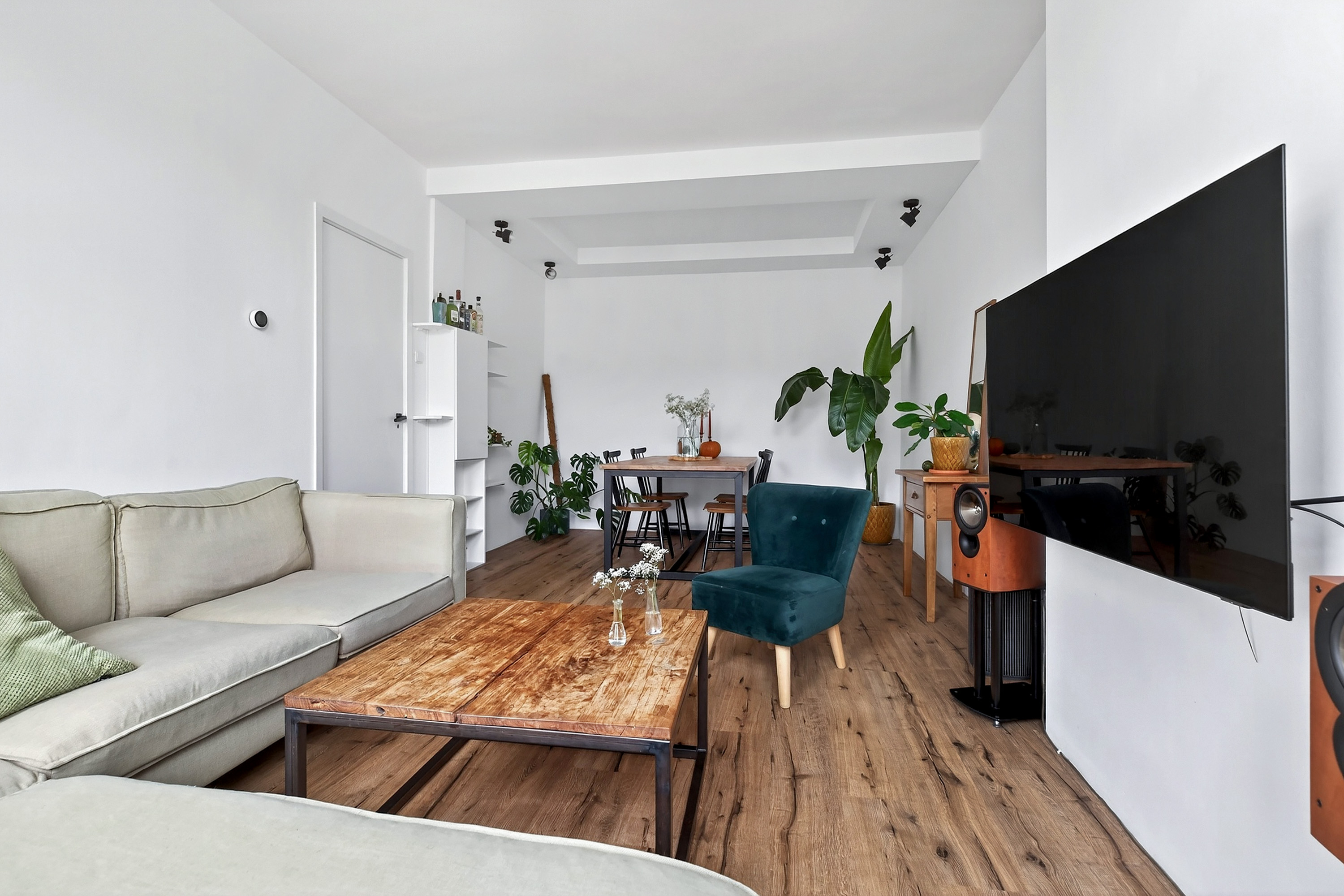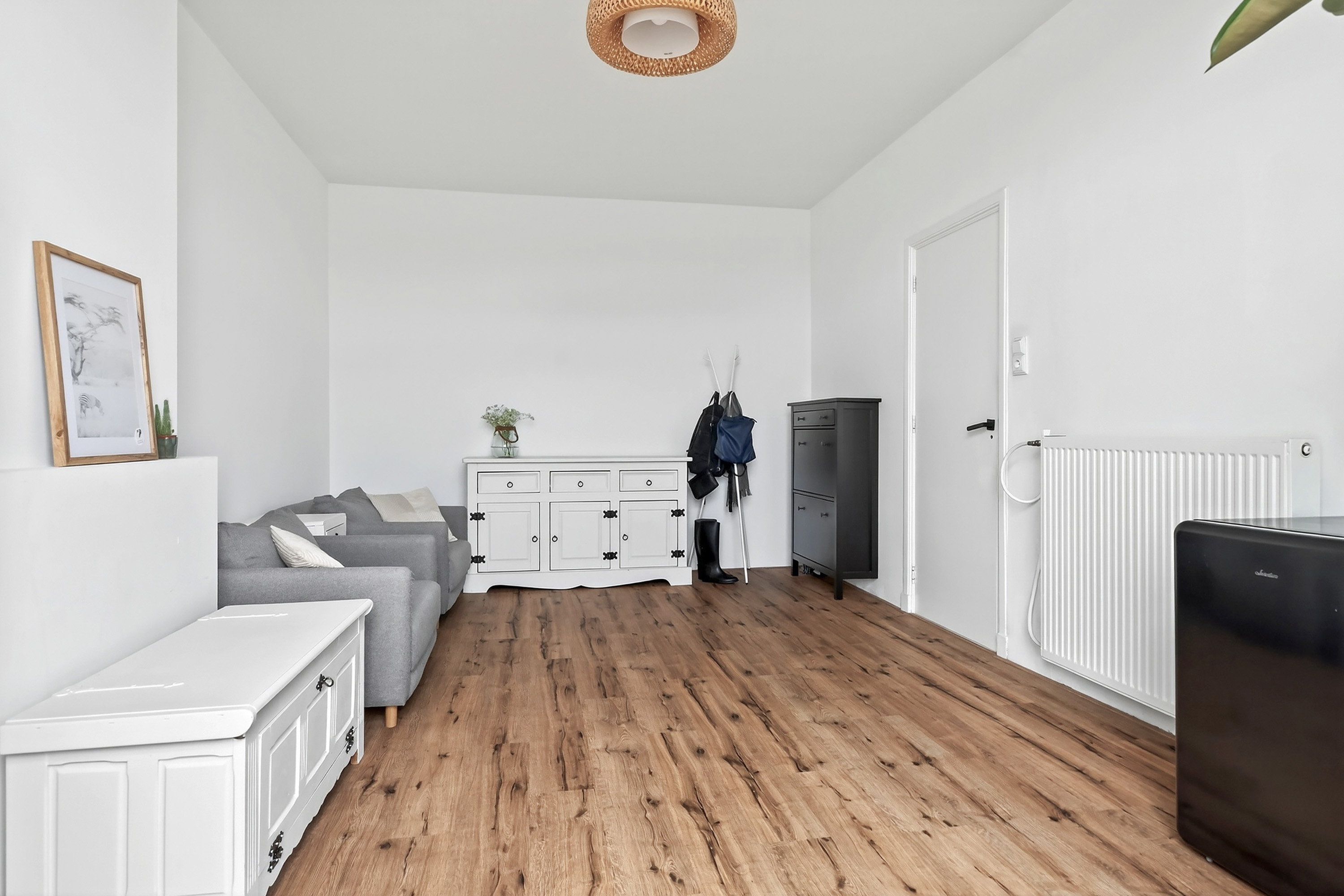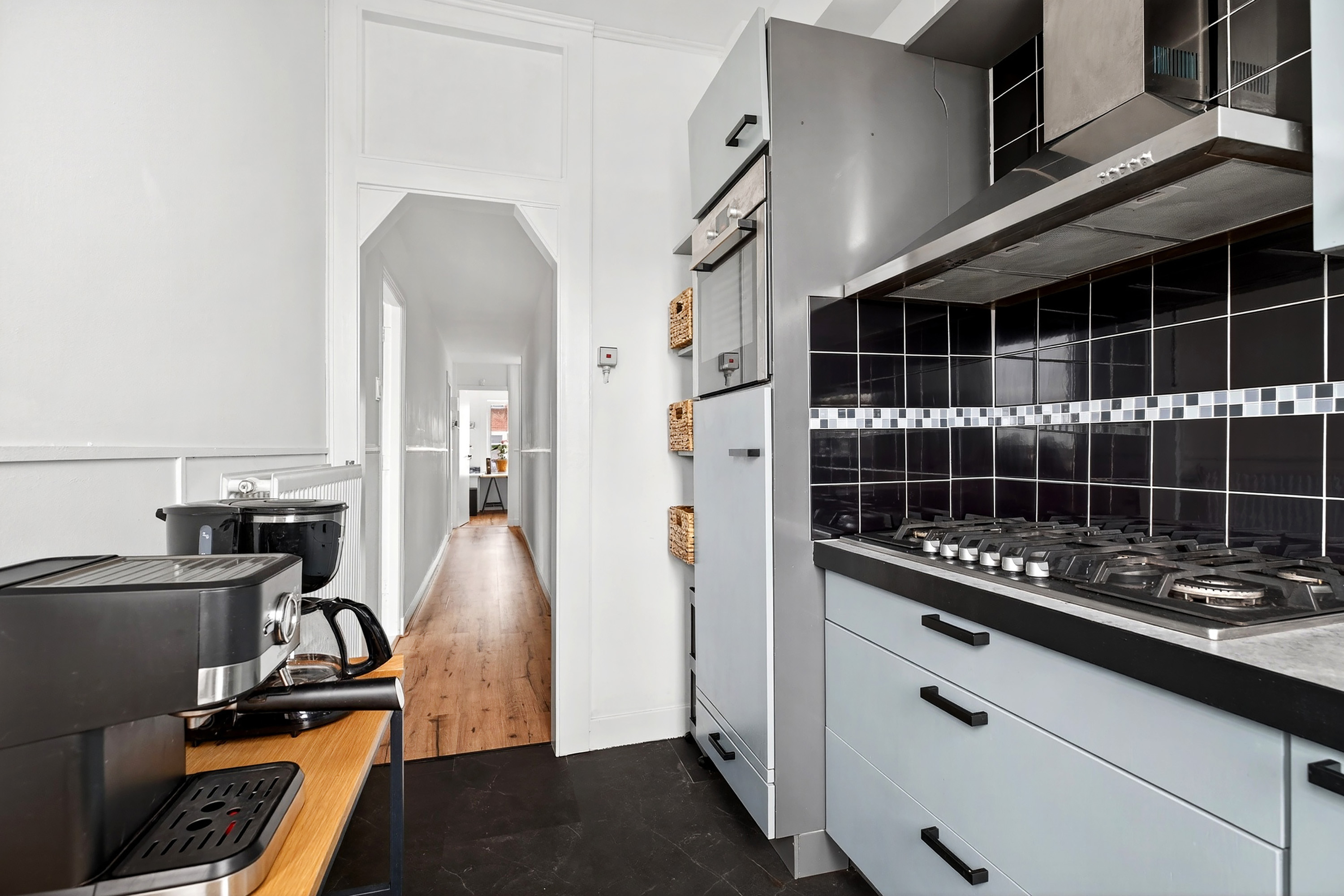 Op de tweede verdieping bevindt zich de eetkamer met toegang tot het balkon, gelegen op het noordoosten – een heerlijke plek voor een kop koffie in de ochtendzon. Aan de achterzijde bevinden zich tevens de keuken en een toilet. Aan de voorzijde van deze verdieping ligt de ruime woonkamer, die dankzij de grote raampartijen én de royale plafondhoogte van ca. 2,80 m een bijzonder lichte en open sfeer heeft. Direct naast de woonkamer ligt een extra slaap- of werkkamer, ideaal voor thuiswerken of als logeerplek.