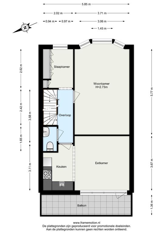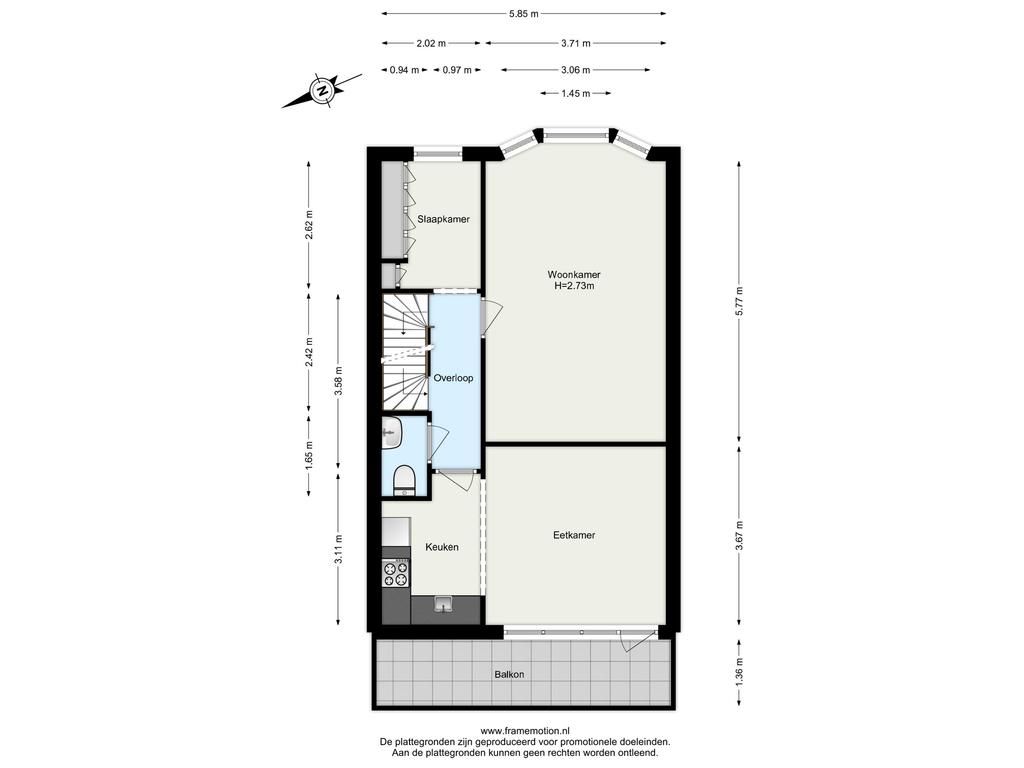 Overloop met toegang tot alle vertrekken, en beschikt over een toilet. Aan de voorzijde bevinden zich een slaapkamer en een ruime woonkamer. Aan de achterzijde is de half open keuken en een riante eetkamer, de eetkamer biedt toegang tot het balkon gelegen over de gehele breedte van de woning (5.85m).
