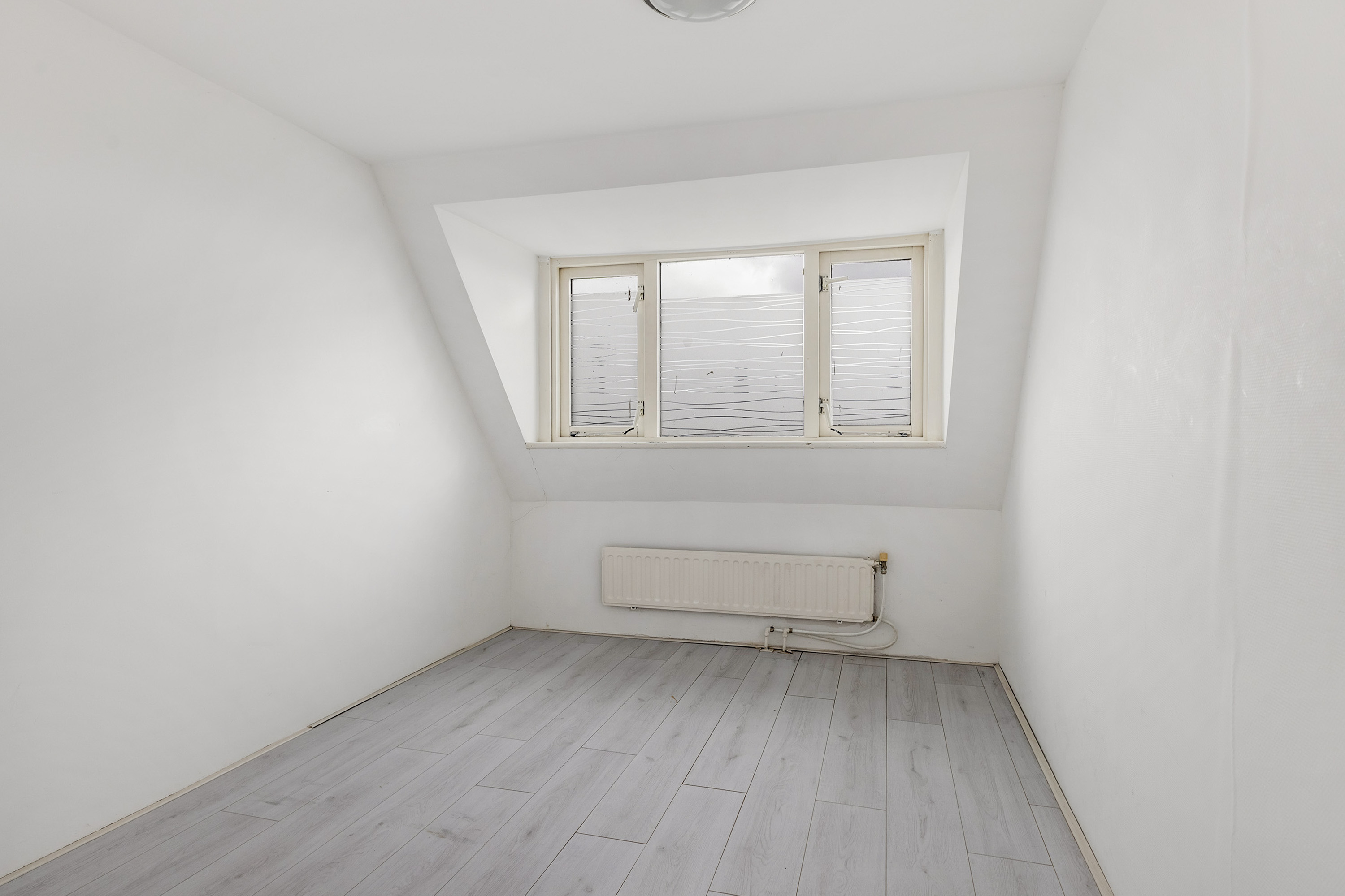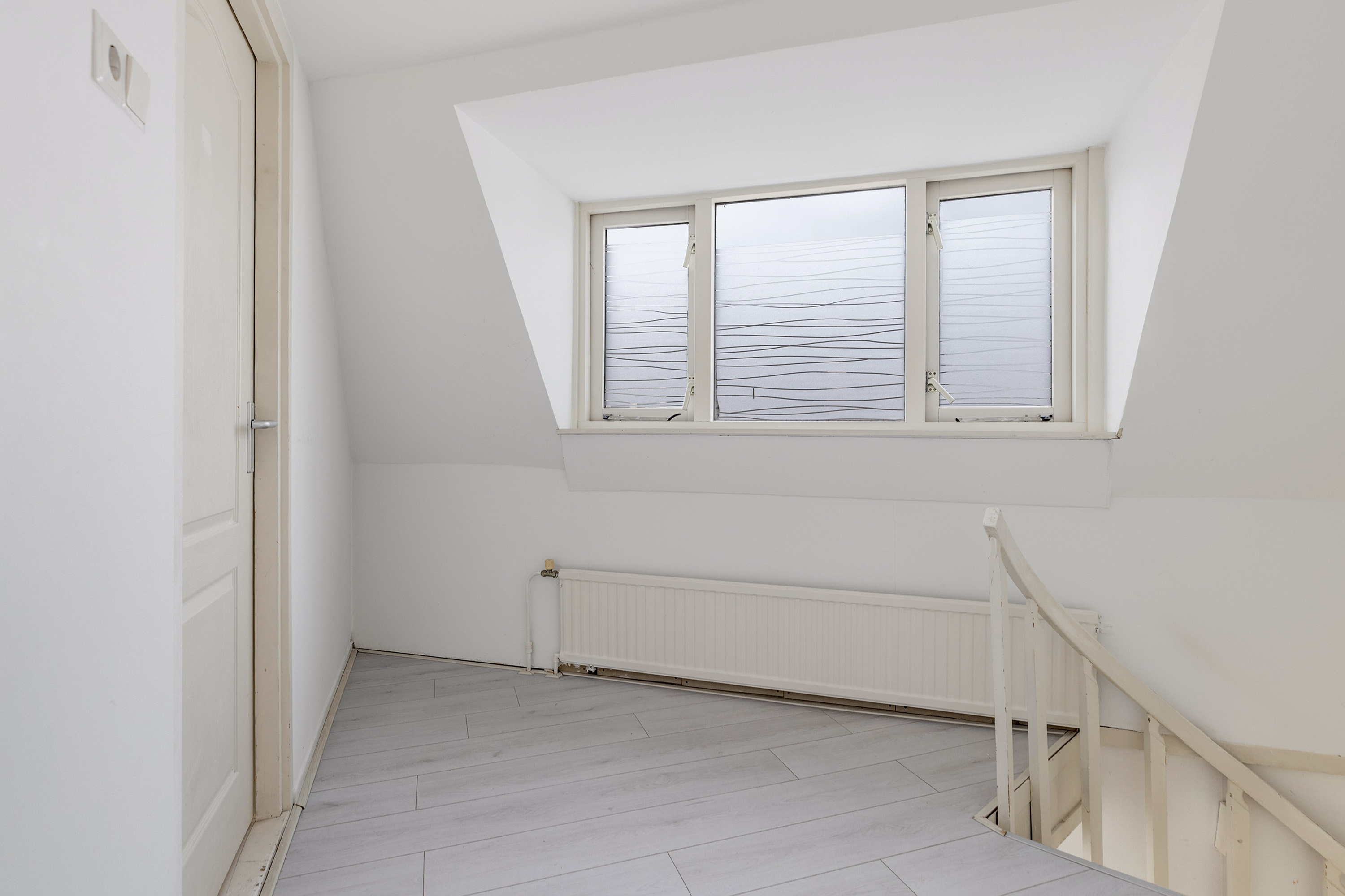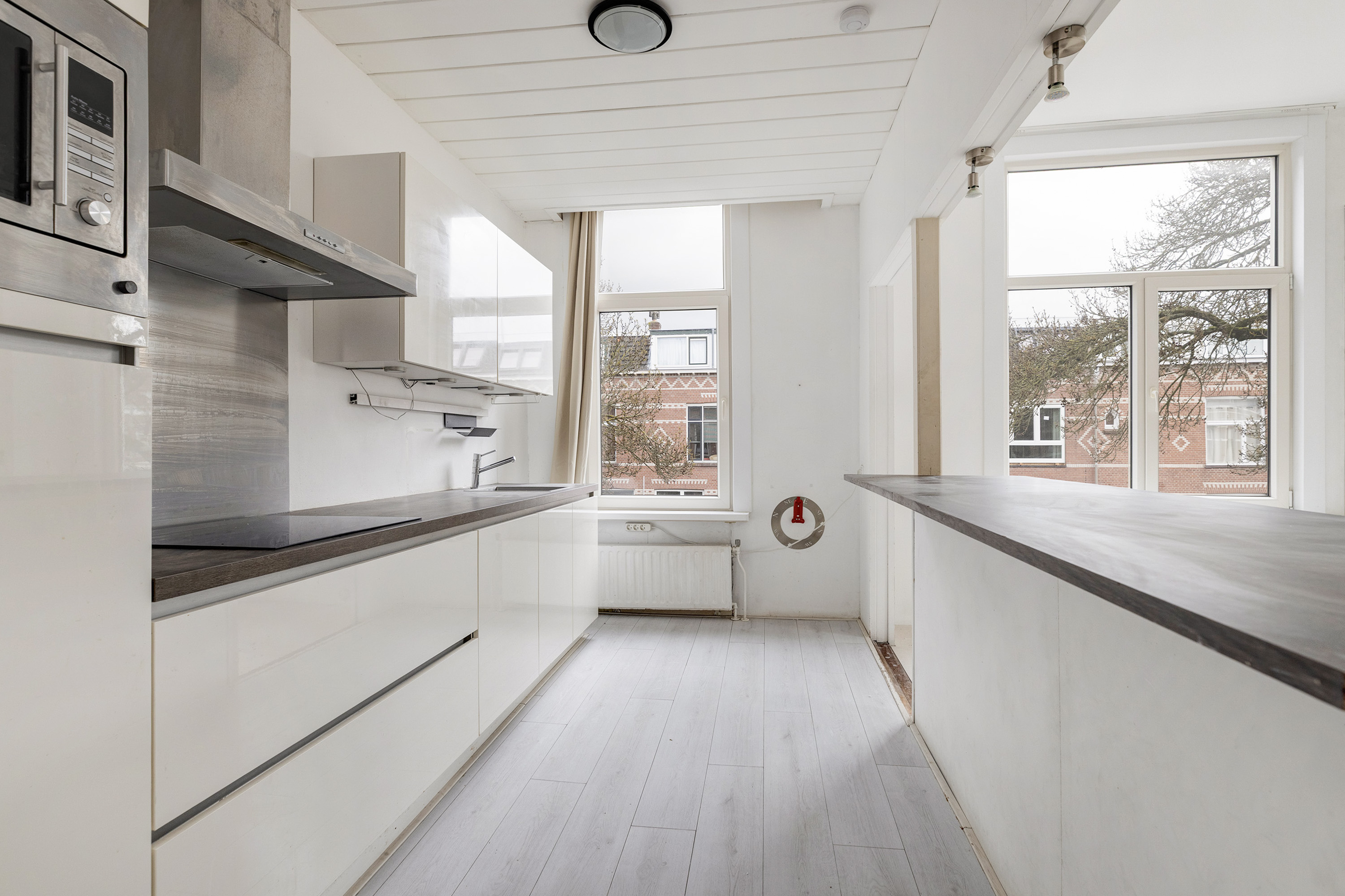 De keuken ligt aan de achterzijde en is praktisch ingericht met voldoende werkruimte. Op deze verdieping bevindt zich tevens een separaat toilet. Vanuit de overloop is er toegang tot het royale dakterras, gelegen op het zuidwesten – een heerlijke plek om te ontspannen en te genieten van de zon.