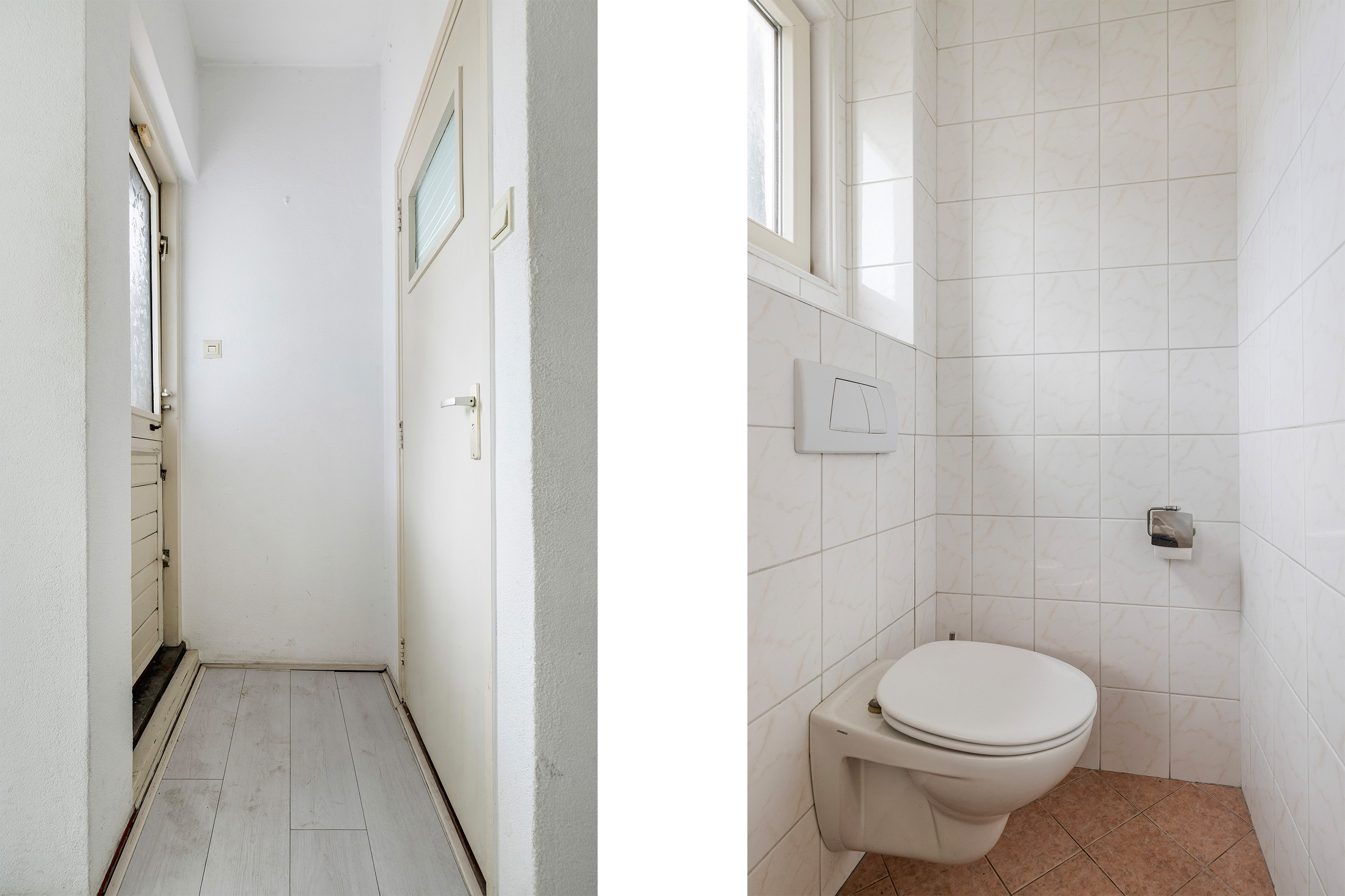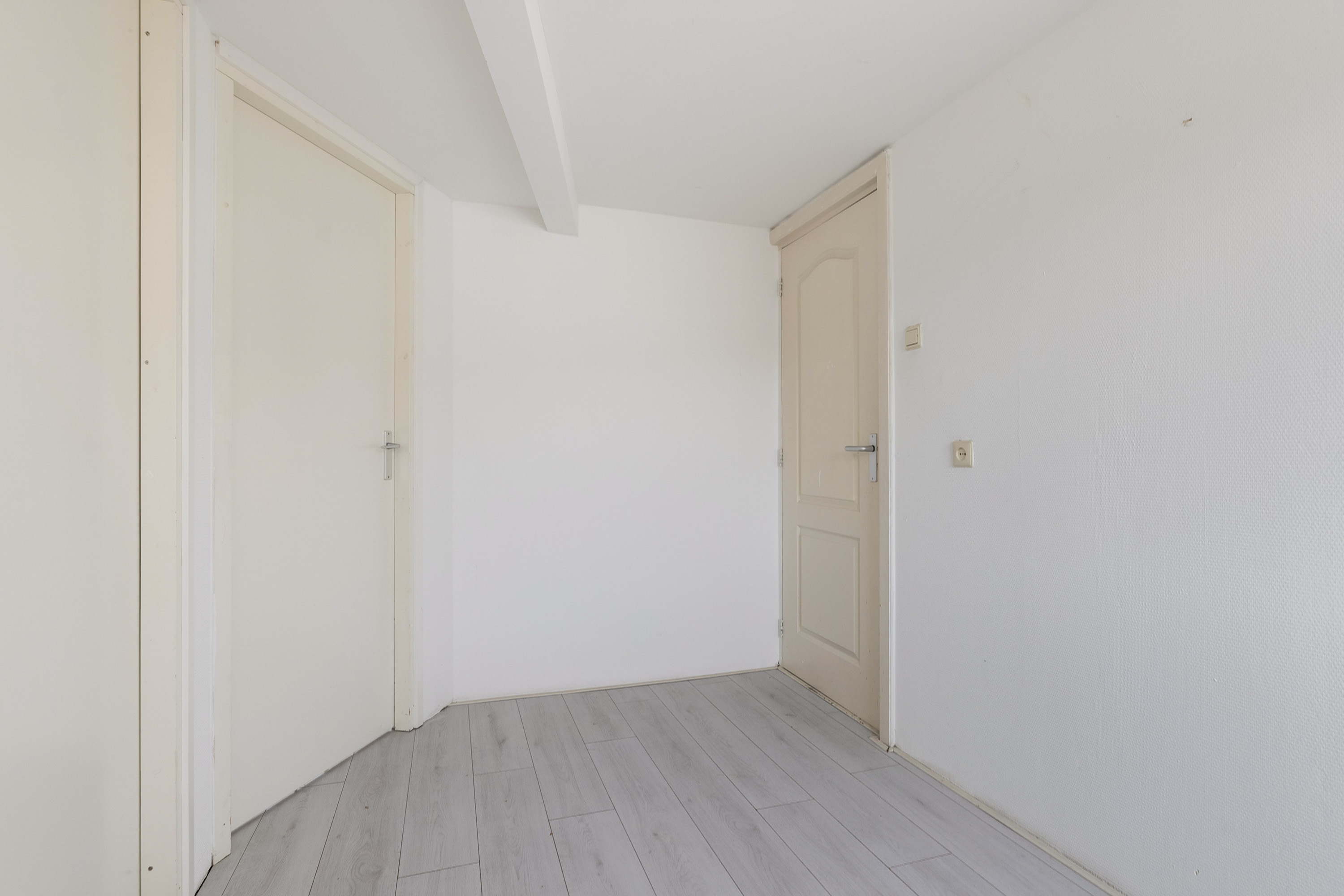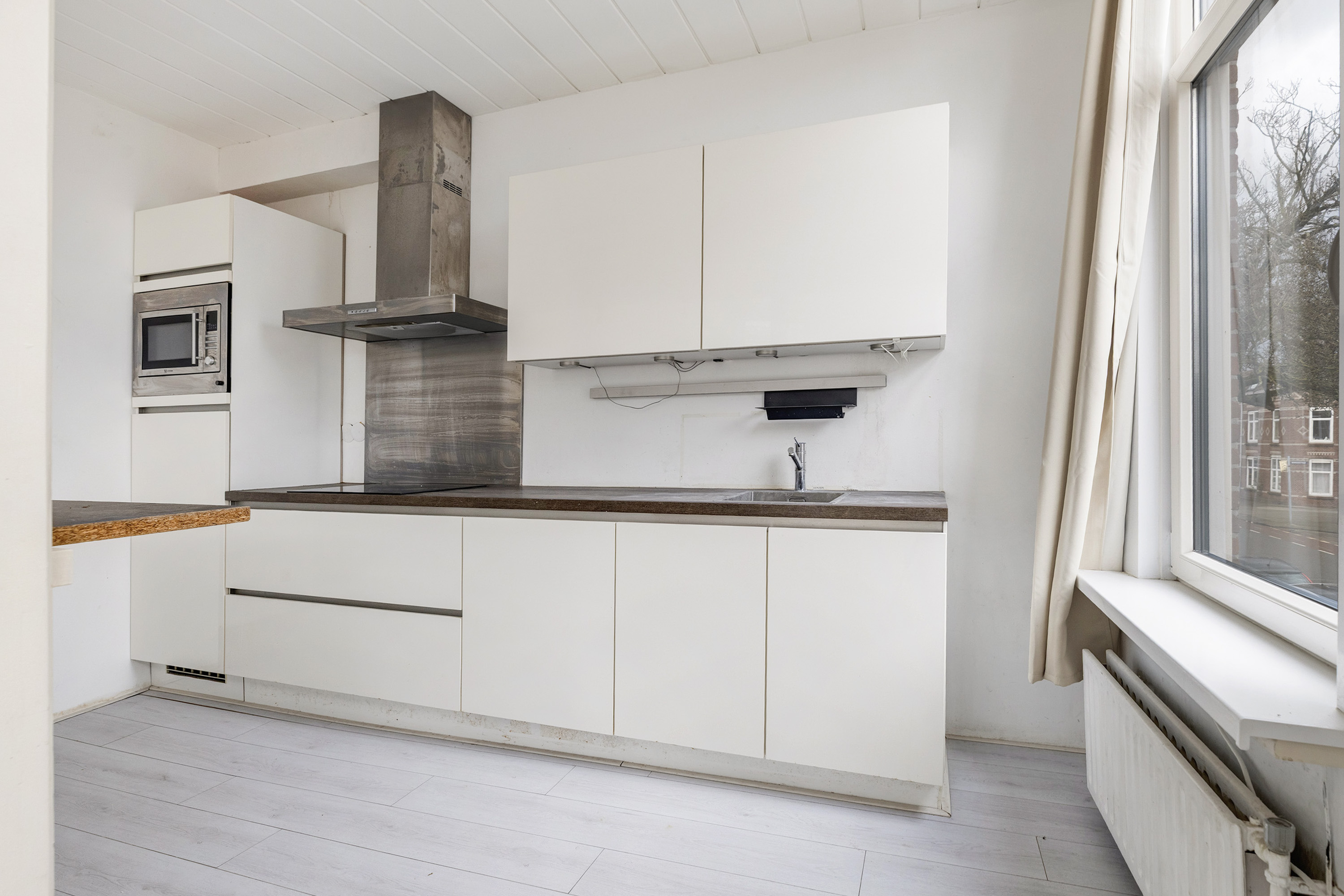 De keuken ligt aan de achterzijde en is praktisch ingericht met voldoende werkruimte. Op deze verdieping bevindt zich tevens een separaat toilet. Vanuit de overloop is er toegang tot het royale dakterras, gelegen op het zuidwesten – een heerlijke plek om te ontspannen en te genieten van de zon.