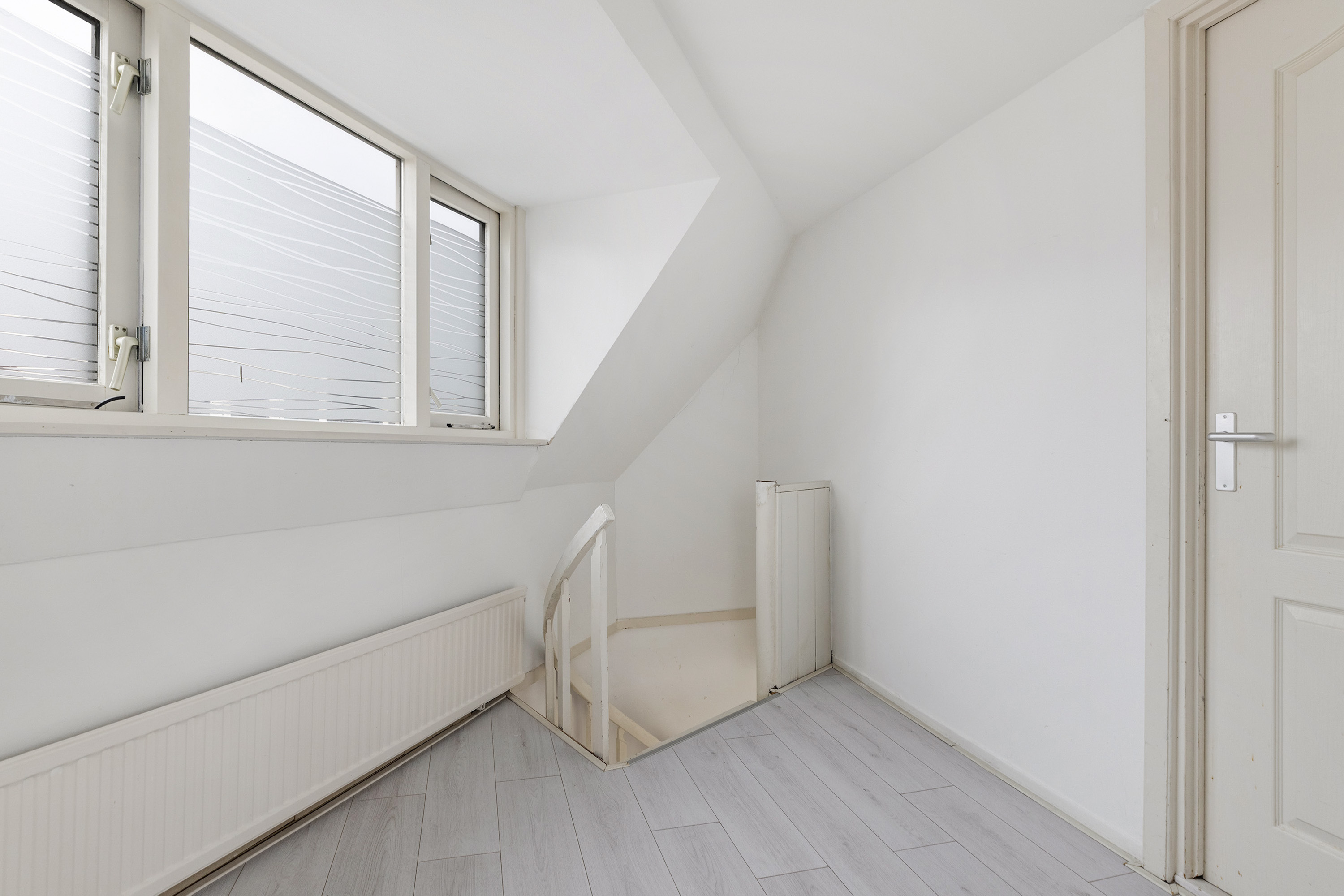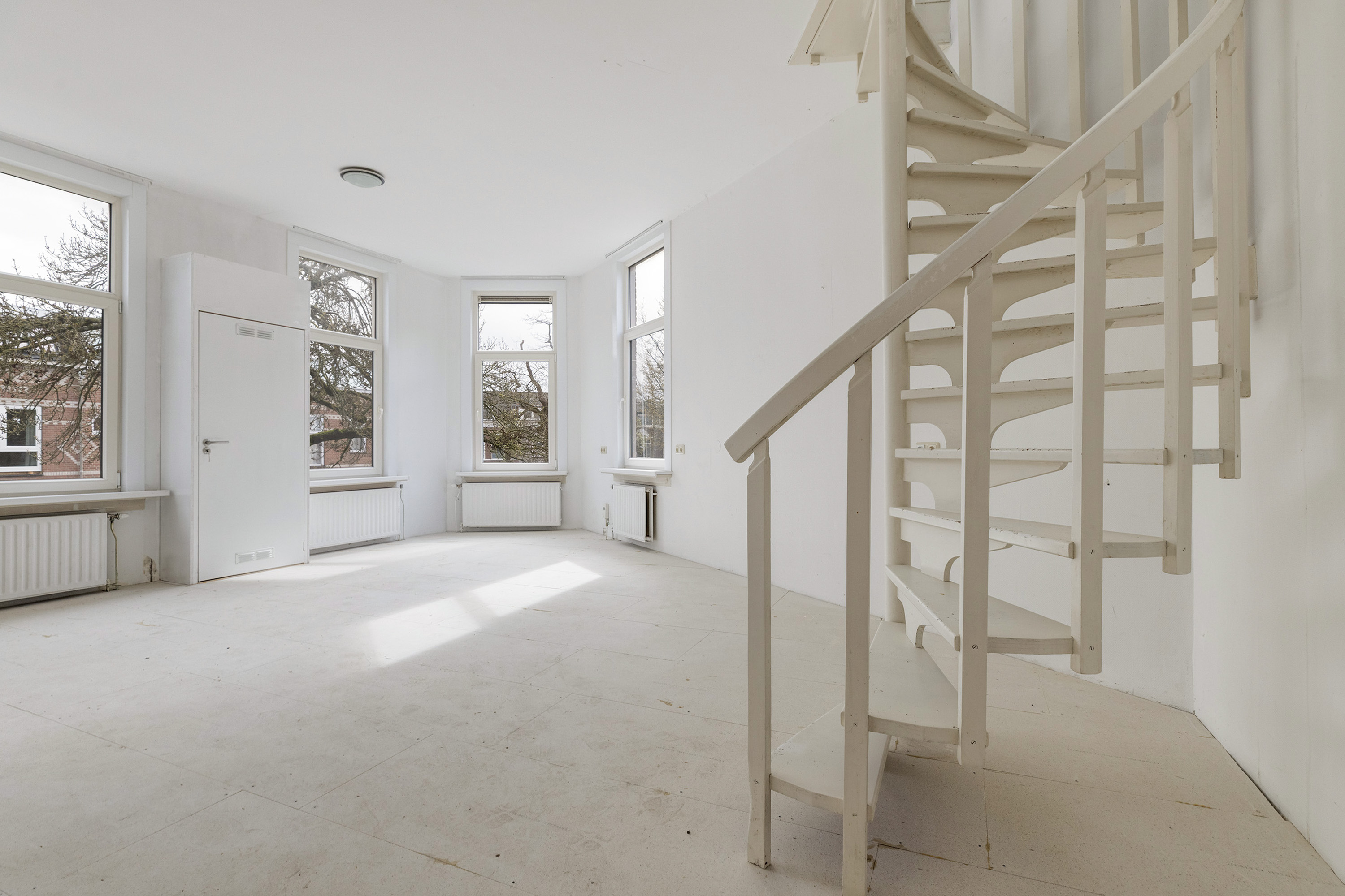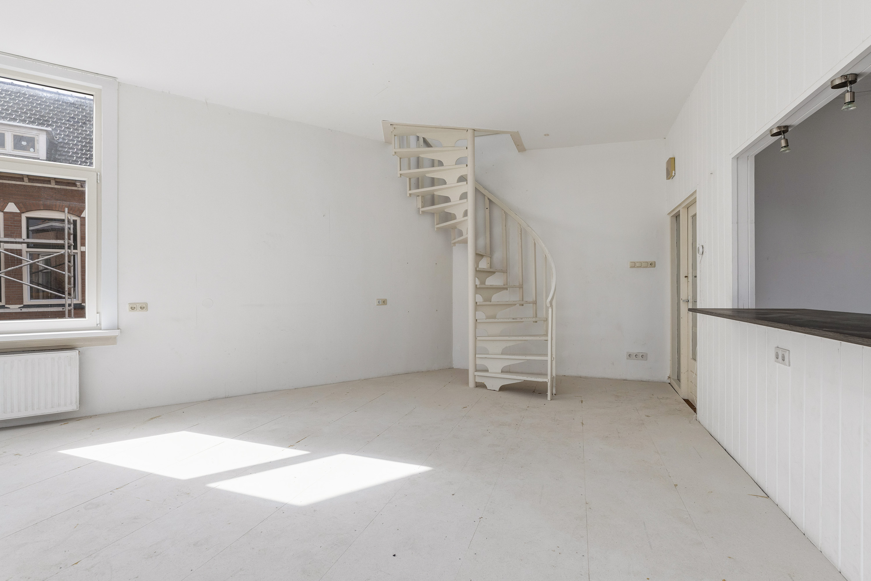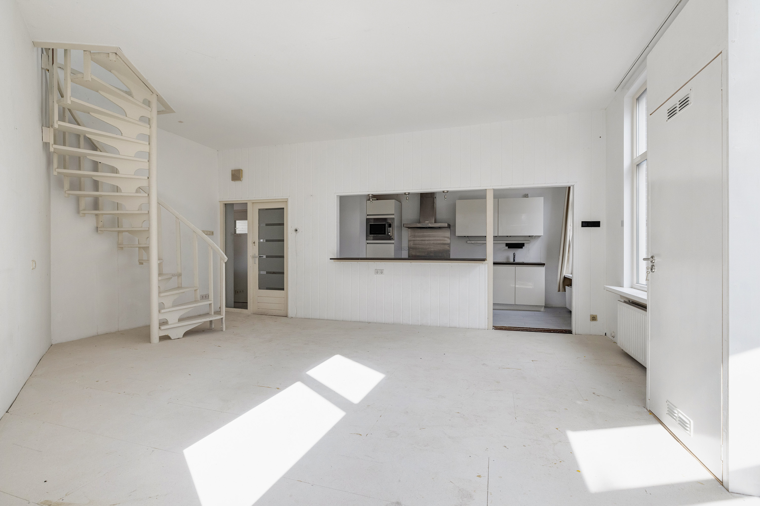 Via de entree op de begane grond bereik je de woning en kom je op de overloop van de eerste verdieping. Hier vind je de ruime en lichte woonkamer, die dankzij de bijzondere vorm en grote raampartijen een prettig en open karakter heeft.