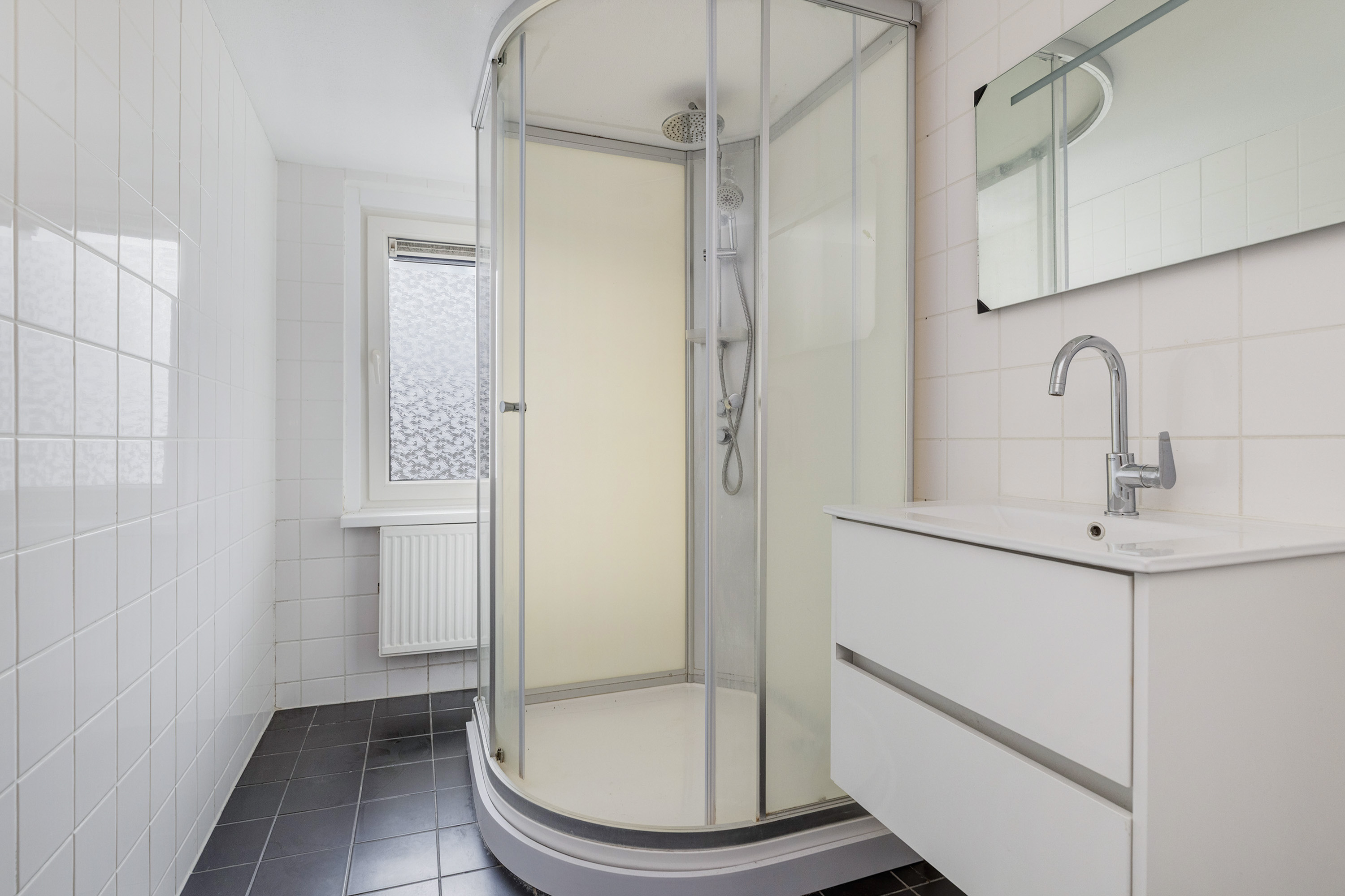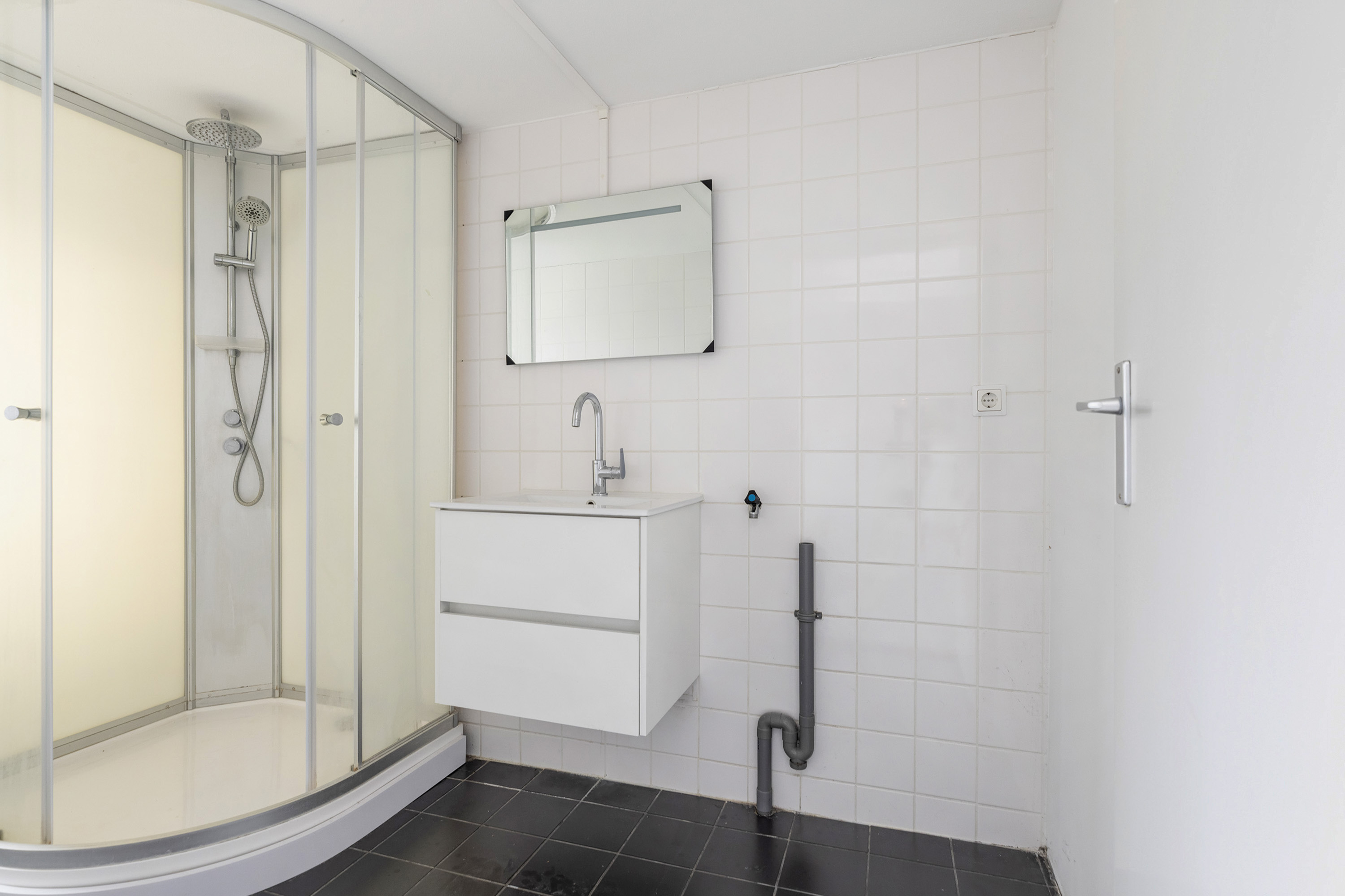 Daarnaast is er een ruime badkamer aanwezig, voorzien van een douche, wastafel en toilet.