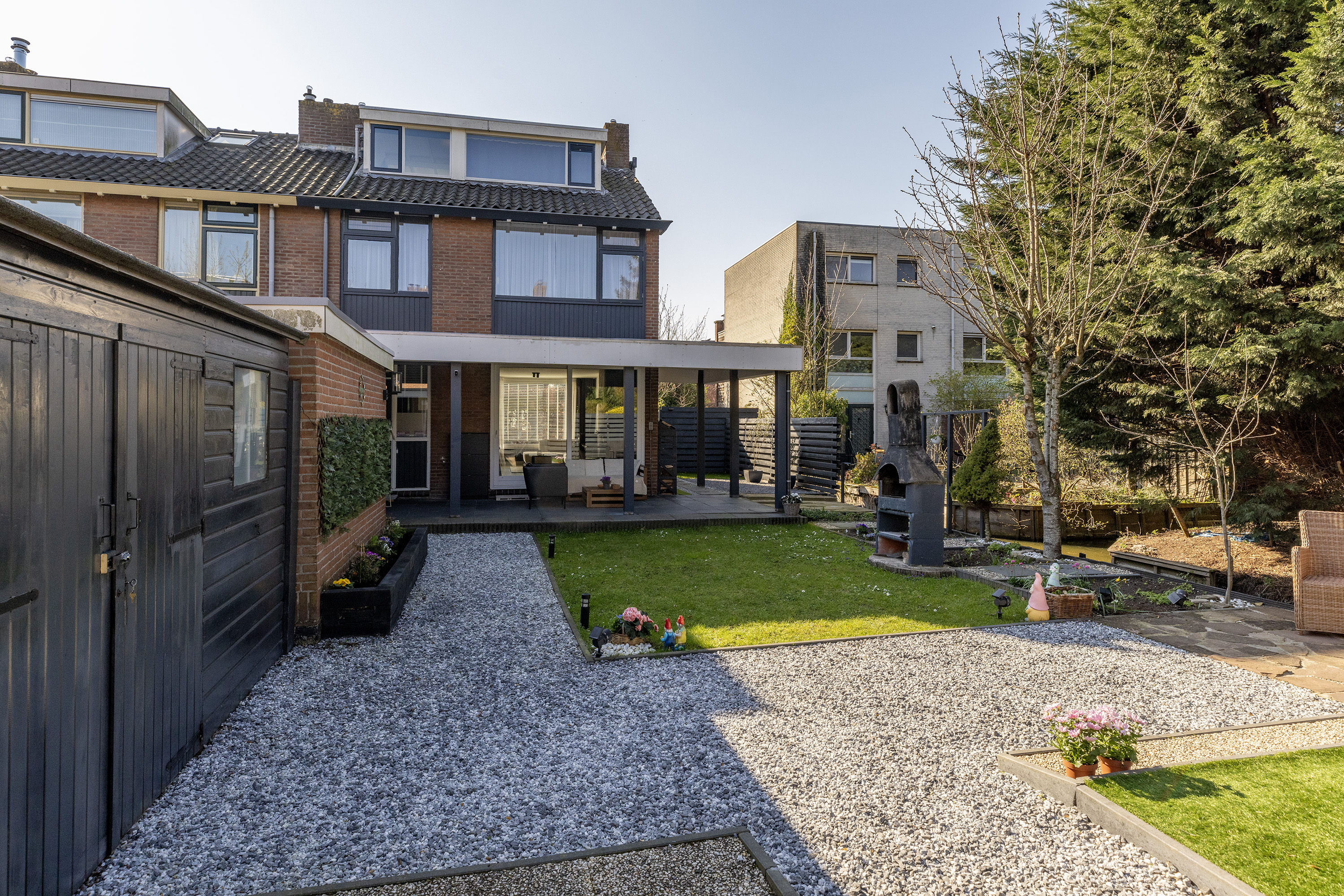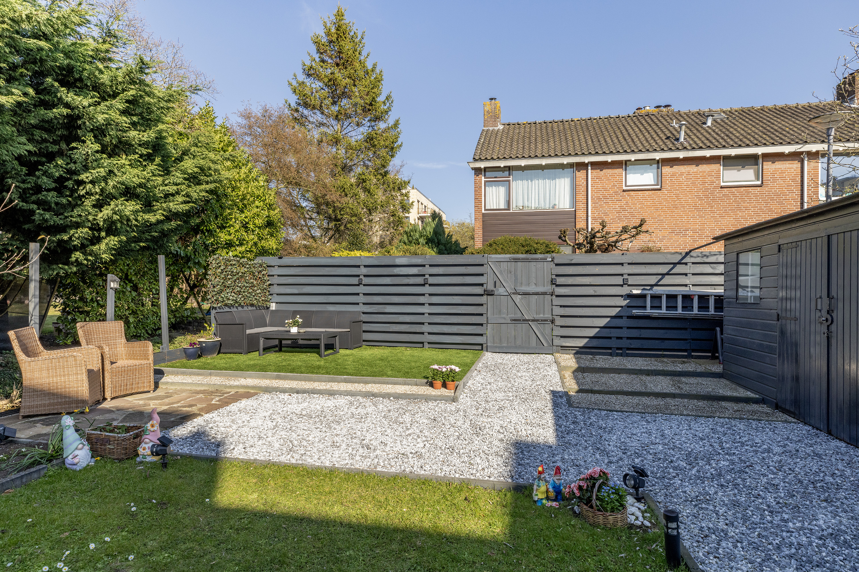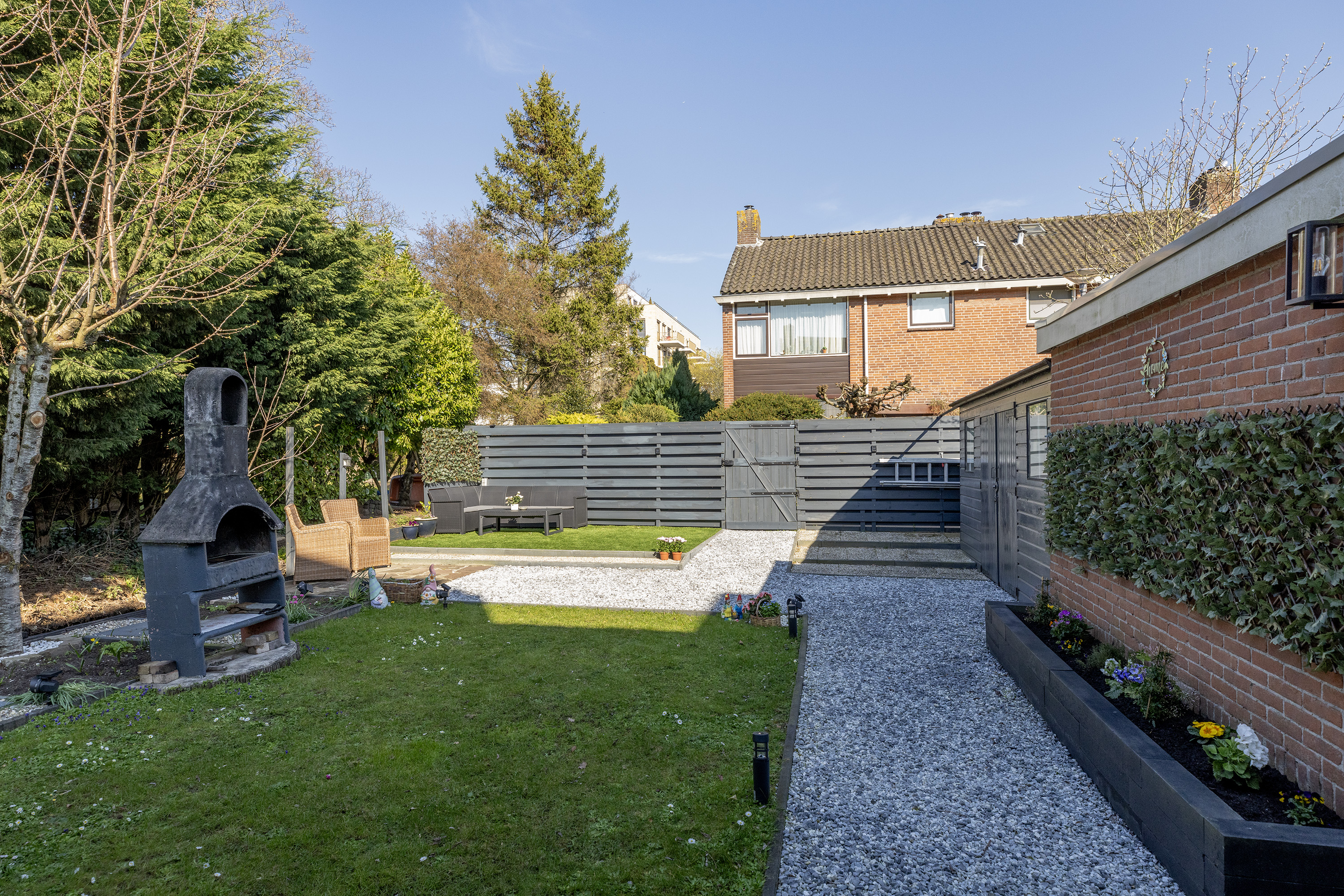 Daarnaast beschikt de tuin over twee bergingen, ideaal voor opslag van fietsen, gereedschap of tuinmeubilair.