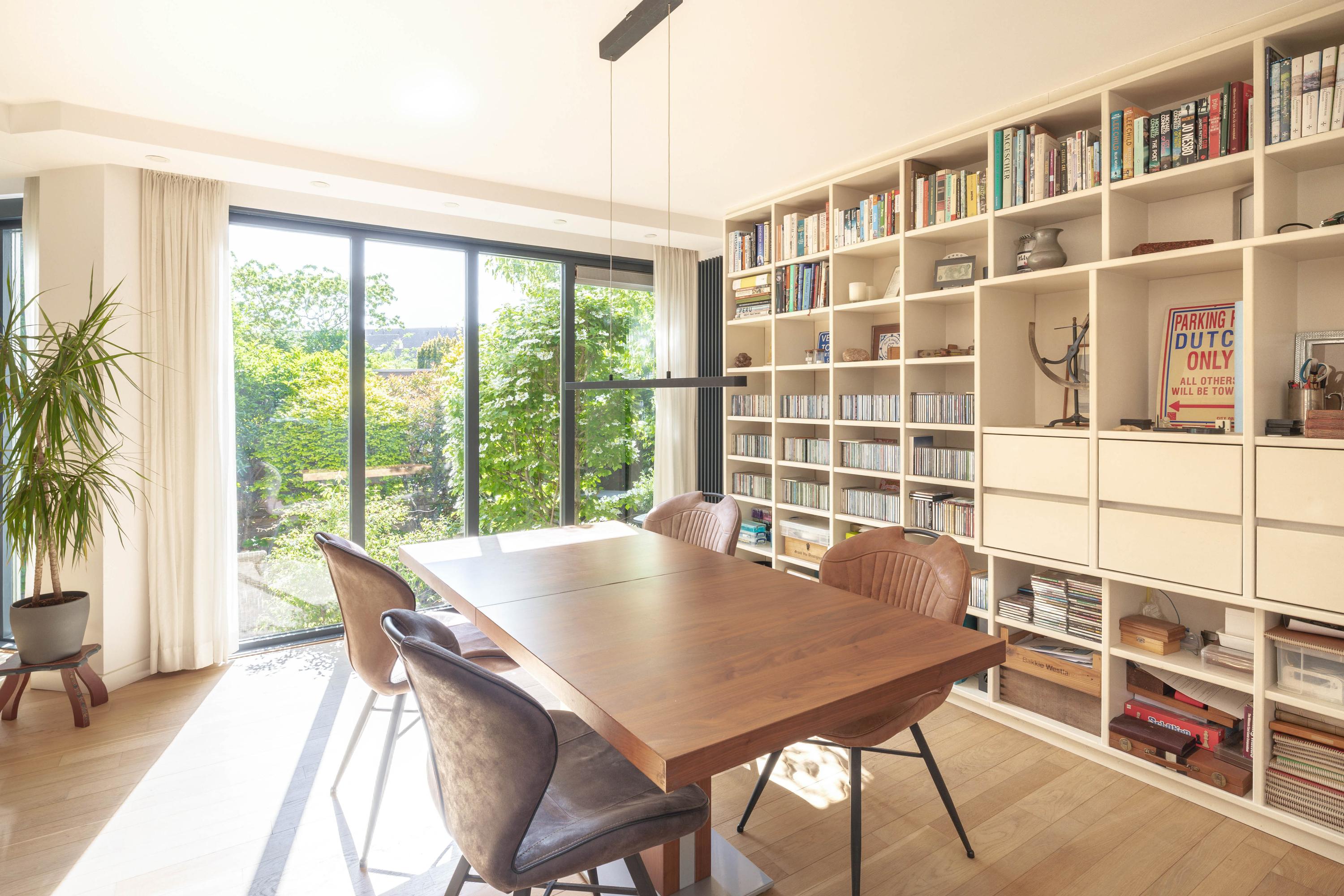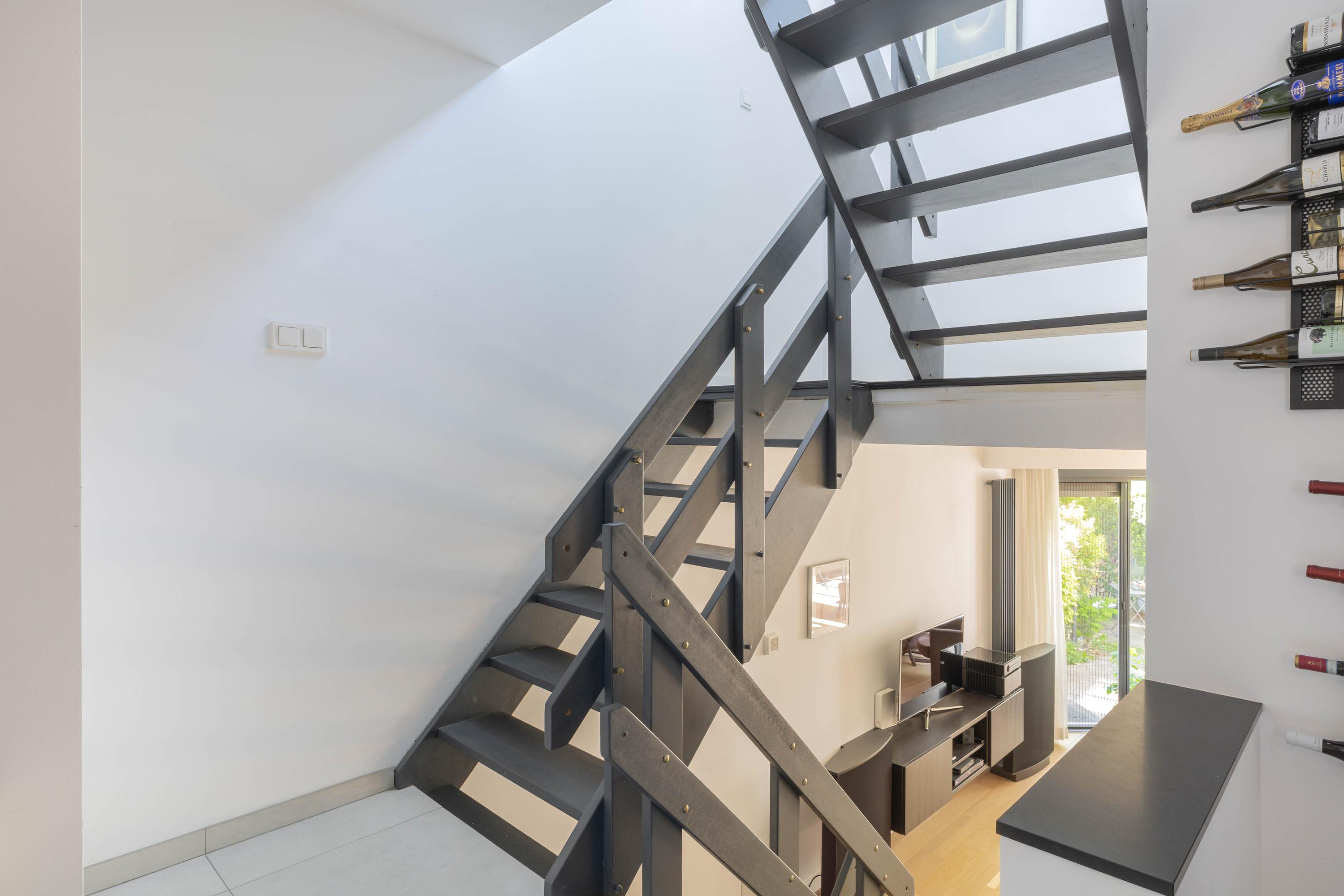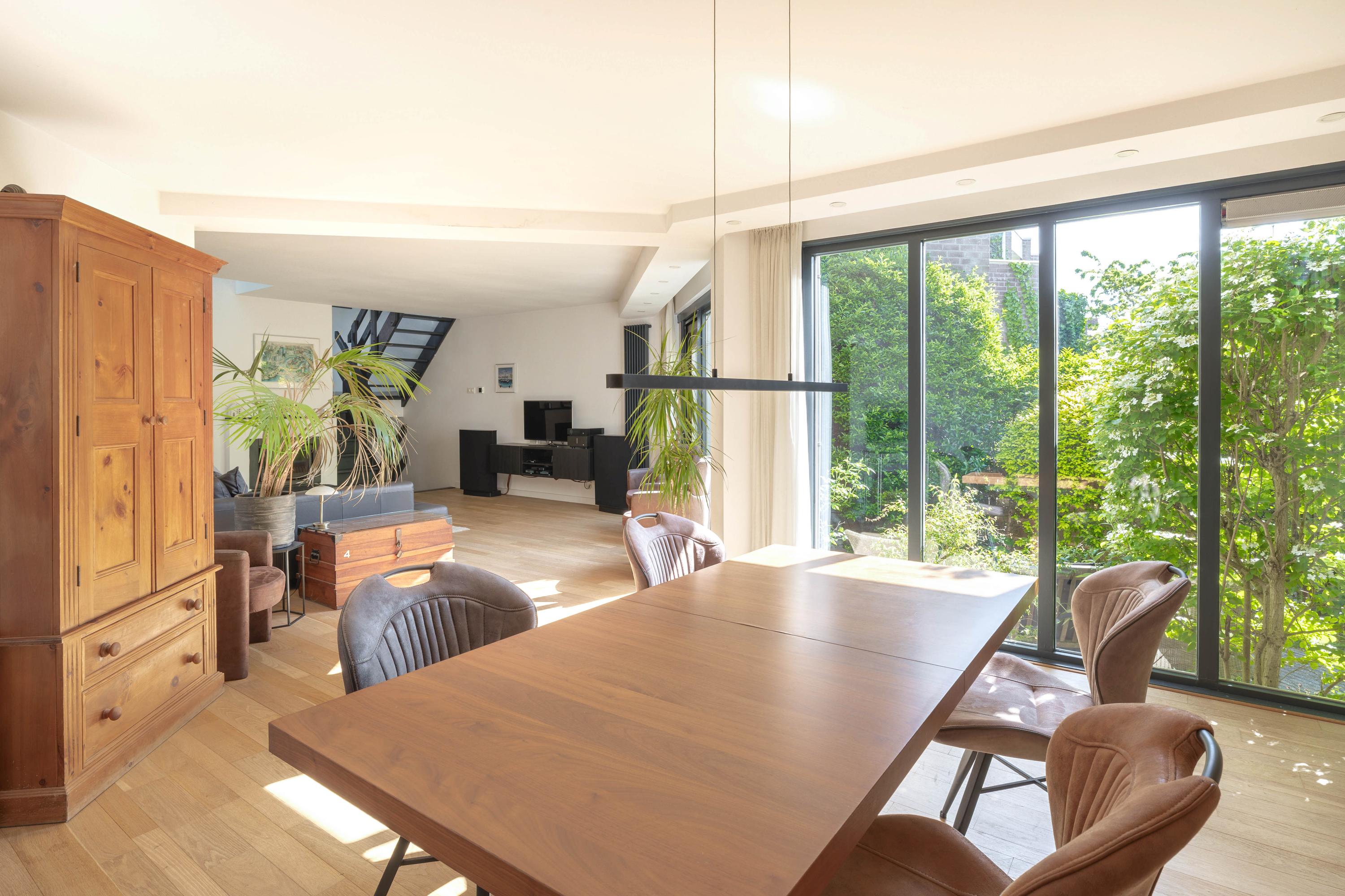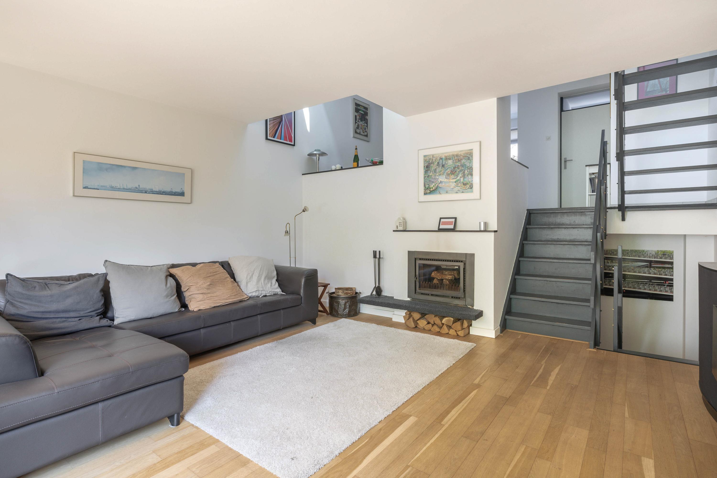 De hoofdentree ligt op de eerste verdieping. Hier kom je binnen in de sfeervolle woonkeuken (2020) met modern contrast in lichte en donkere tinten en uitgebreide inbouwapparatuur. Vanuit de woonkeuken heb je een fraai zicht op de lager gelegen woonkamer dankzij de speelse split-level indeling.