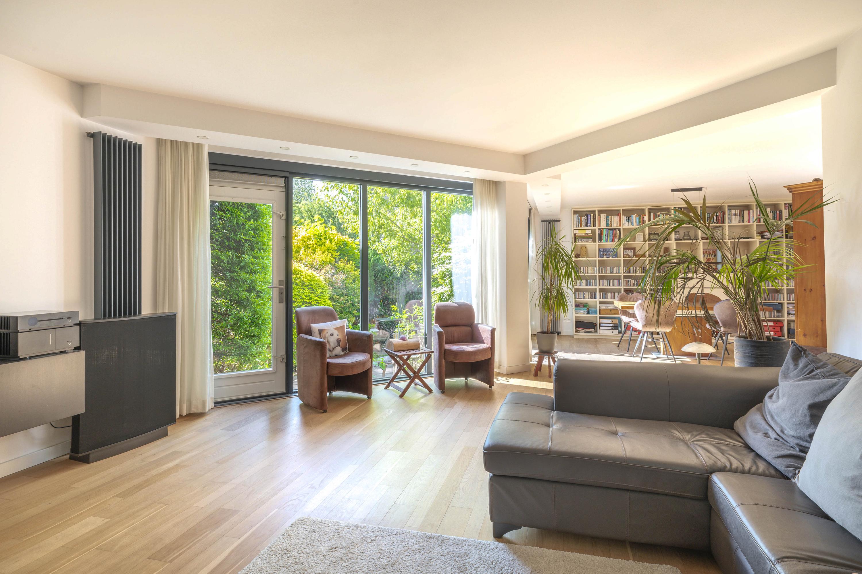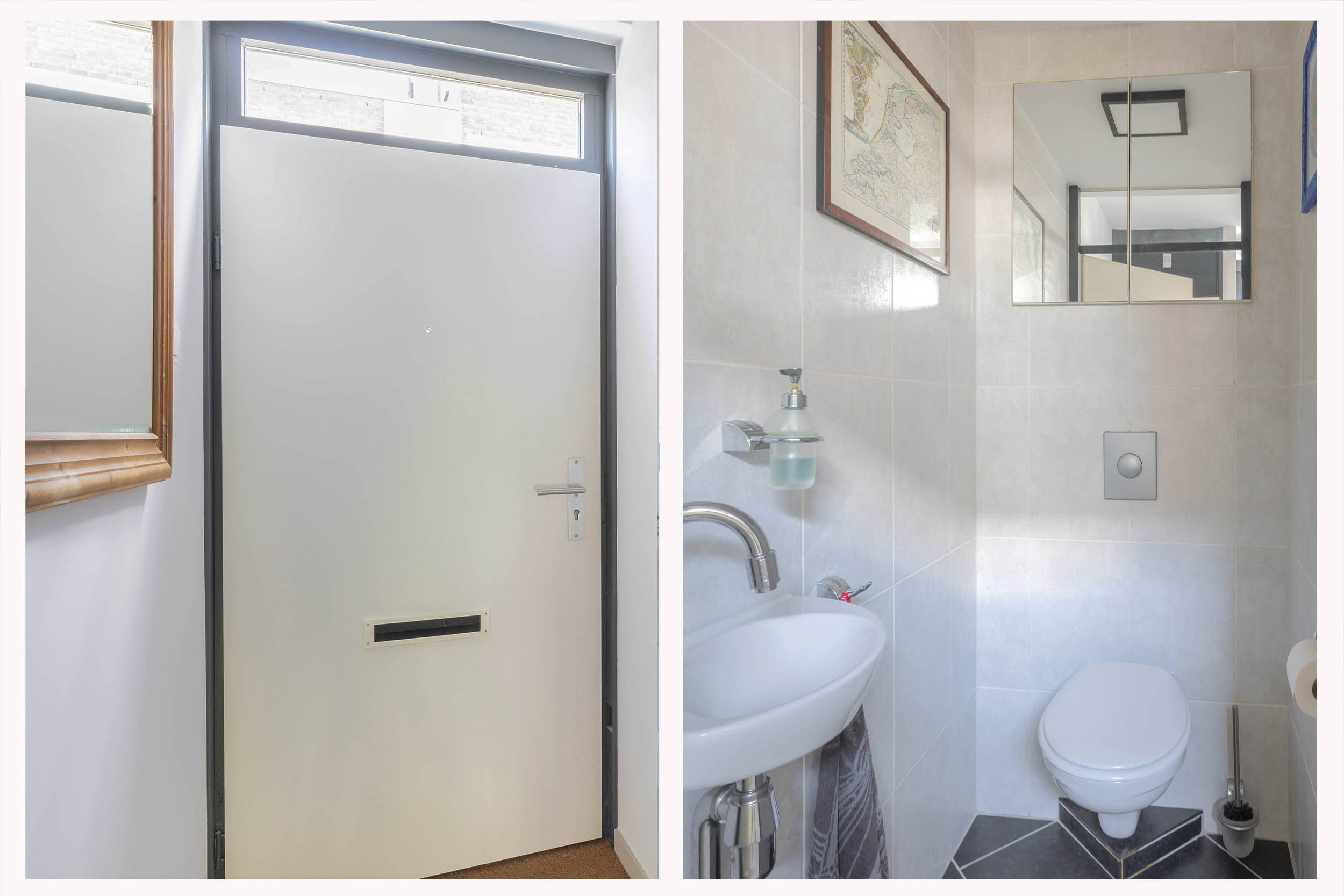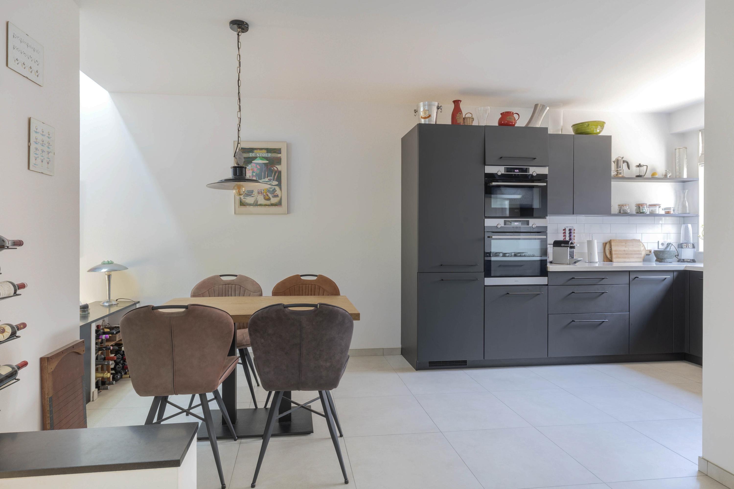 De hoofdentree ligt op de eerste verdieping. Hier kom je binnen in de sfeervolle woonkeuken (2020) met modern contrast in lichte en donkere tinten en uitgebreide inbouwapparatuur. Vanuit de woonkeuken heb je een fraai zicht op de lager gelegen woonkamer dankzij de speelse split-level indeling.