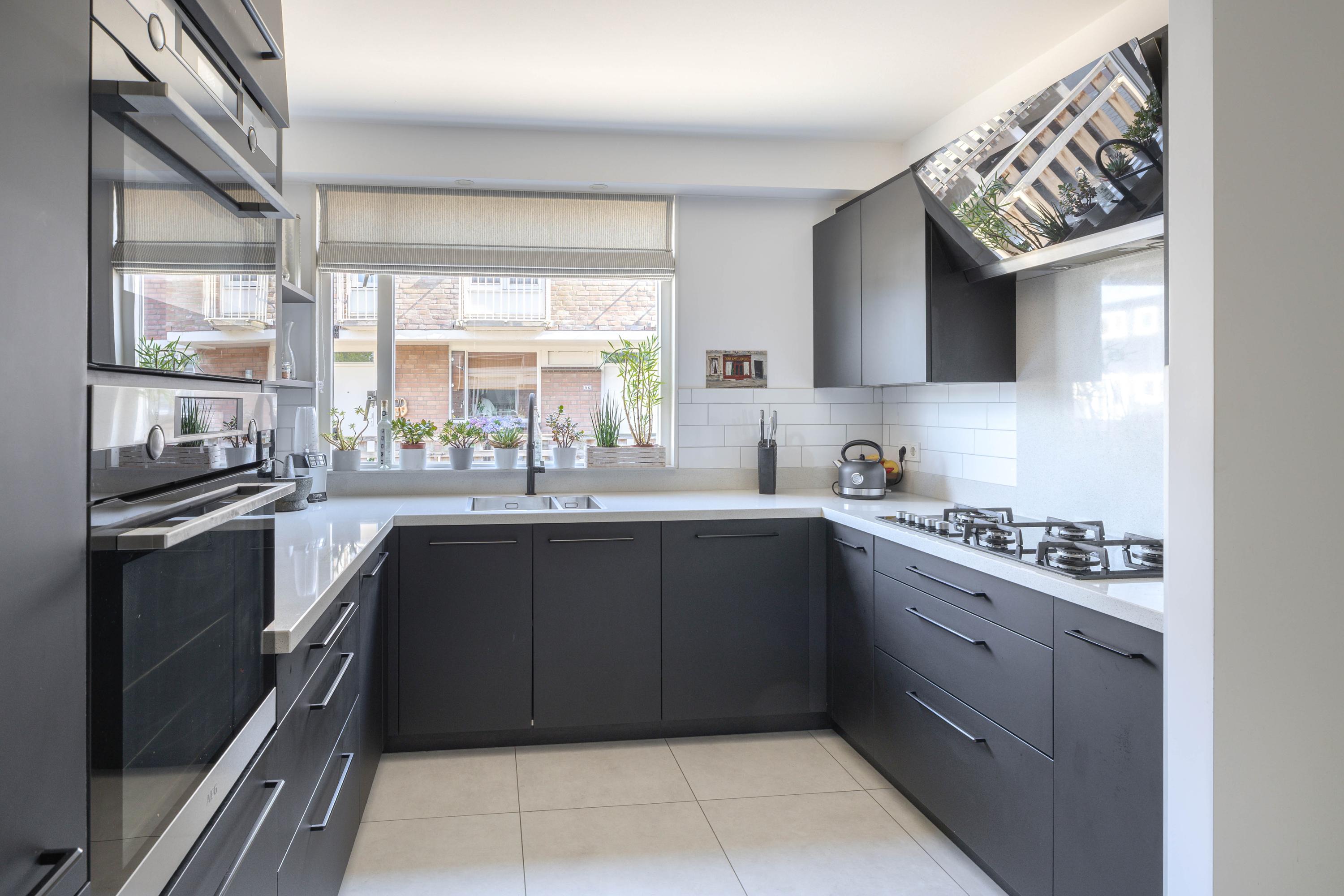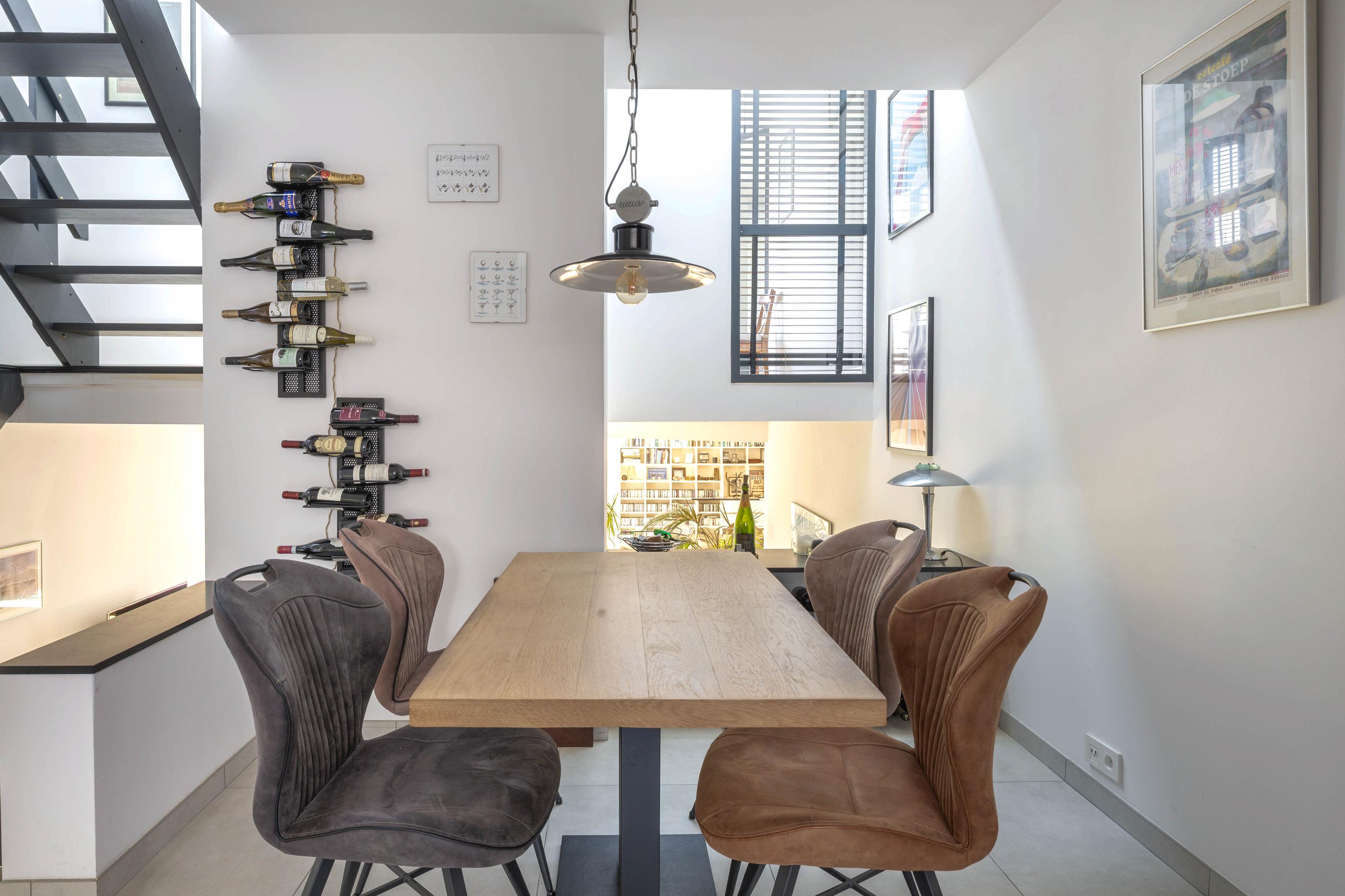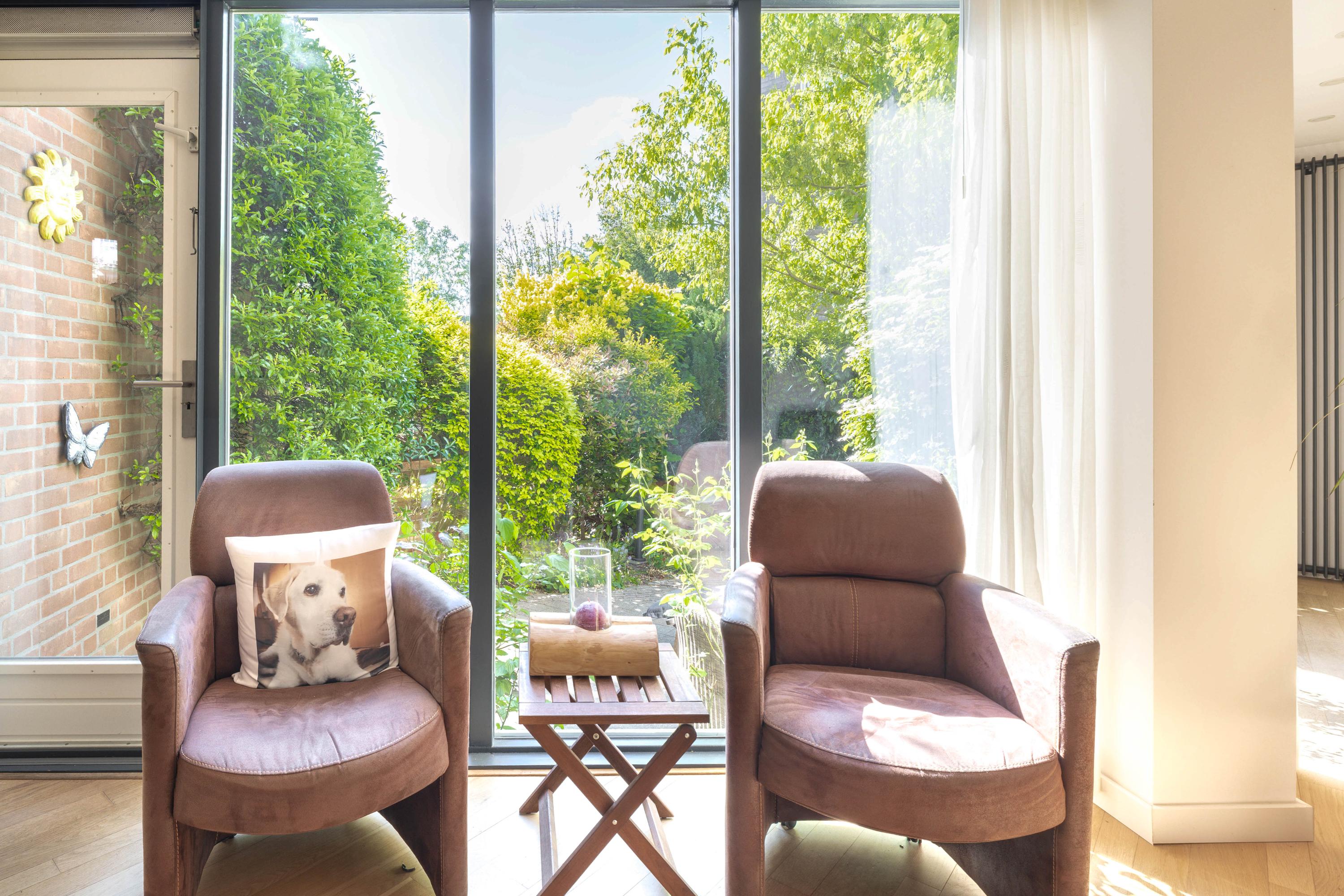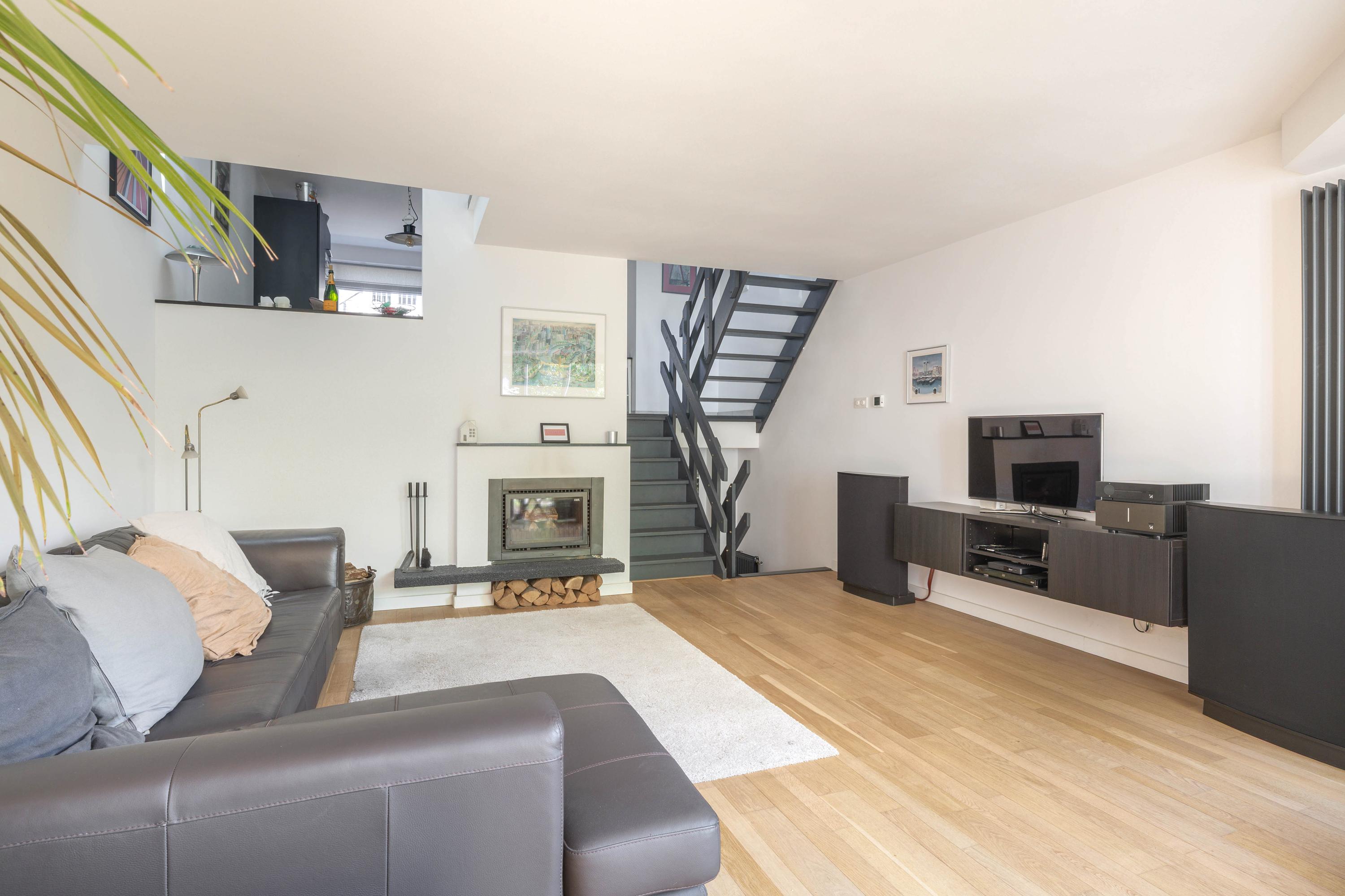 De hoofdentree ligt op de eerste verdieping. Hier kom je binnen in de sfeervolle woonkeuken (2020) met modern contrast in lichte en donkere tinten en uitgebreide inbouwapparatuur. Vanuit de woonkeuken heb je een fraai zicht op de lager gelegen woonkamer dankzij de speelse split-level indeling.