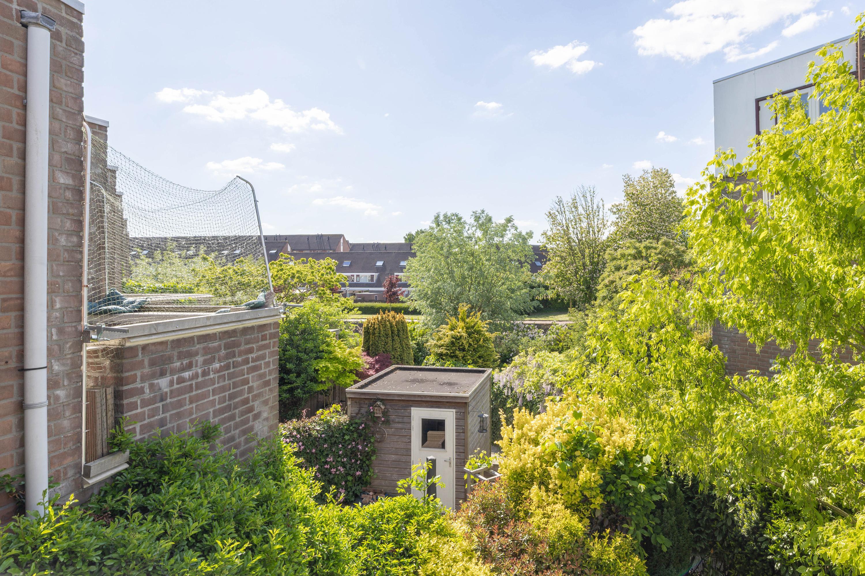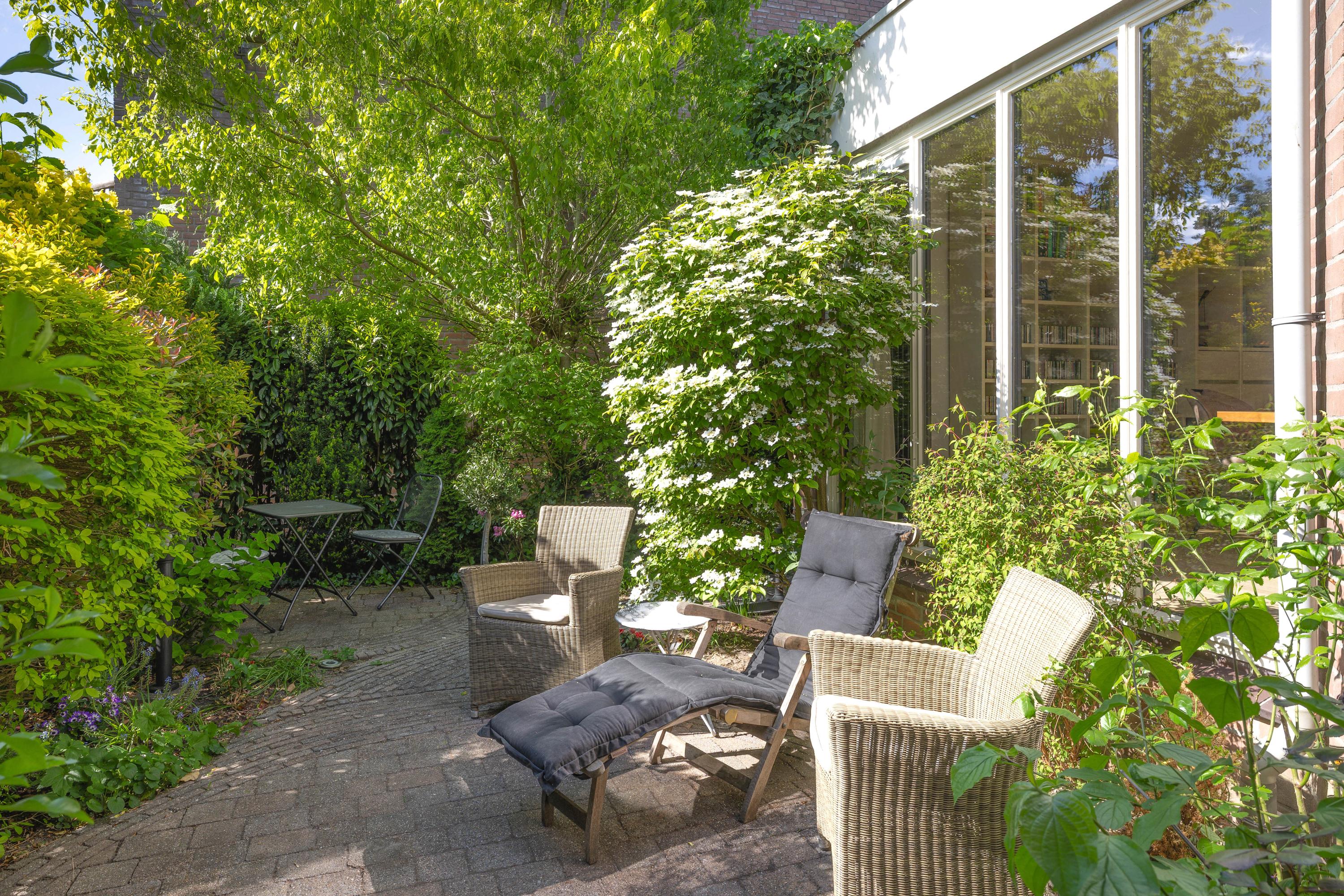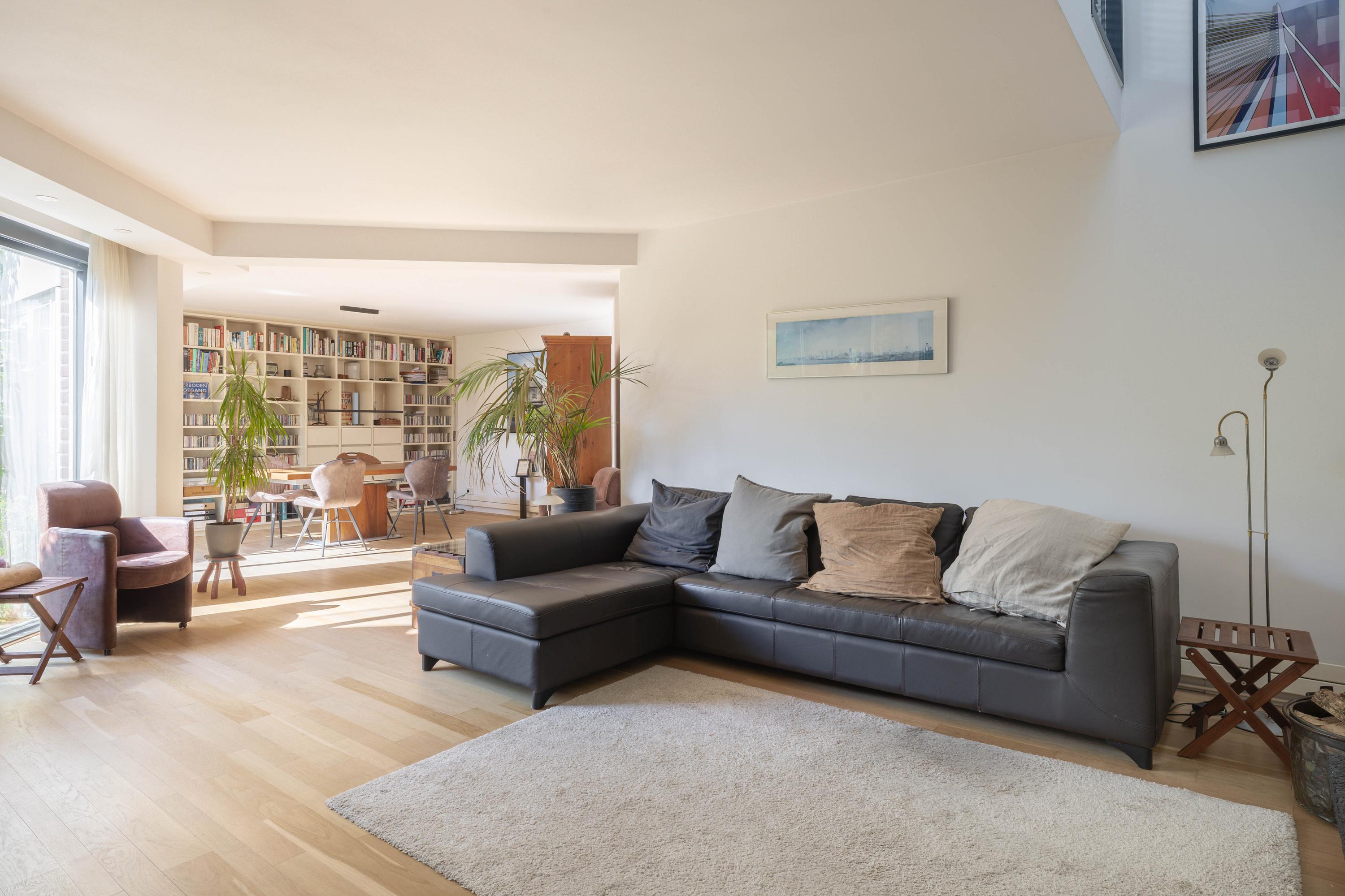 Via een korte trap bereik je de royale woonkamer (52 m²) met houten vloer, strak stucwerk en inbouwspots. Deze ruimte biedt toegang tot de zonnige achtertuin (noordwesten) waar je tot laat van de zon geniet. De tuin is voorzien van een houten berging en achterom.
