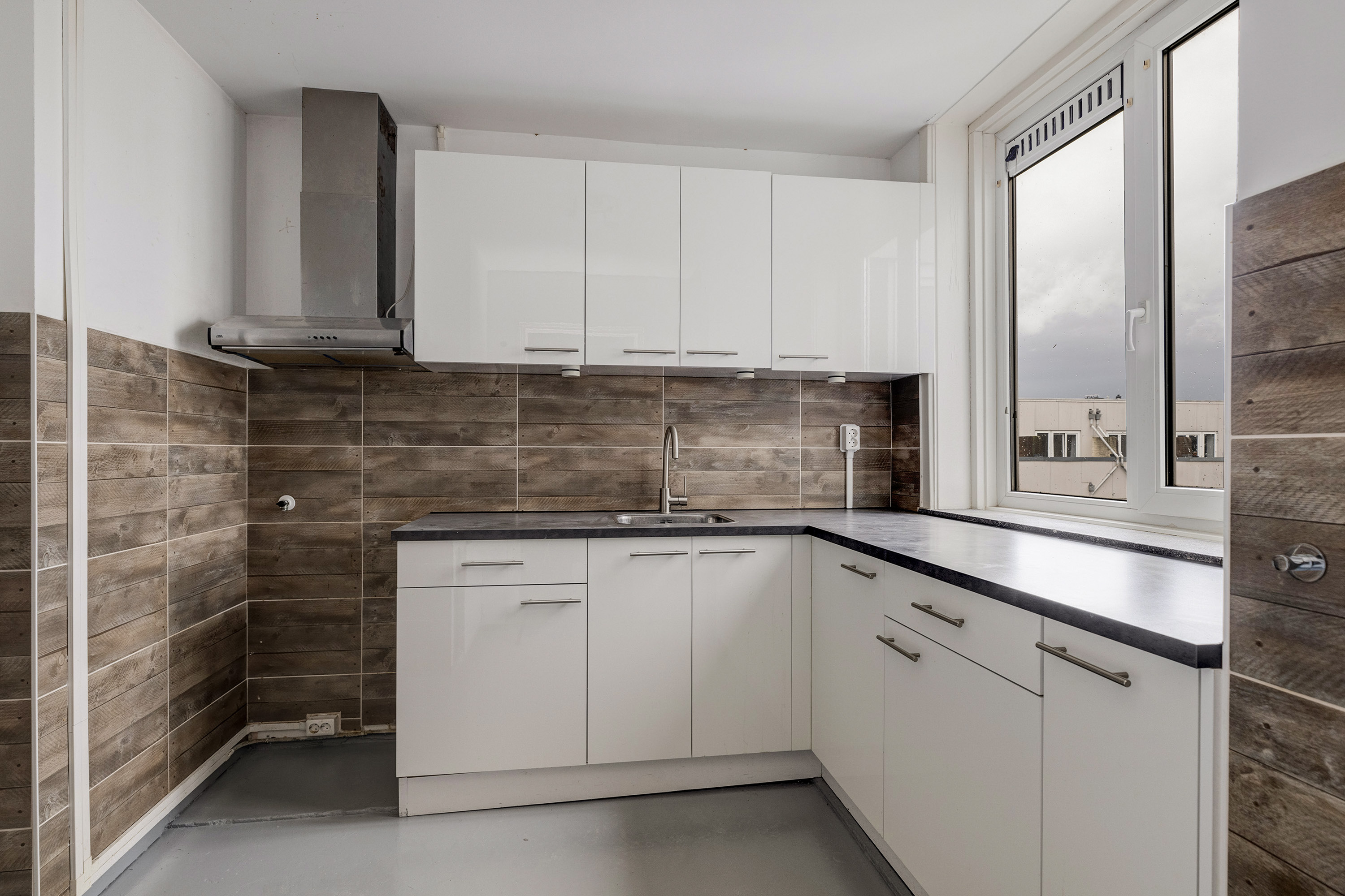 Aan de achterzijde is de keuken, de keuken is voorzien van een simpel standaard keukenblok met genoeg opties om naar eigen smaak en wens te maken.
