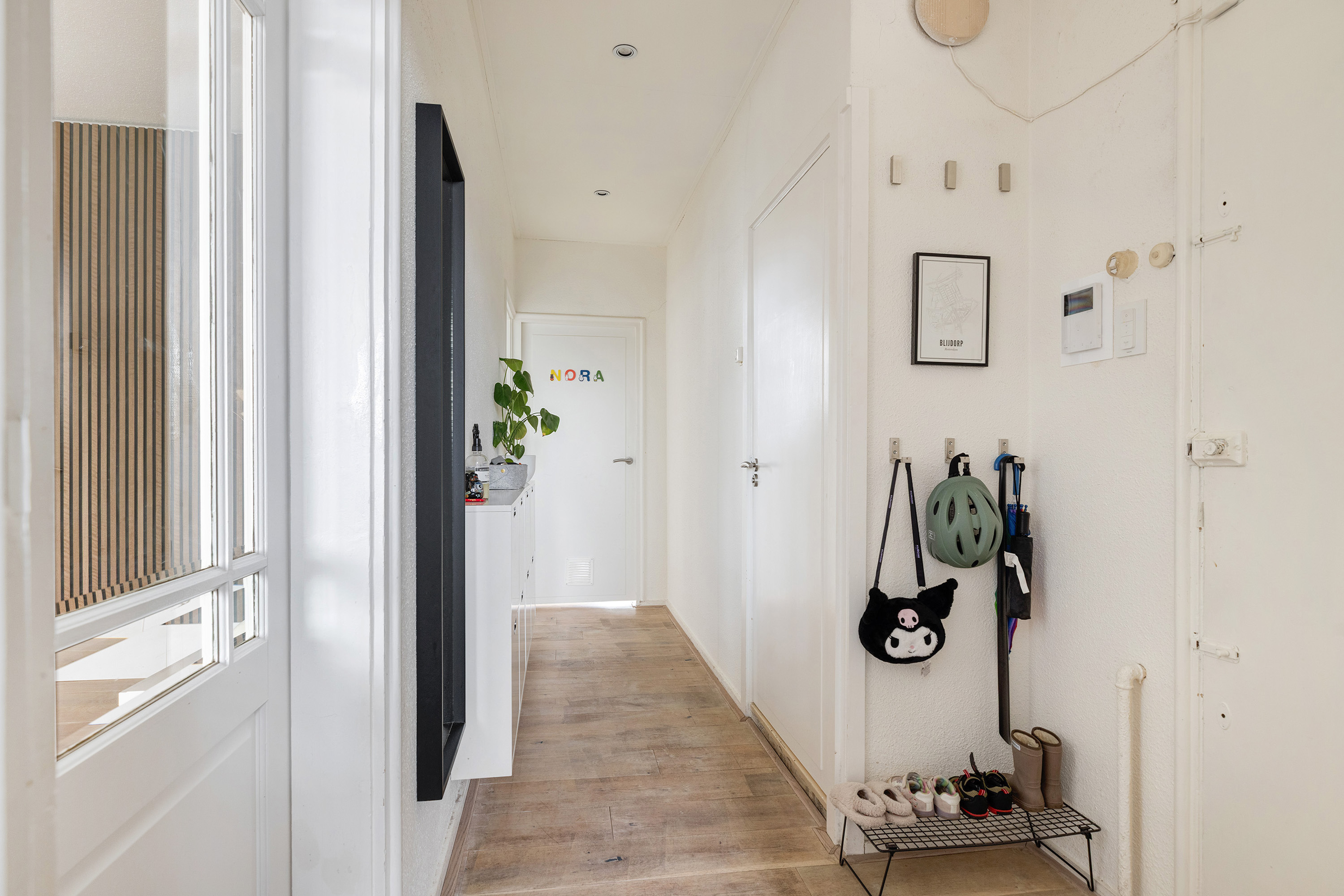 Via het verzorgde gezamenlijke trappenhuis bereikt u de entree van het appartement op de derde verdieping. De hal vormt het centrale hart van de woning en geeft toegang tot alle vertrekken.