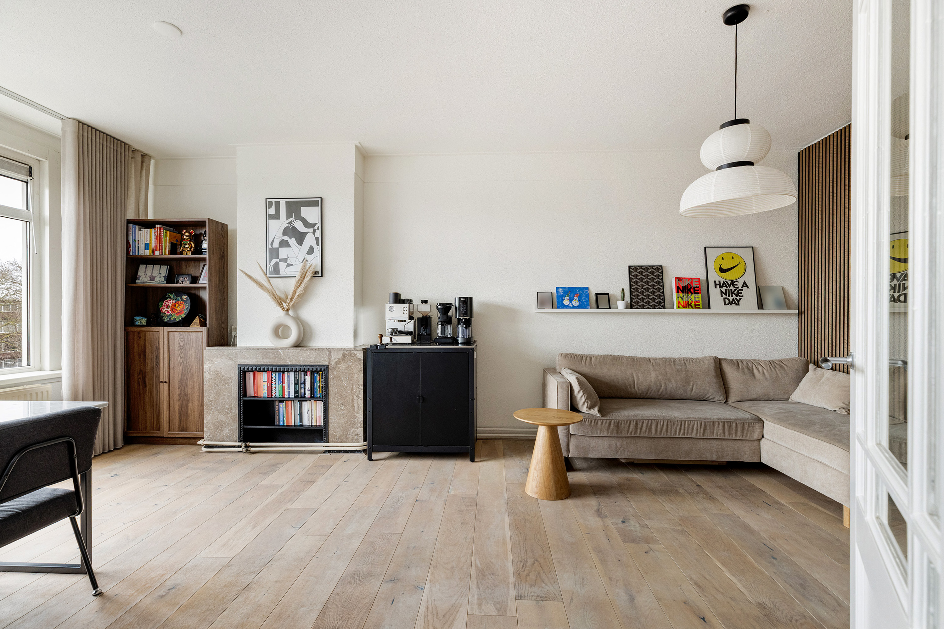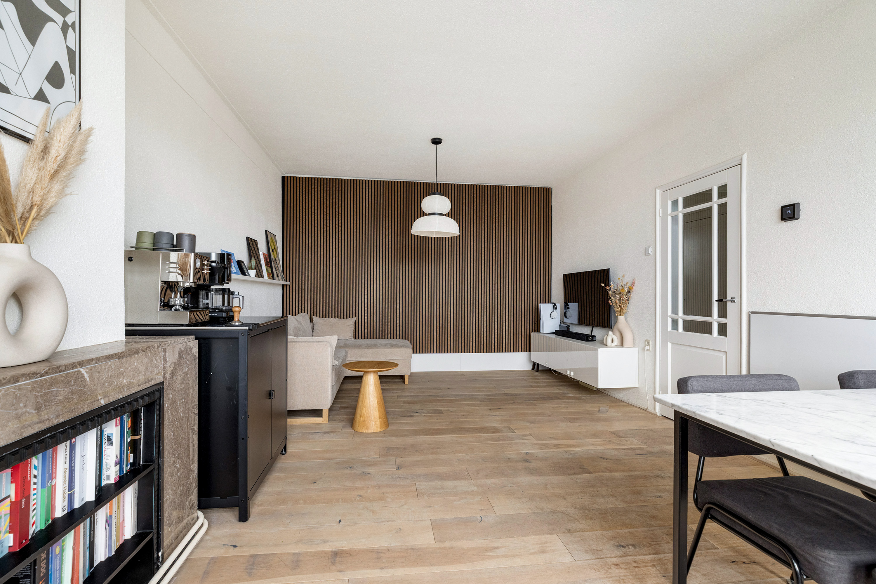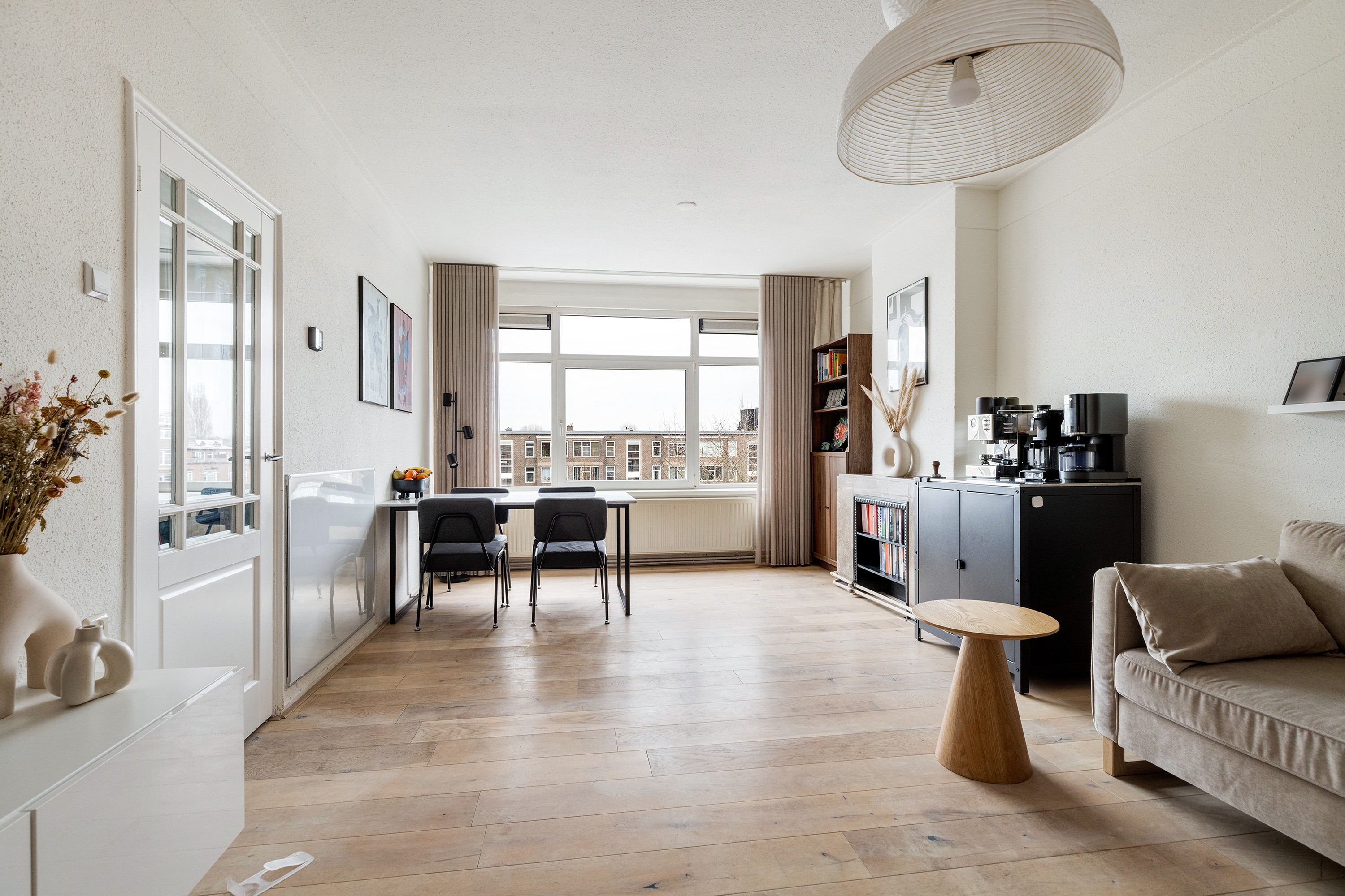 De woonkamer aan de voorzijde is heerlijk licht dankzij de grote raampartijen en biedt voldoende ruimte voor zowel een comfortabele zithoek als een royale eethoek. De hoge plafonds (ca. 2,67 m) versterken het gevoel van ruimte en zorgen voor een prettige, open sfeer. Vanuit de woonkamer kijkt u uit over de brede en groene Statenweg.