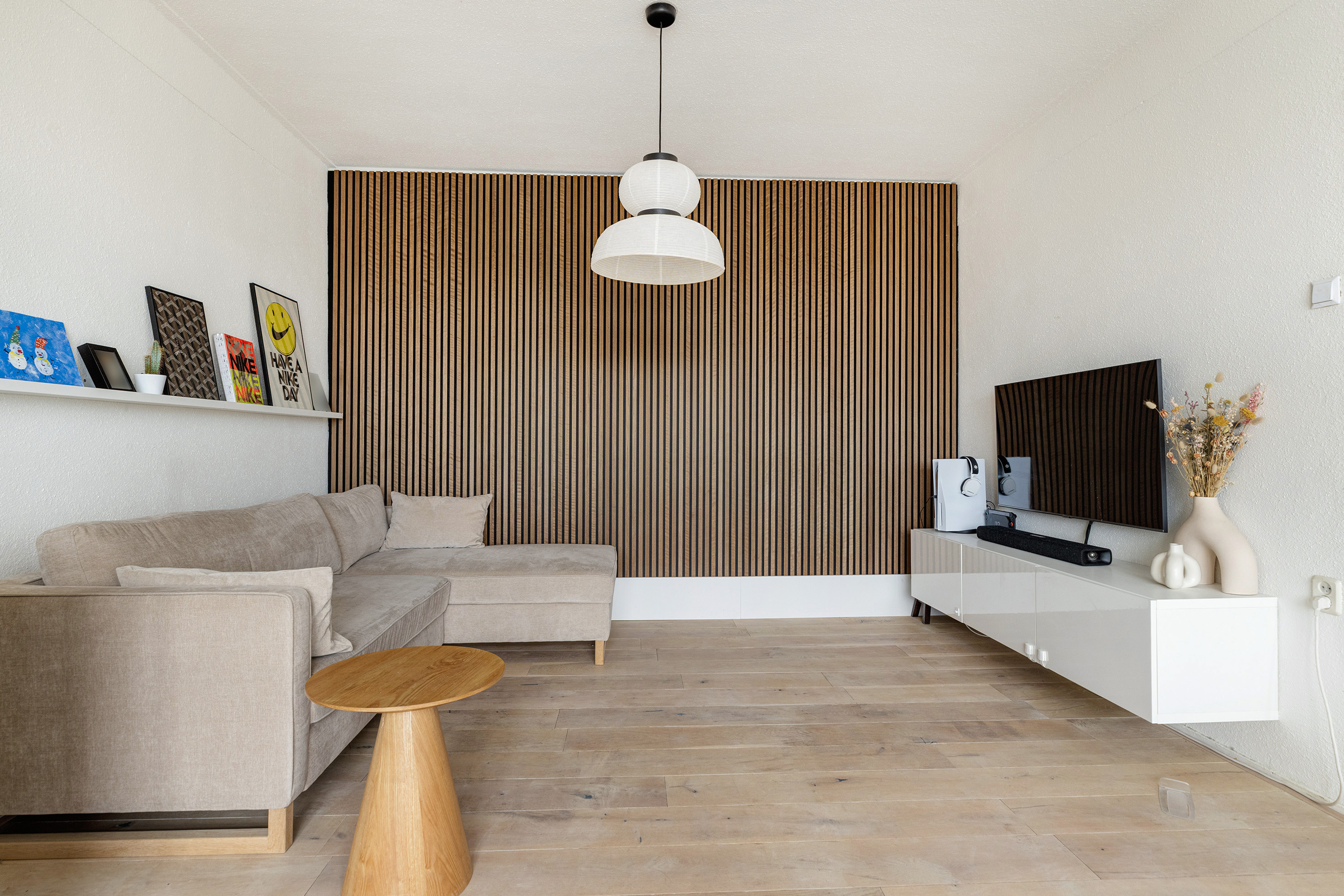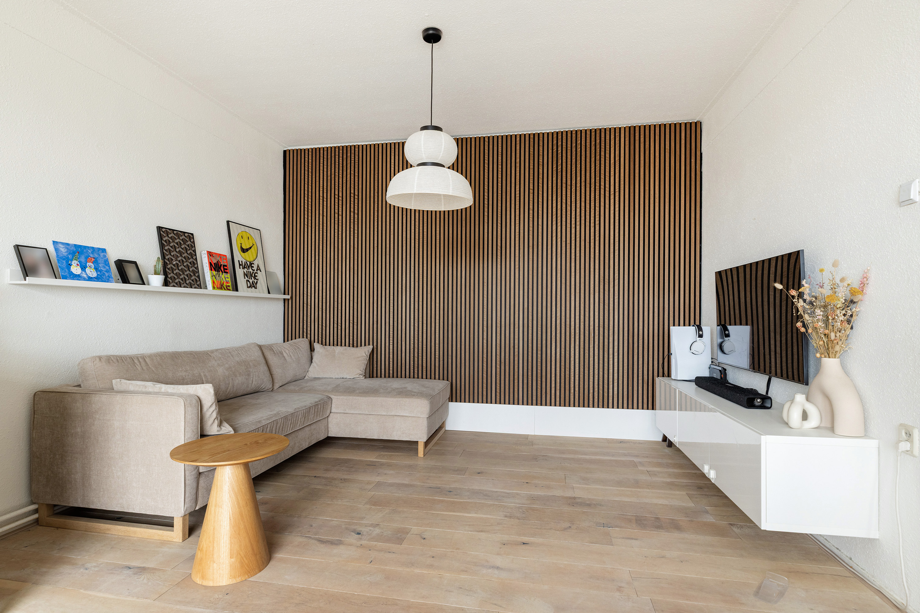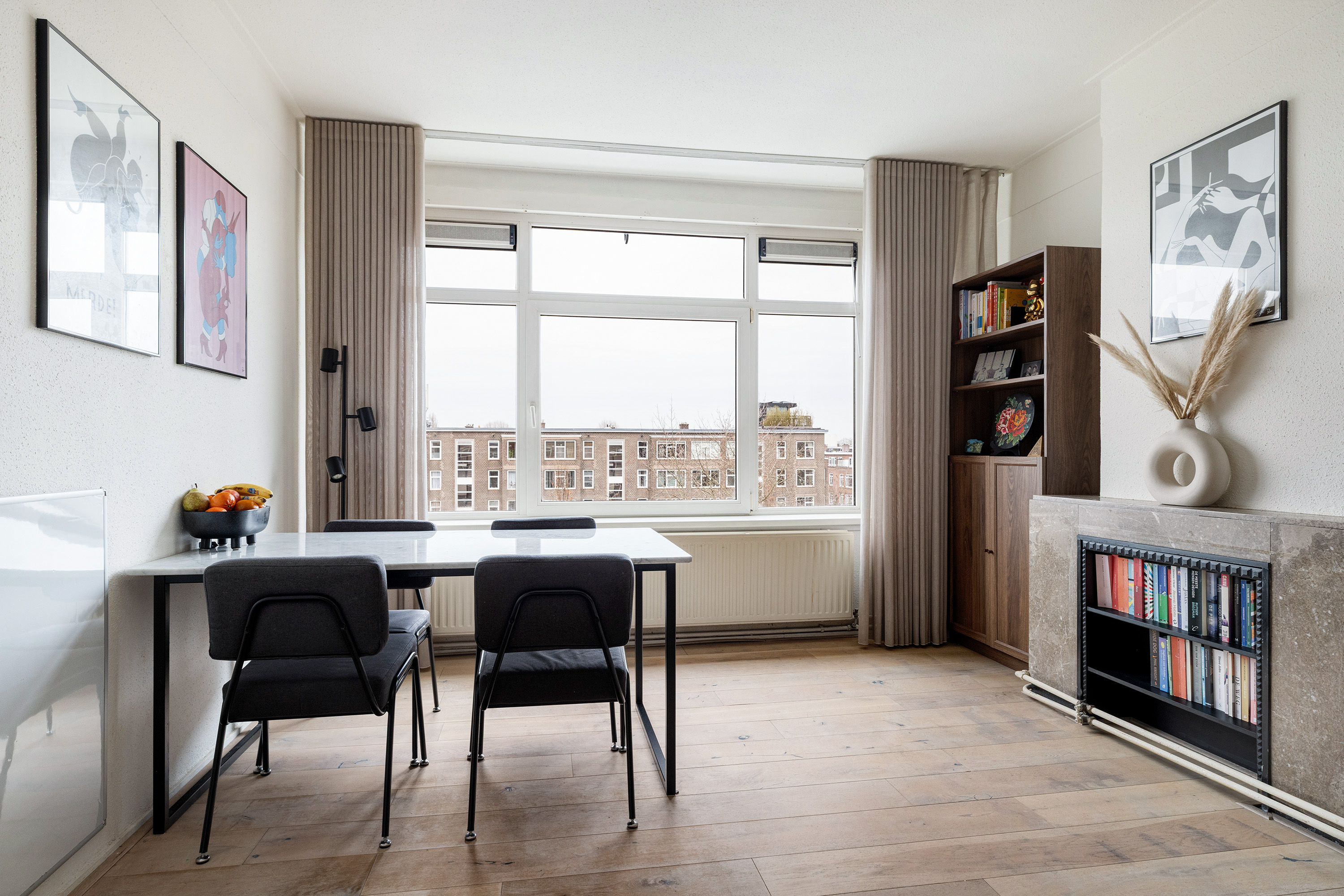 De woonkamer aan de voorzijde is heerlijk licht dankzij de grote raampartijen en biedt voldoende ruimte voor zowel een comfortabele zithoek als een royale eethoek. De hoge plafonds (ca. 2,67 m) versterken het gevoel van ruimte en zorgen voor een prettige, open sfeer. Vanuit de woonkamer kijkt u uit over de brede en groene Statenweg.