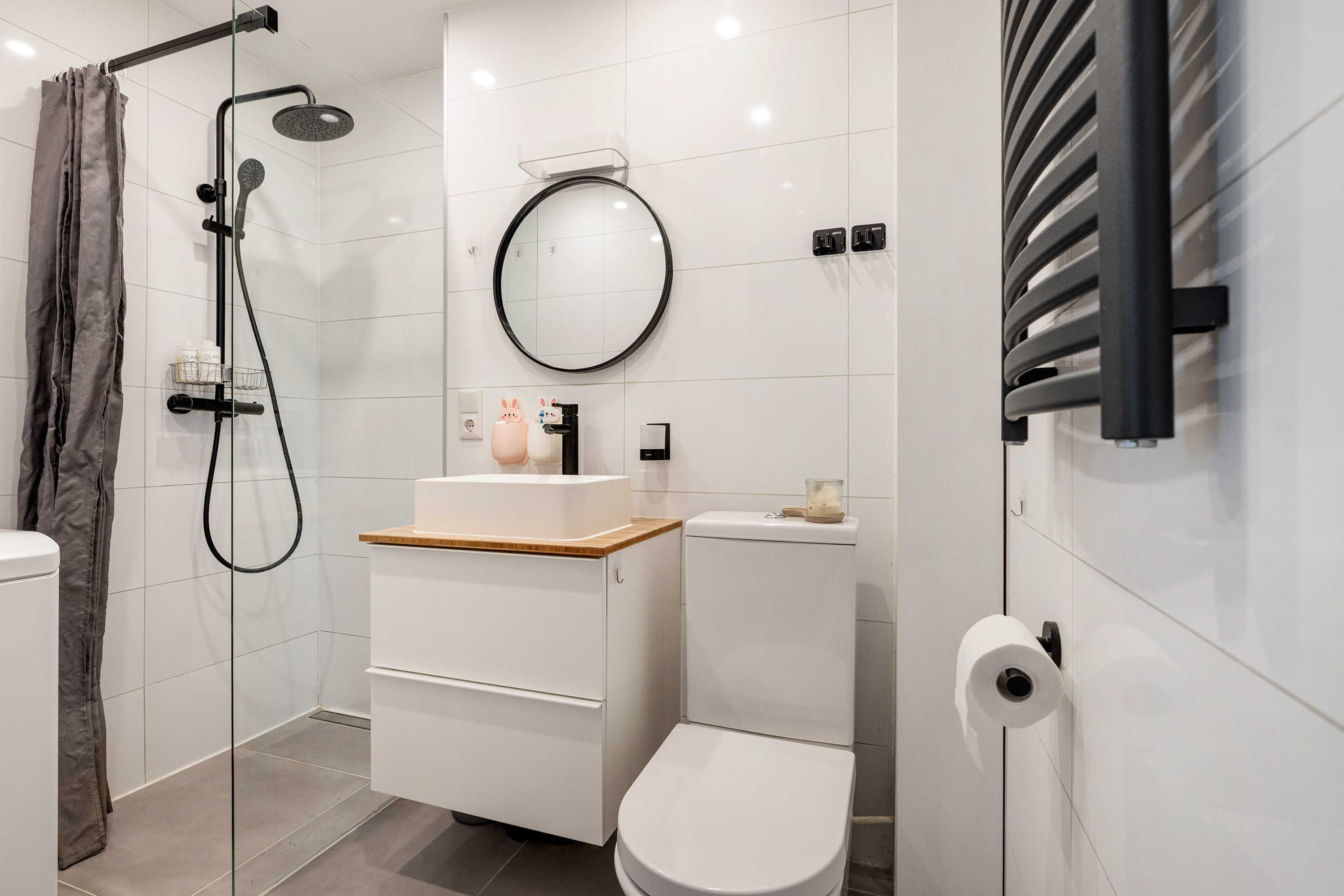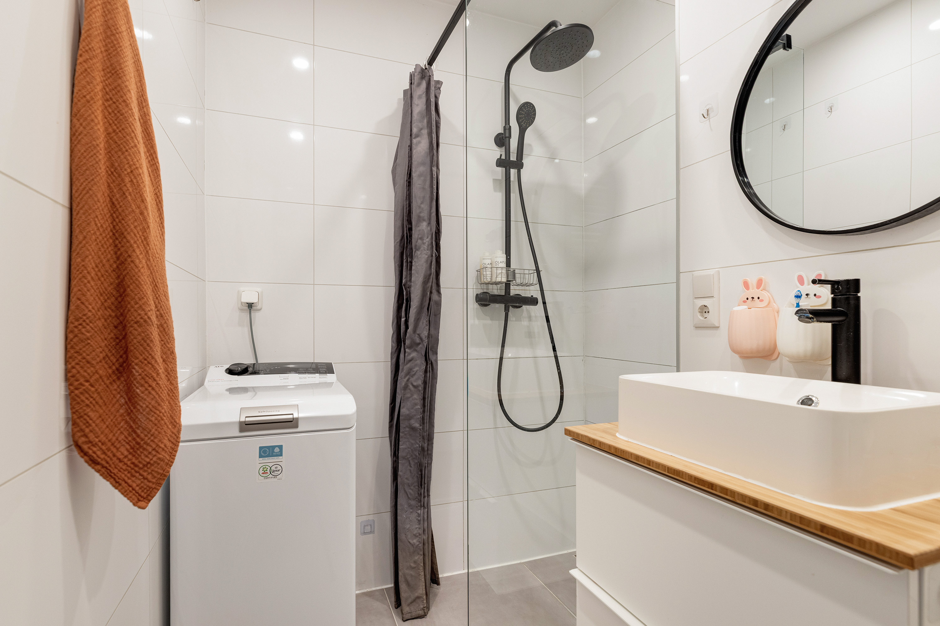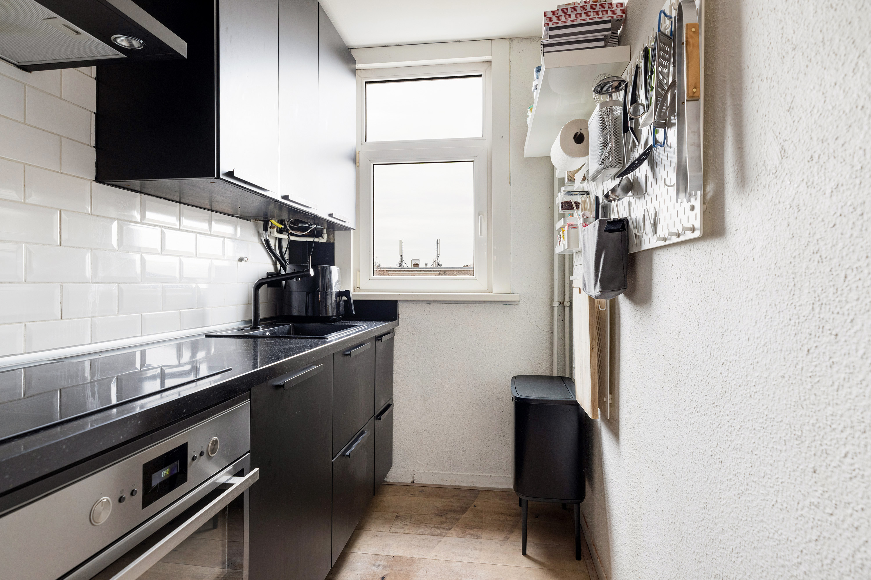 De keuken is praktisch ingericht en eveneens gesitueerd aan de achterzijde. De badkamer is compact en functioneel, voorzien van douche, toilet en wastafel.
