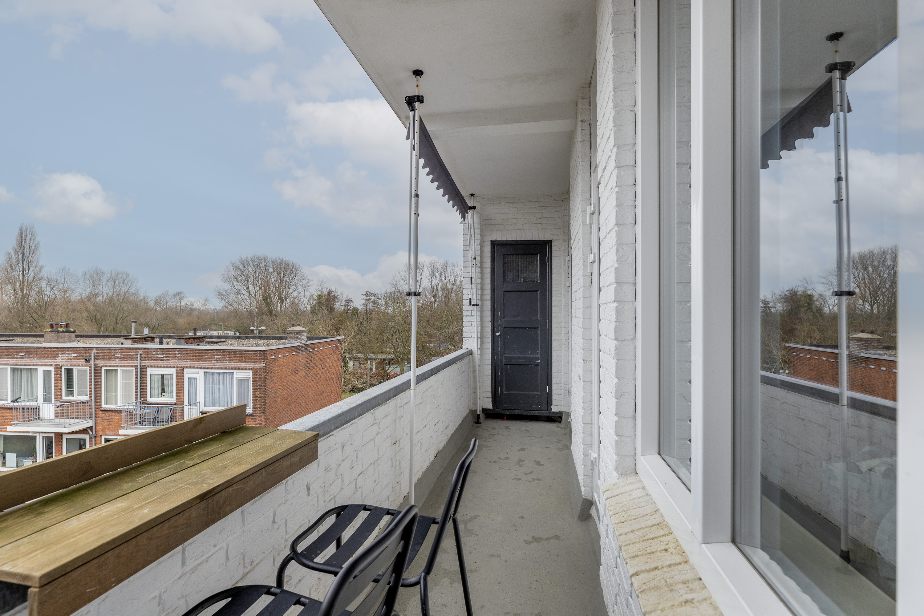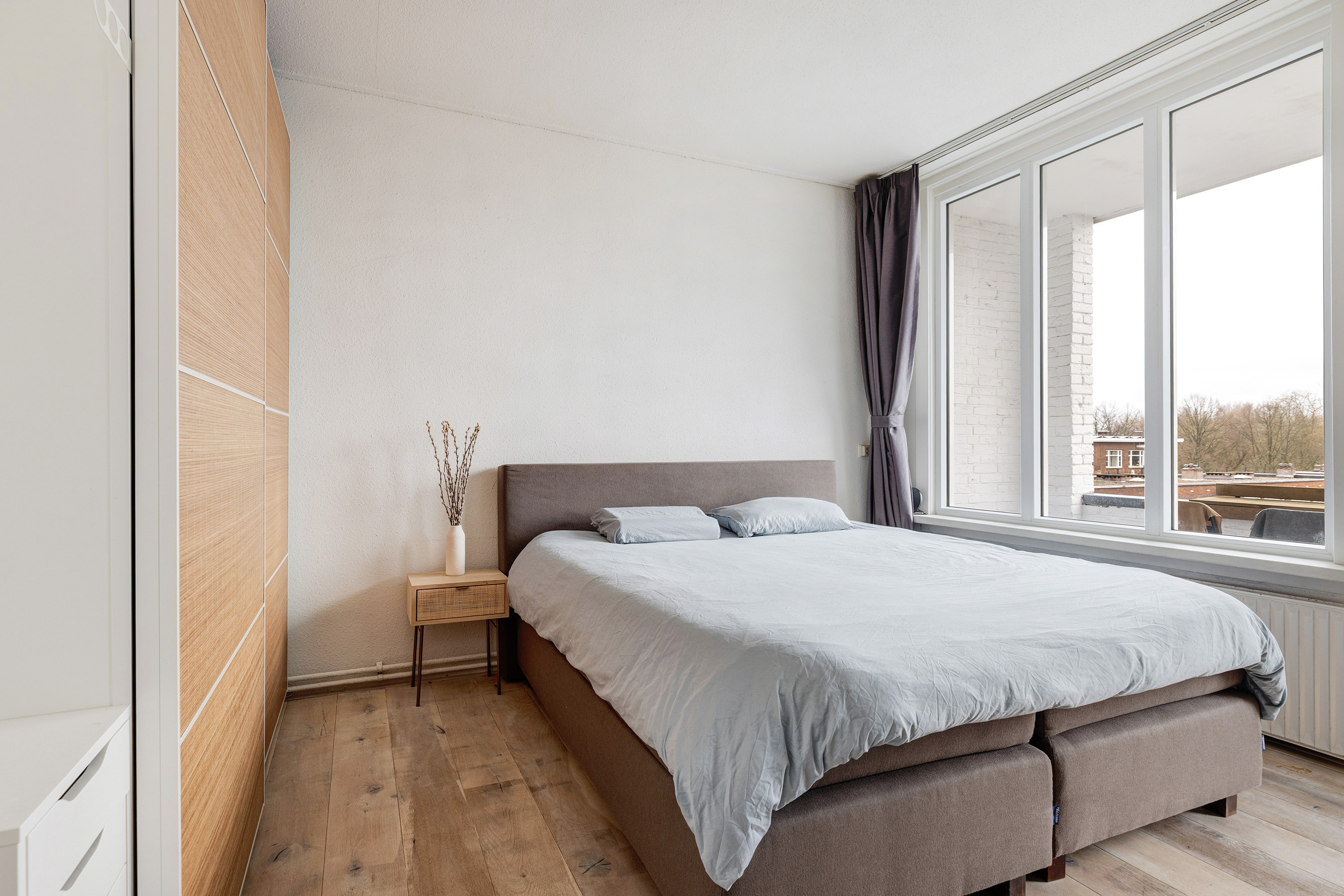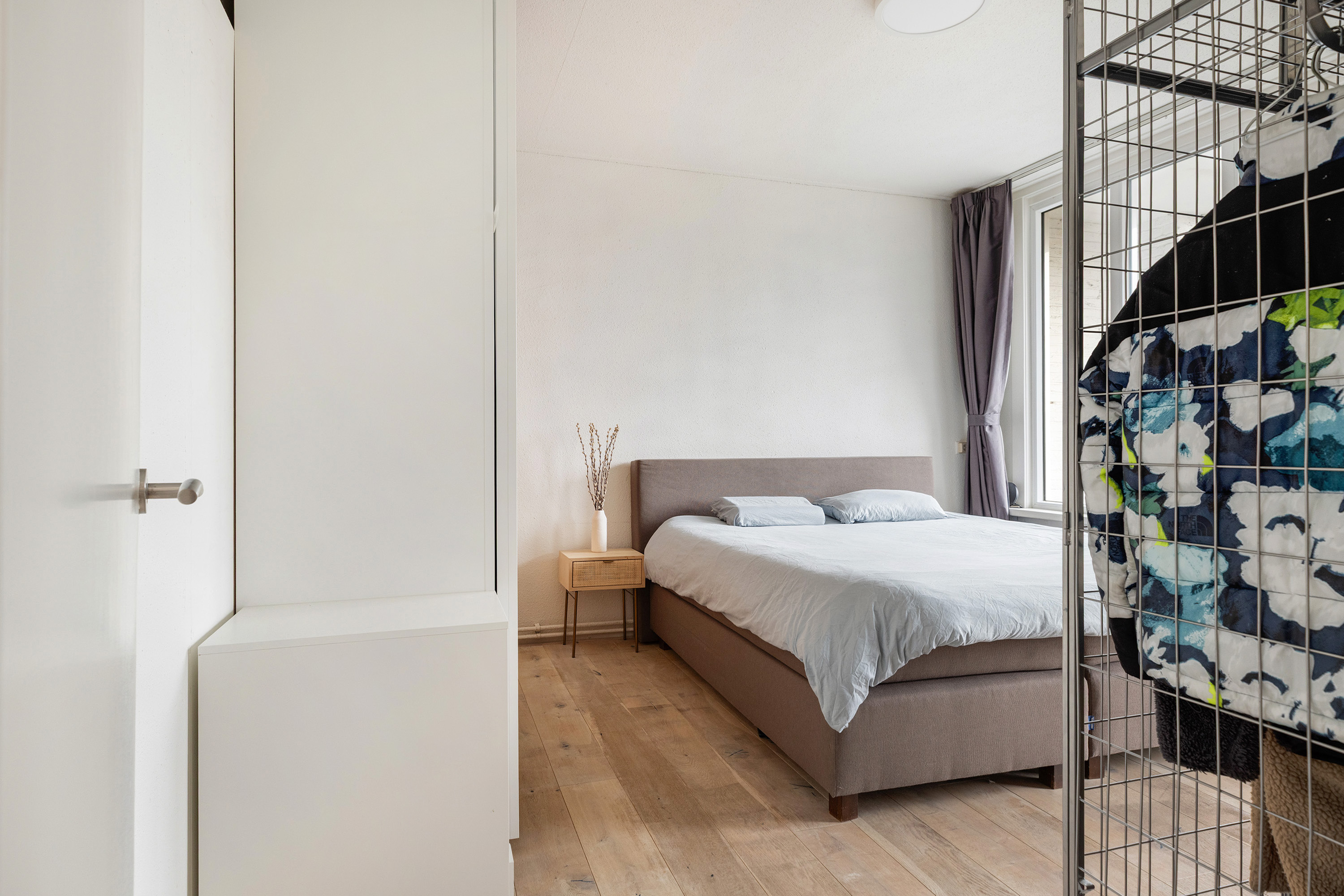 Aan de achterzijde bevinden zich twee slaapkamers. De ruime hoofdslaapkamer biedt directe toegang tot het balkon – een fijne plek om in alle rust van de buitenlucht te genieten. De tweede slaapkamer is ideaal als werk-, kinder- of logeerkamer.