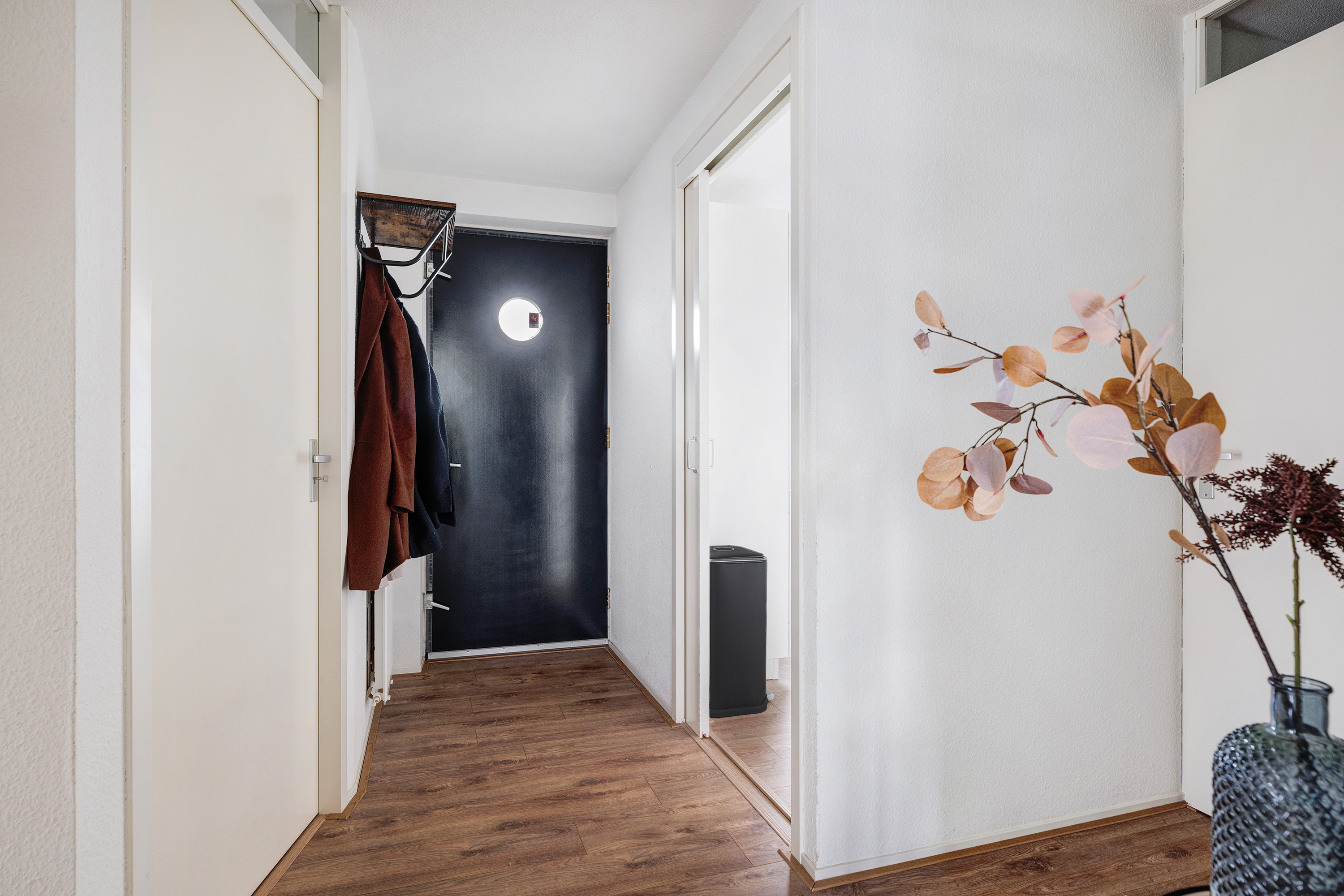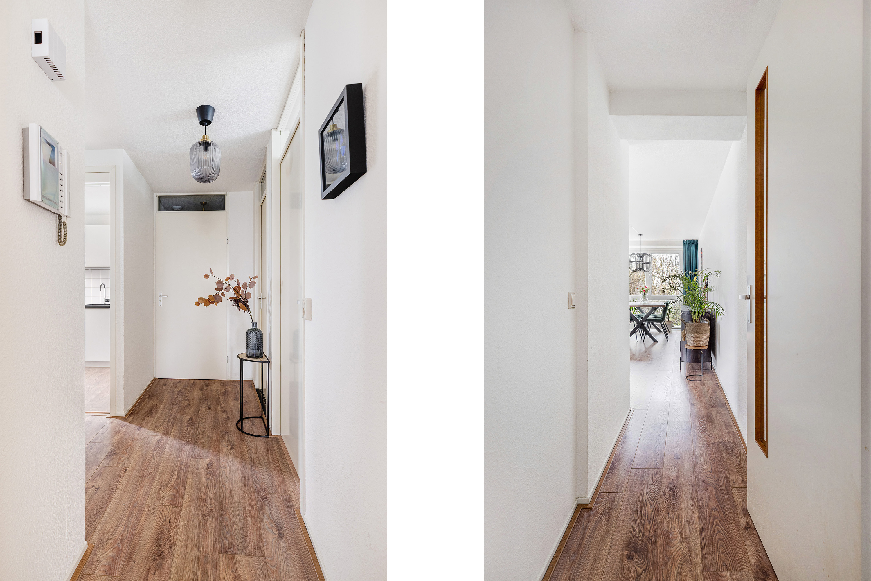 Via de entree komt u in de hal, die toegang biedt tot alle vertrekken. Aan de linkerzijde bevindt zich de keuken, die in 2021 volledig is vernieuwd en is uitgerust met moderne inbouwapparatuur. Aan de rechterzijde ligt de eerste slaapkamer, gelegen aan de galerijzijde.