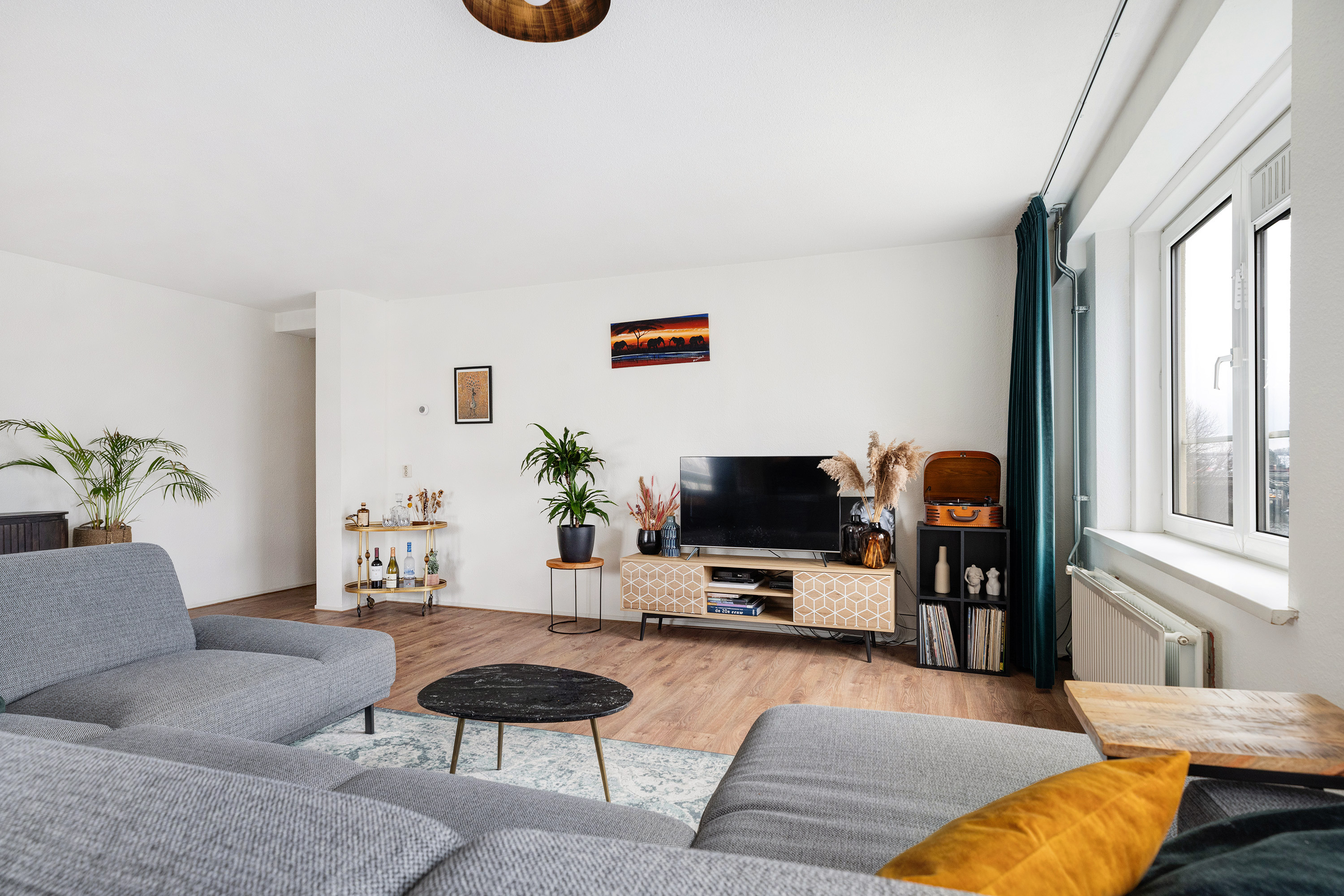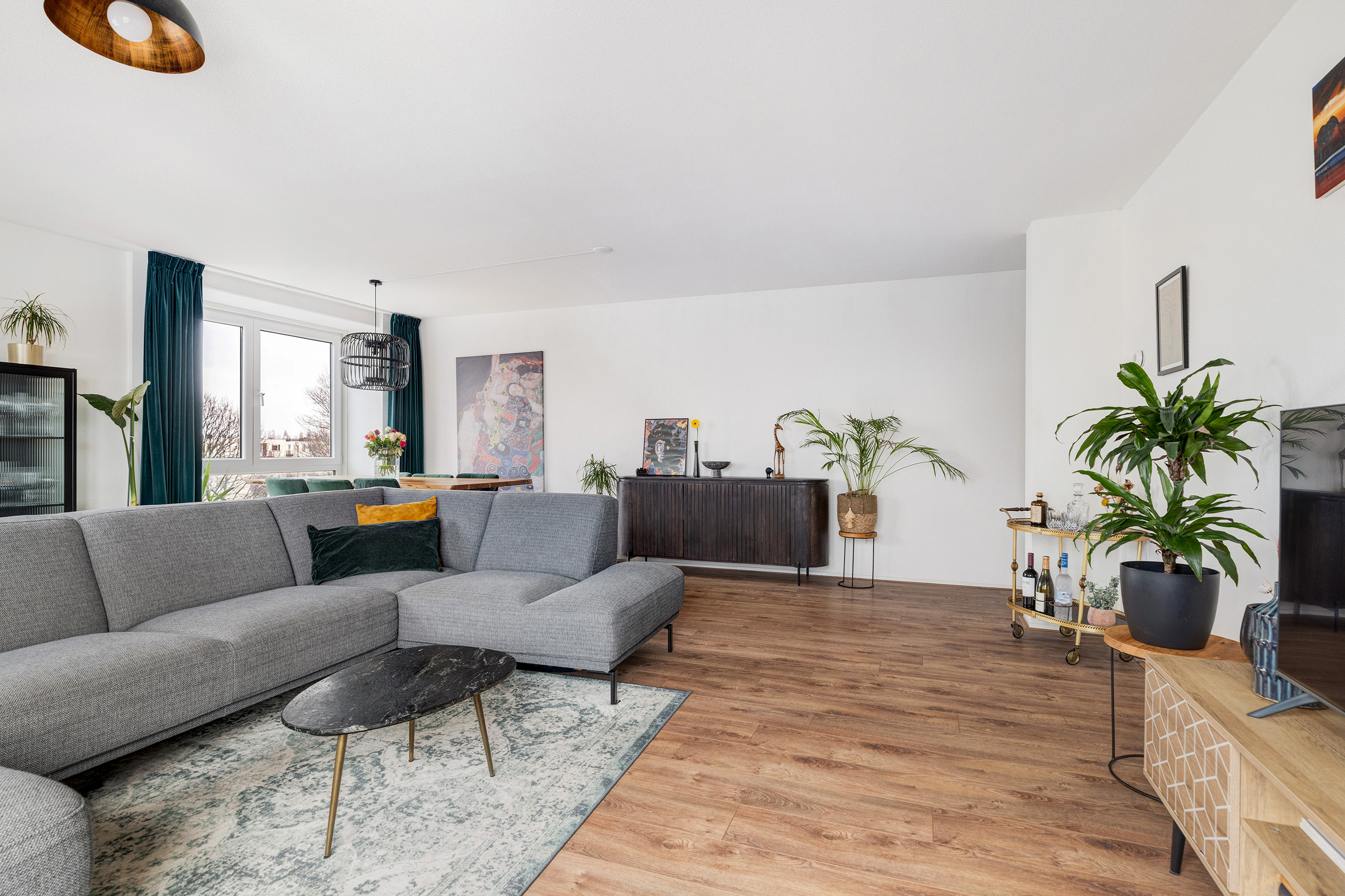 Vanuit de hal heeft u tevens toegang tot het toilet, de badkamer en de woonkamer. De ruime woonkamer vormt een heerlijke leefruimte en kenmerkt zich door grote raampartijen aan meerdere zijden. Hierdoor valt het daglicht rijkelijk binnen en heeft u vanuit verschillende hoeken zicht op de mooie omgeving. Het uitzicht over de Schie is werkelijk een lust voor het oog: een levendig, maar tegelijkertijd rustgevend decor.